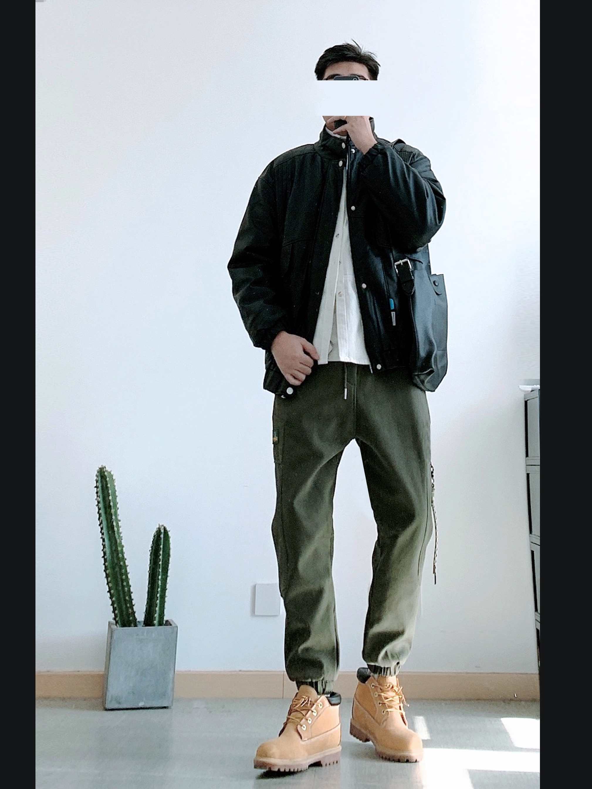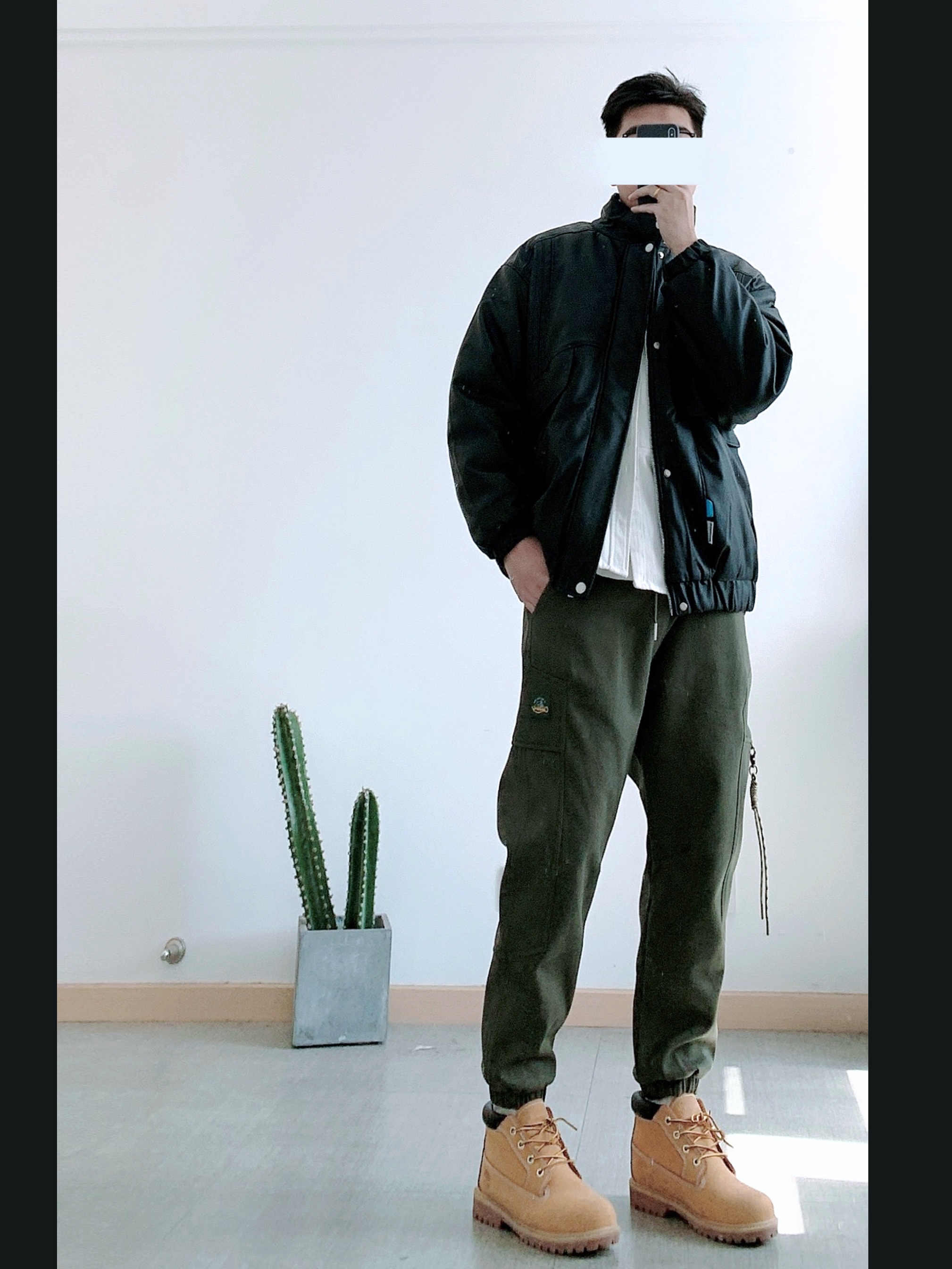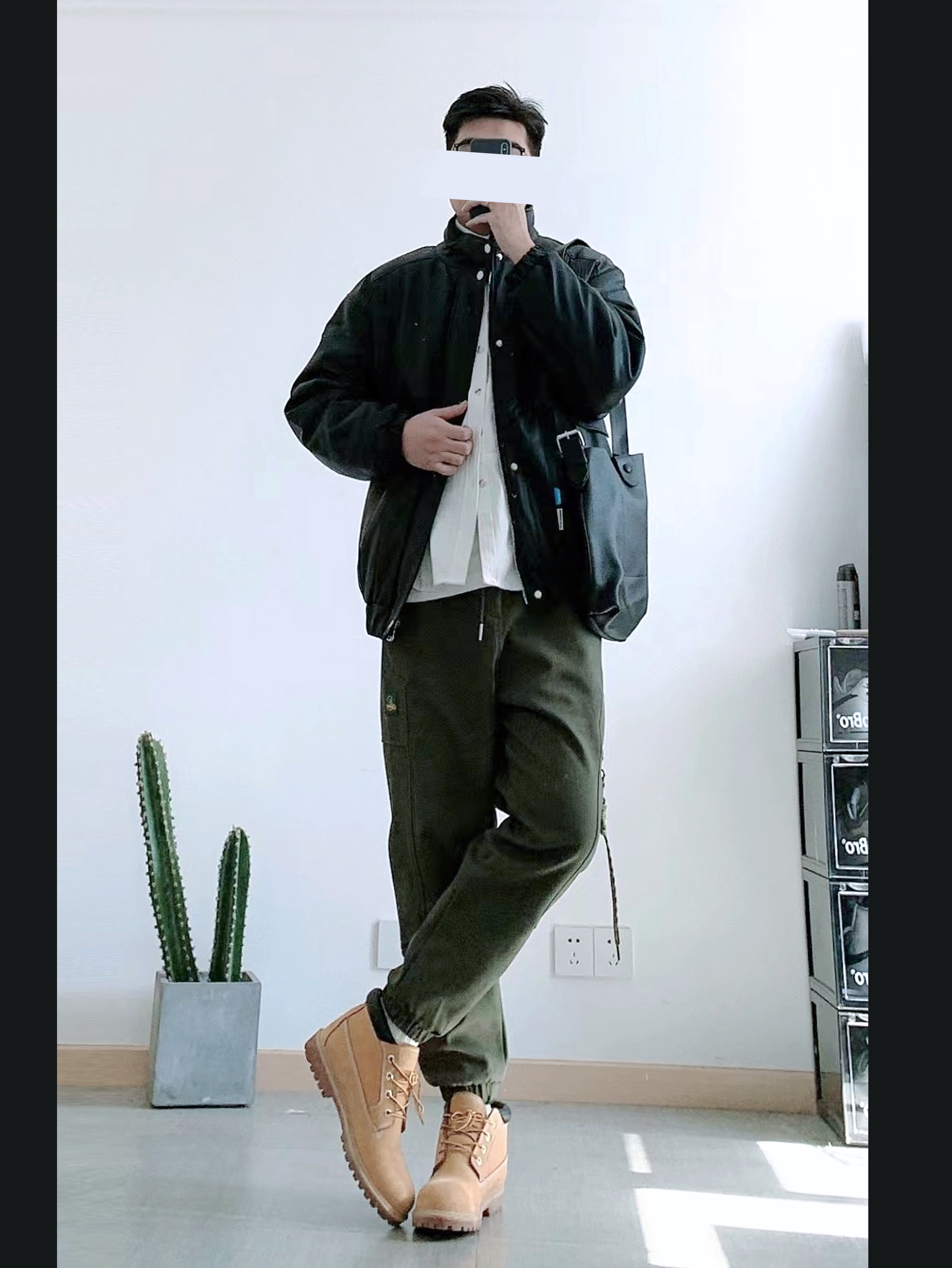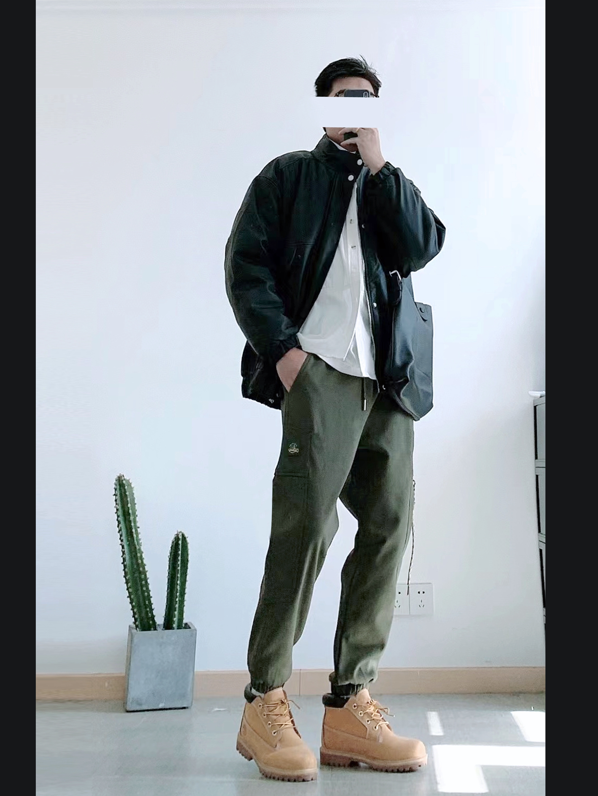 今日Look分享: 👔上身帅气低调的皮衣夹克棉服 复古范儿十足、也很有硬汉的感觉! 搭配油头或者机车都很帅💯 👖下身穿着军绿色工装束脚裤 裤型立挺,精神干练不拖沓的感觉! 👟鞋子选择耐磨耐穿的大黄靴 整体颜色不沉闷、有活力的同时🙋🏻♂️ 又彰显一丝成熟痞帅的气质!