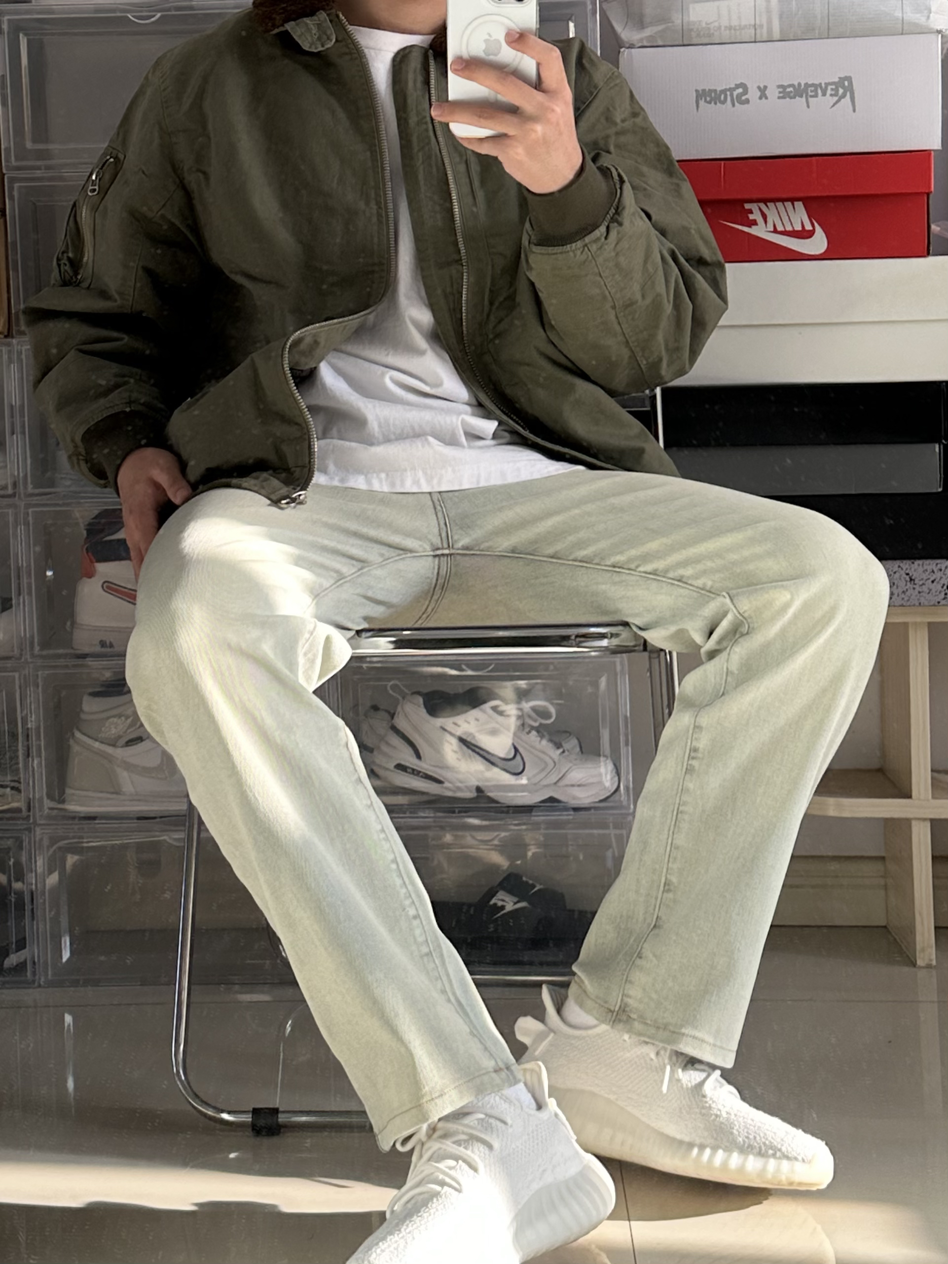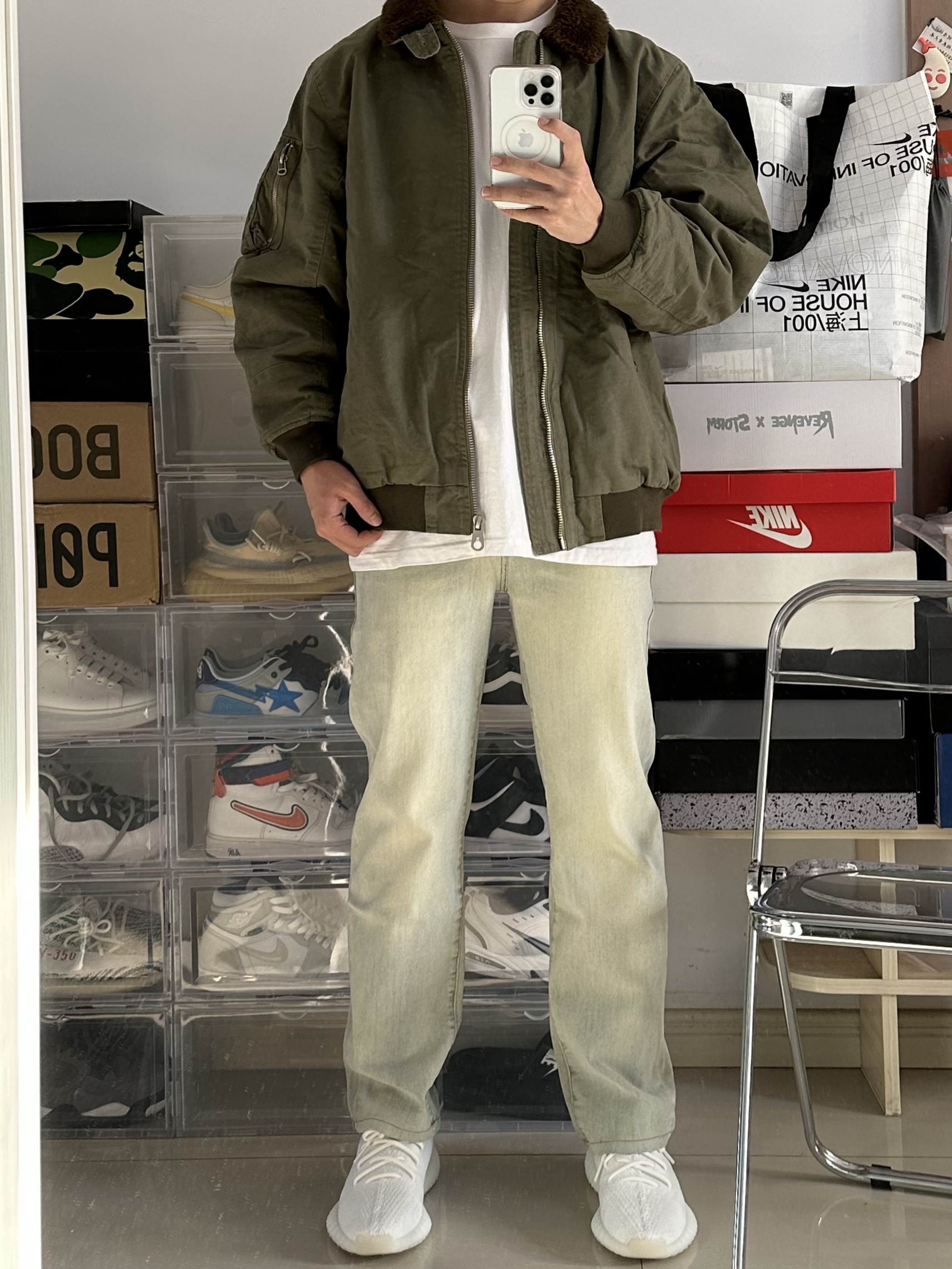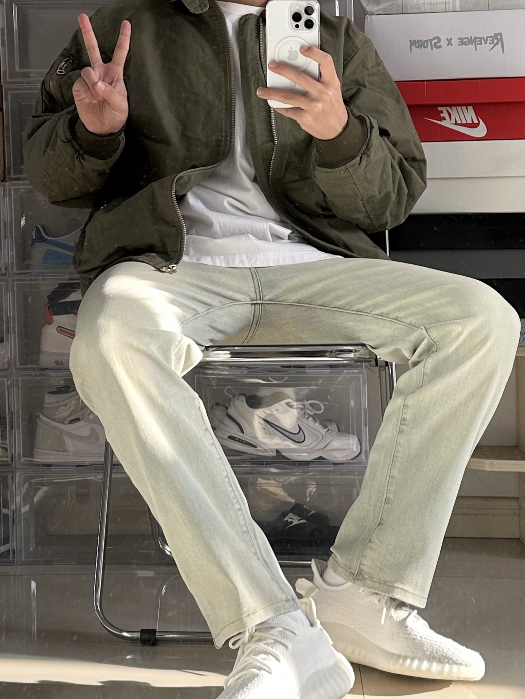 绿色外套配黄泥色牛仔裤 很好看的一身