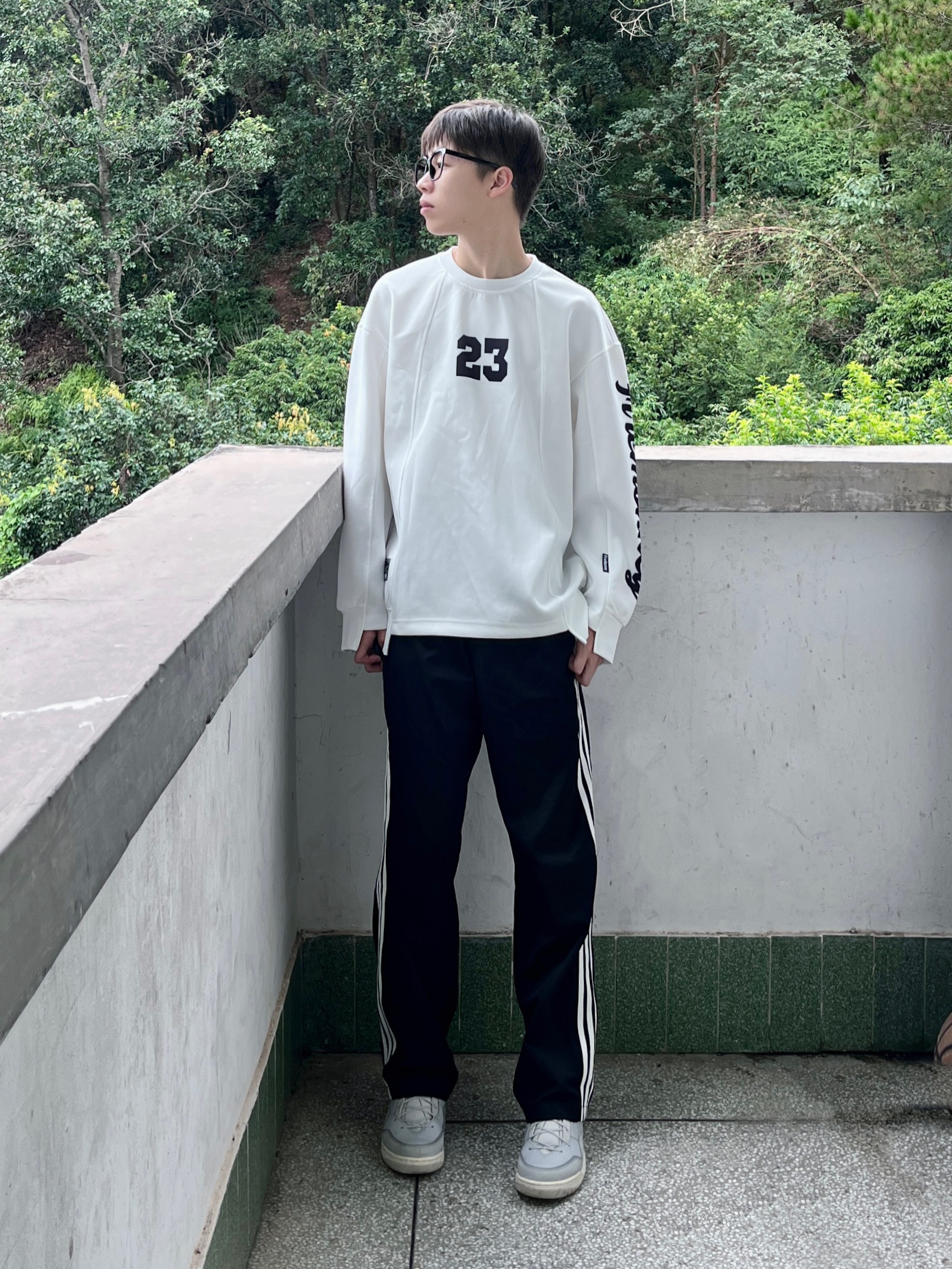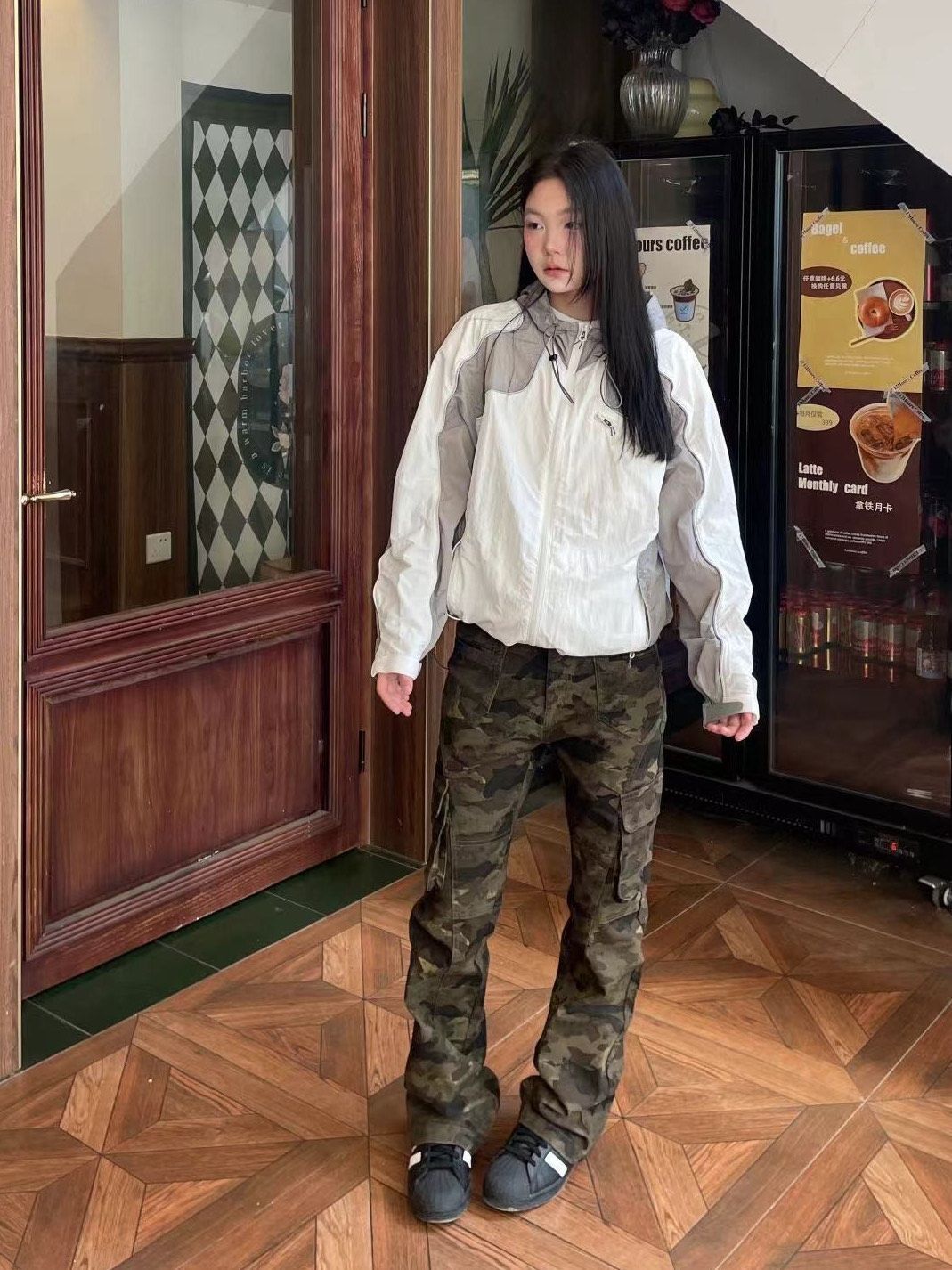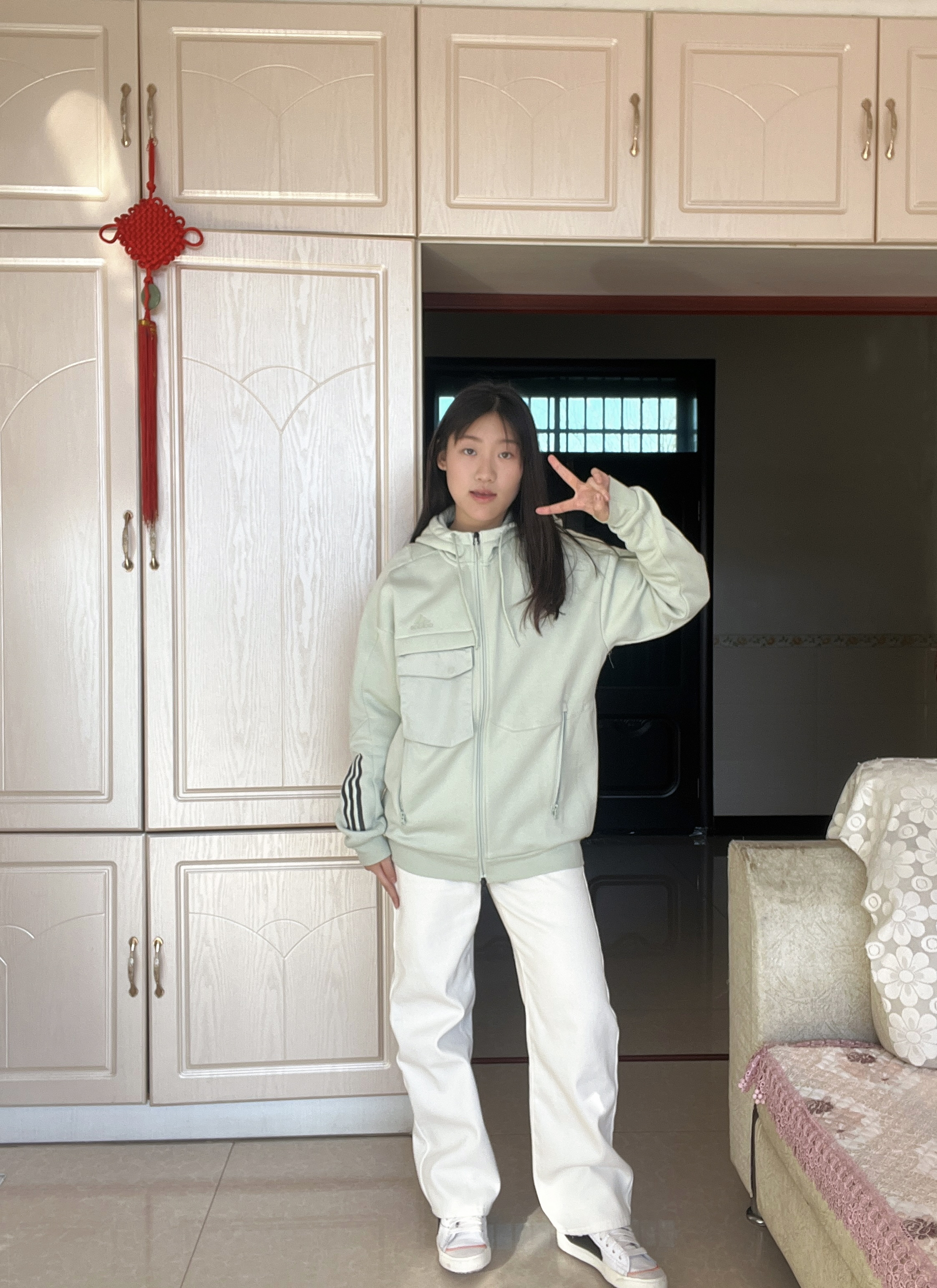绿色外套配黄泥色牛仔裤 很好看的一身