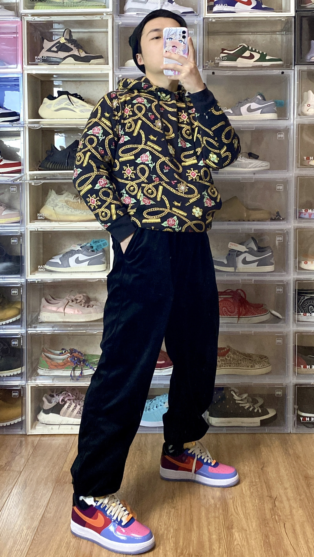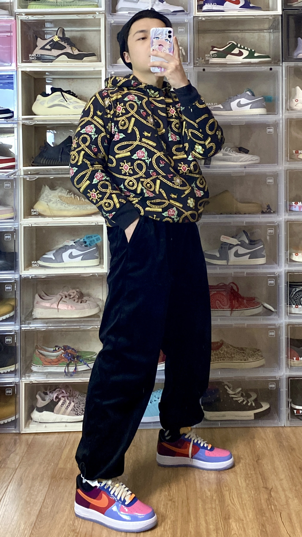 👴170 60 卫衣👔 Stussy chain hoodie 斯图西金链帽衫 201几年的卫衣了 黑色打底 印上金链+花卉+Stussy小logo 街头感十足 裤子👖 Boneless 不得不说有些国潮做的真挺好 美潮的裤子贵不说 还不好穿 这条丝绒束脚裤 裤脚可松可紧 上身坠感十足 鞋👟 Undefeated x Nike Air Force 1 讲真 第一次接触美潮的时候 觉得Und...
