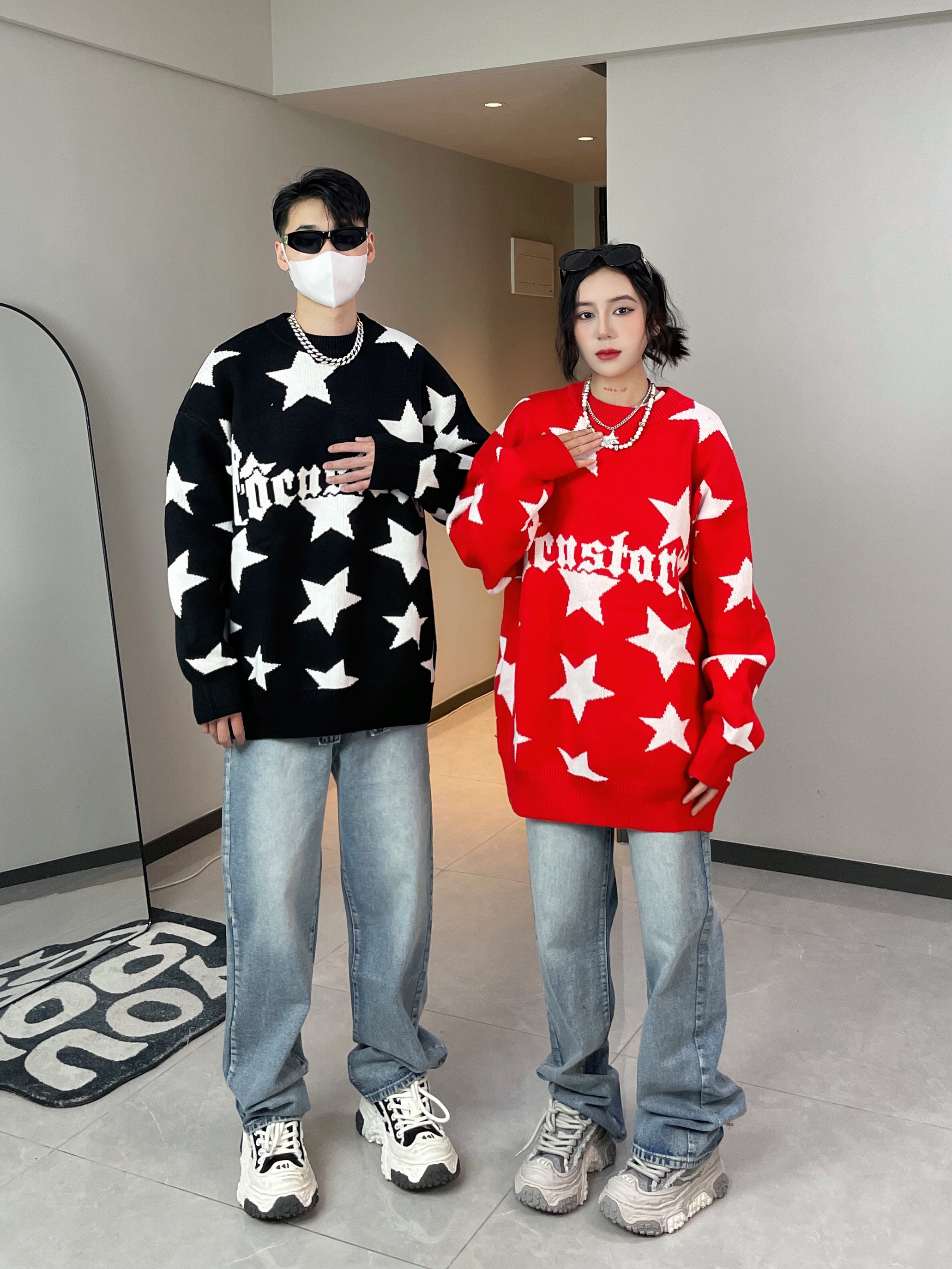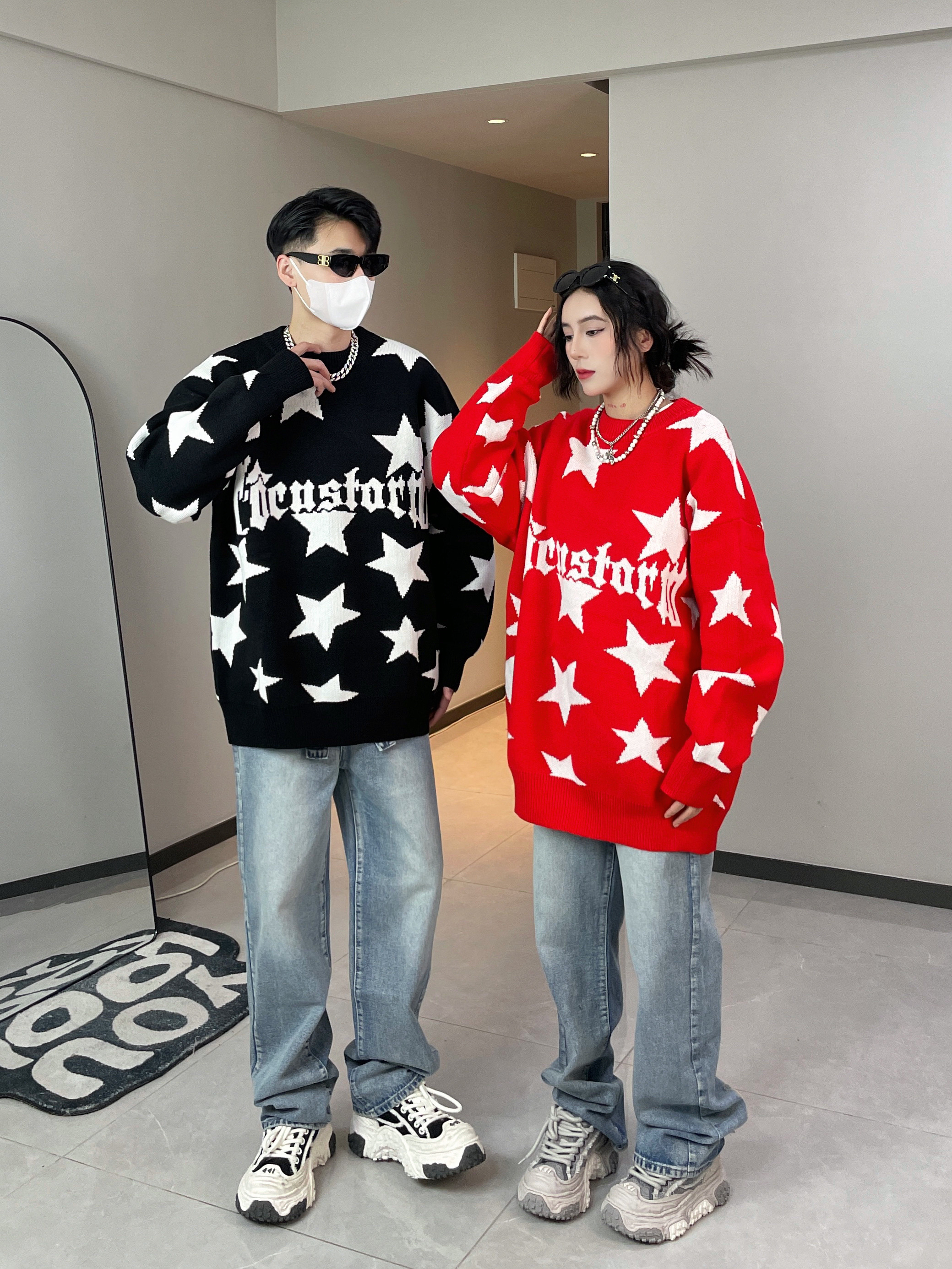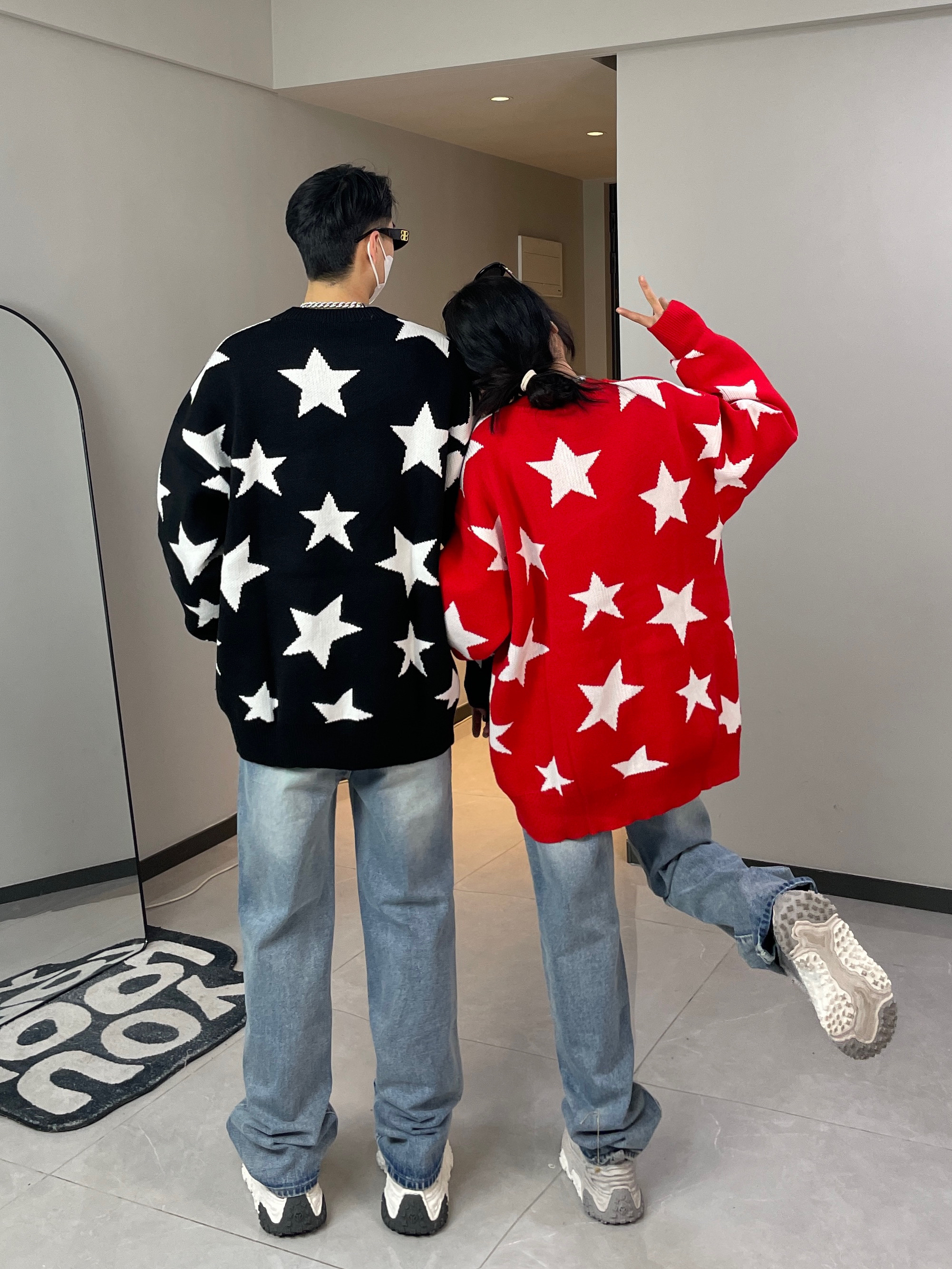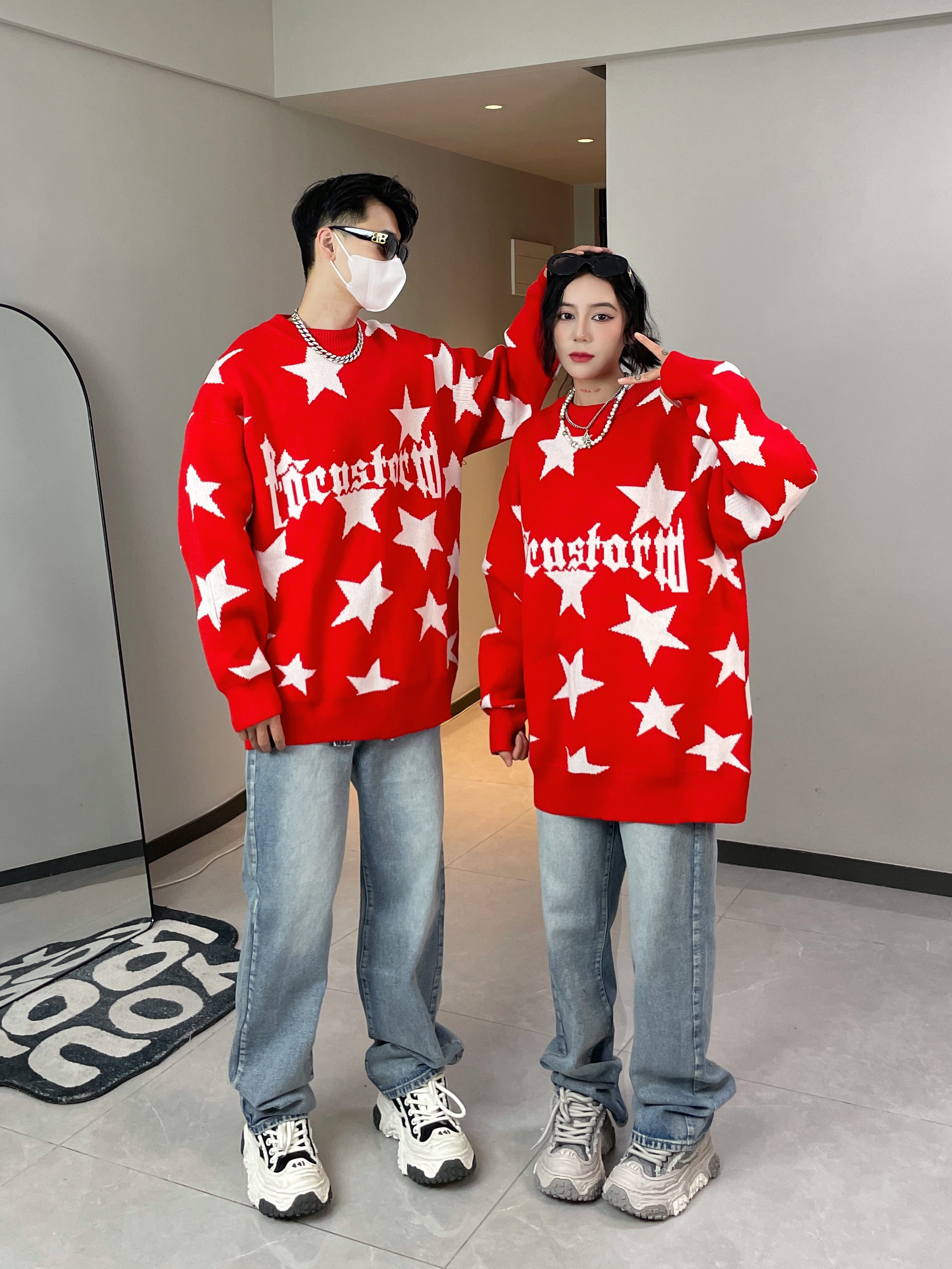 红色就是新年的仪式感呐! 星星满印毛衣 宽松版型上身不臃肿 黑色百搭又帅气 红色显白又吸睛 搭配情侣装都好好看哦~ 👔👖:XXXANBUUZU ————