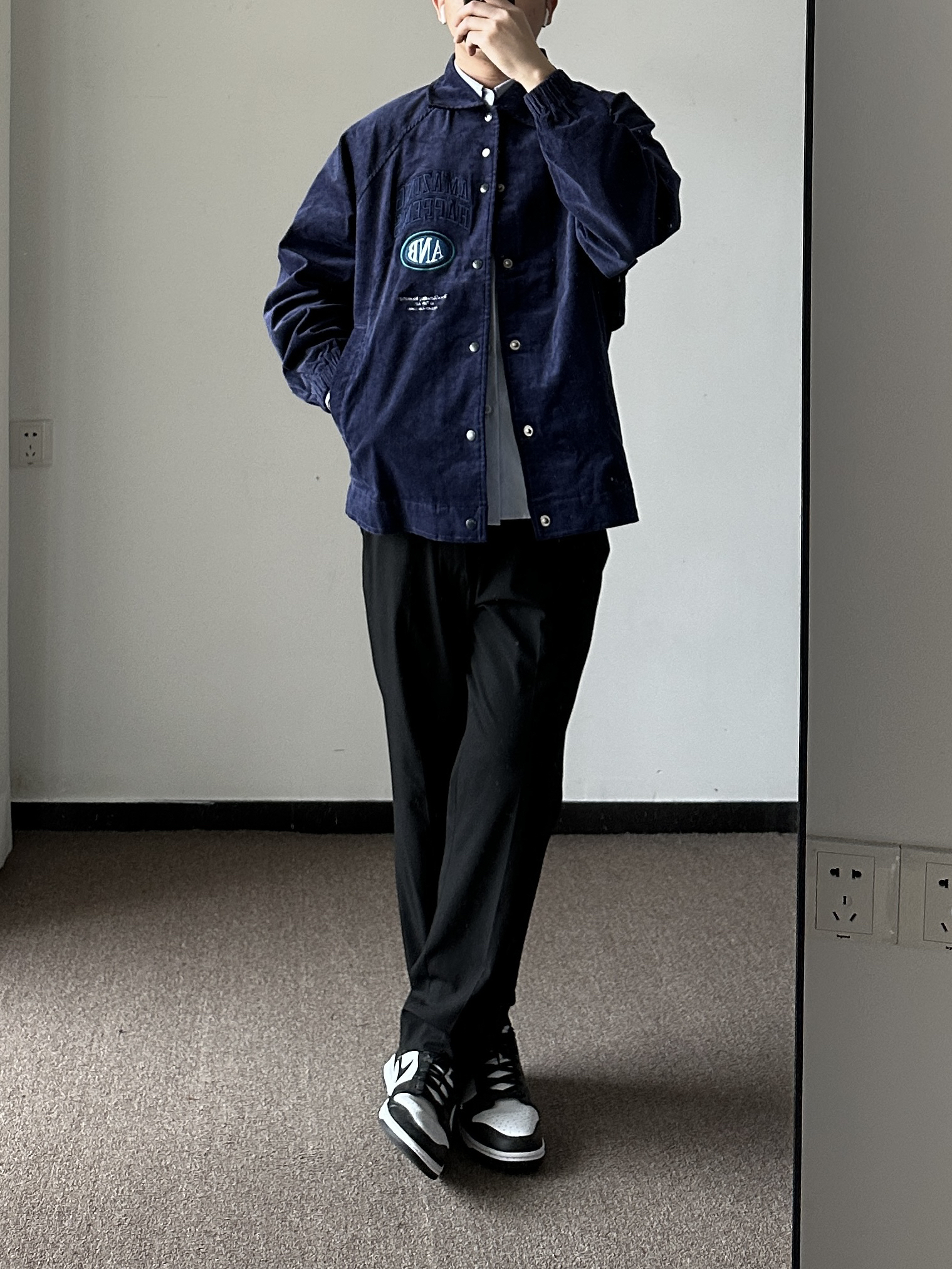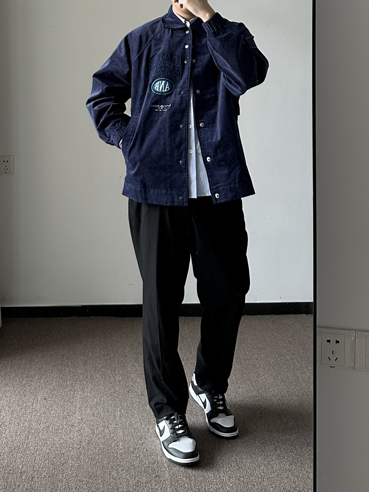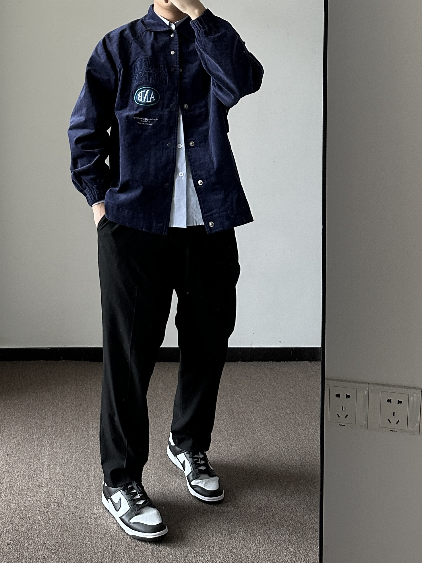 素人也能好看系列~174cm / 65kg 🧥- 藏青色+灯芯绒+夹克版型,直中我红心。吸引我的第一眼绝对是它的胸前刺绣,好好看!后背也有巧思,可拆卸的背贴,上身L~ 👖- 黑色直筒西裤,上身L。 👟- dunk熊猫