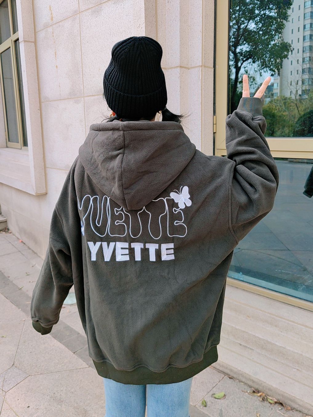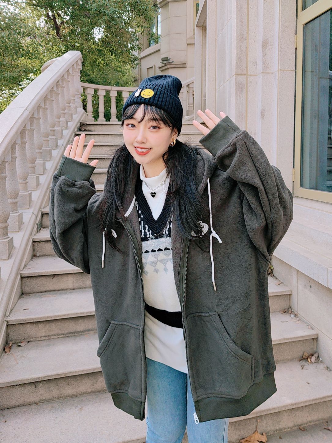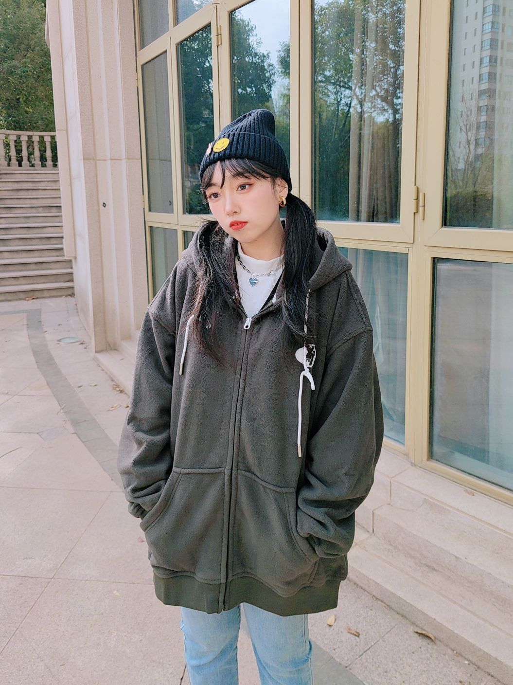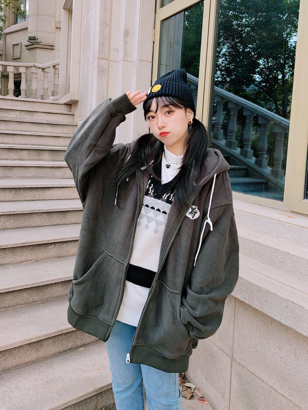 🌞160cm/46kg ↓ 我真的太喜欢今天的穿搭啦, 大大的外套搭配八分长的牛仔裤👖, 显高又显瘦✌🏻还不臃肿! 再扎个双马尾, 嘻嘻😉简直不要太减龄啦~ 开衫外套是薏凡特的, 它家的质量做工我一向很放心哈, 这件还是羊羔绒的料子👌🏻, 穿起来厚实保暖, 背后的蝴蝶🦋和字母刺绣是小亮点哦~ 军绿色比较低调但很显白, 搭配牛仔蓝、黑色、白色都OK, 玩转叠穿也是一把好手, 还不会像纯黑白灰那样单调...