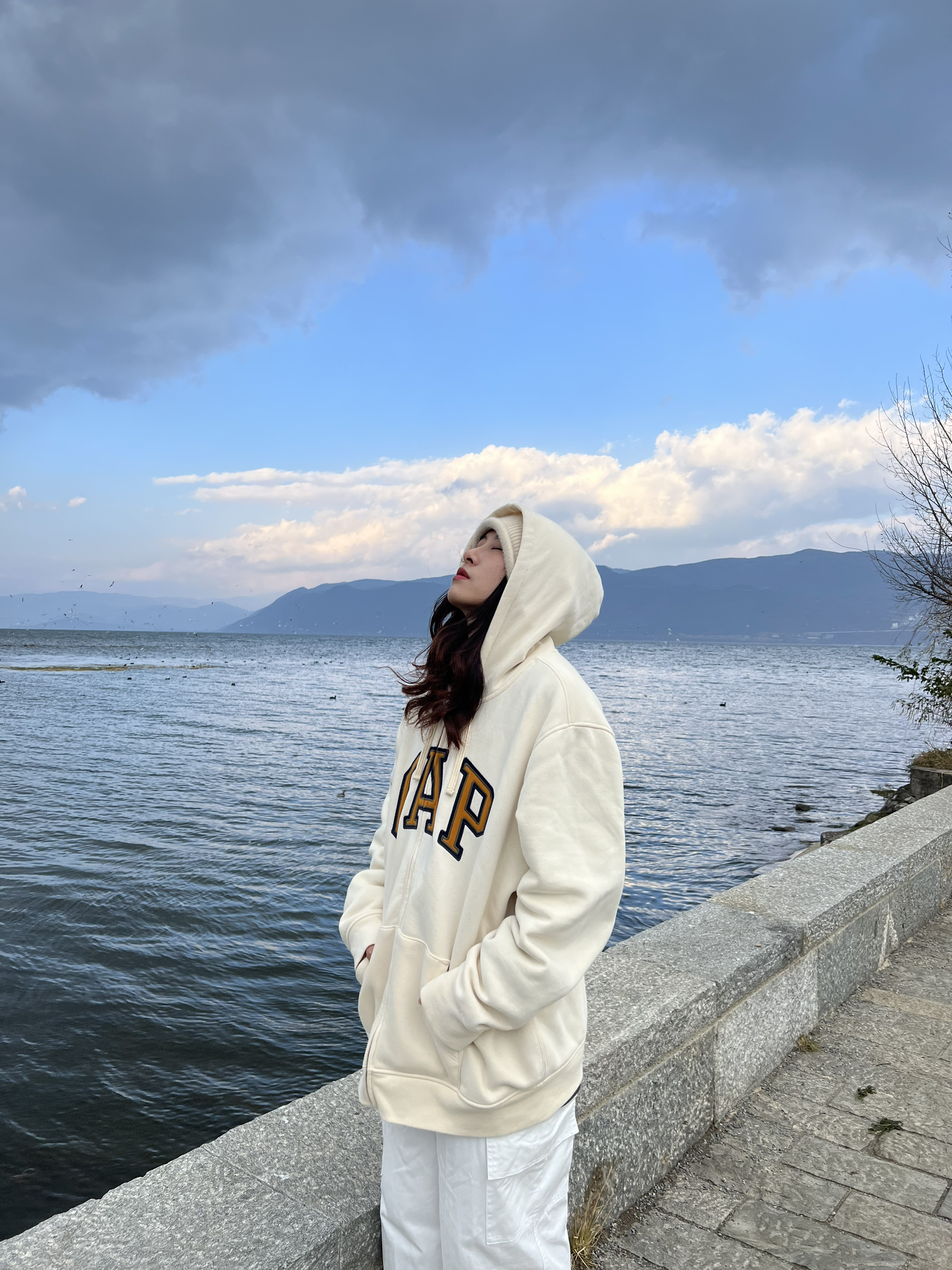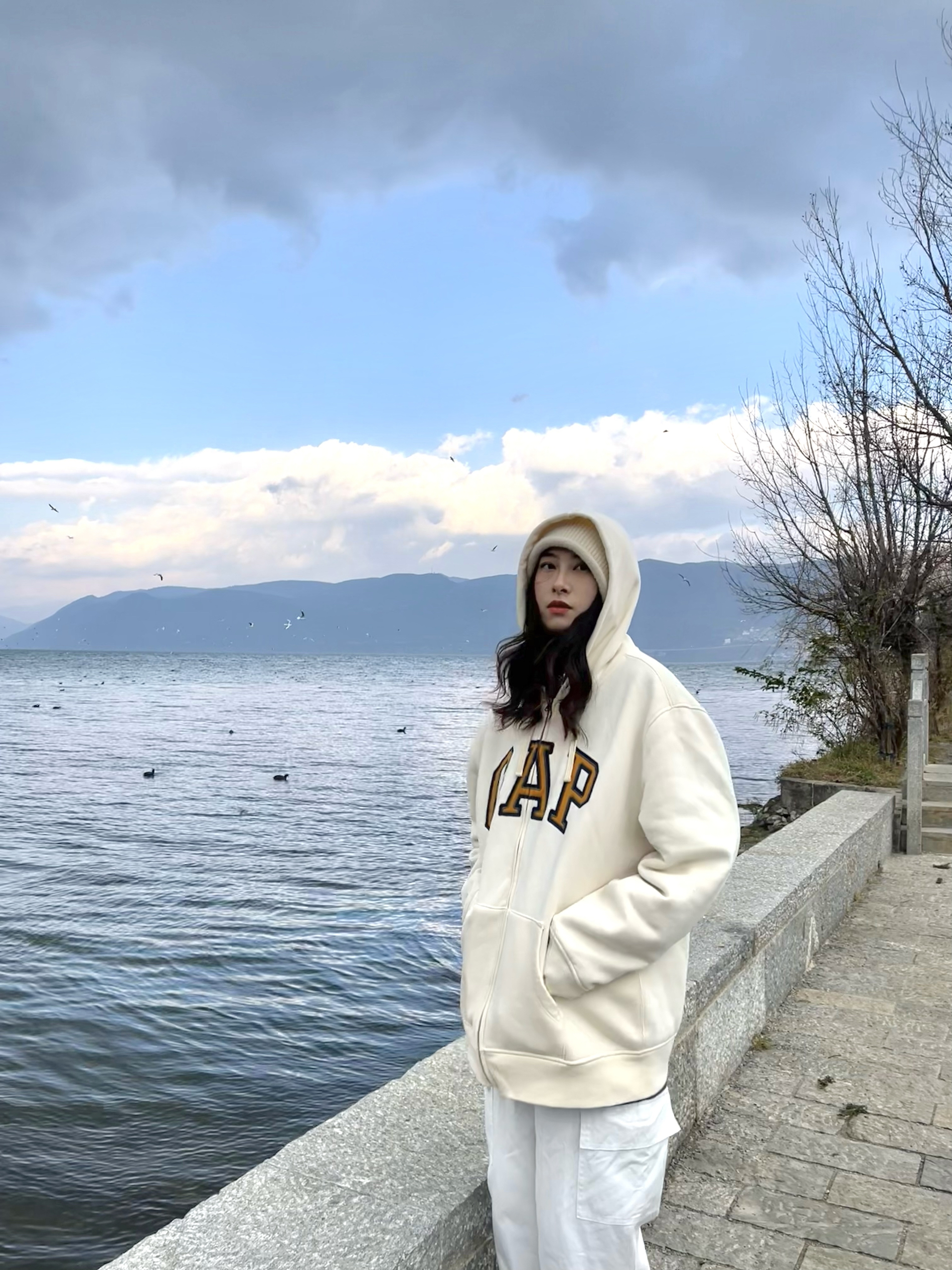 🍑:hi 今日是新年第一篇 旅游中的早春穿搭来啦 休闲的小王回归 gap外套真的百搭 再配上蓝蓝的天空 可以原图直出了 最近的小心机是帽子+帽子叠穿 很有高街风的感觉 大家穿起来吧!