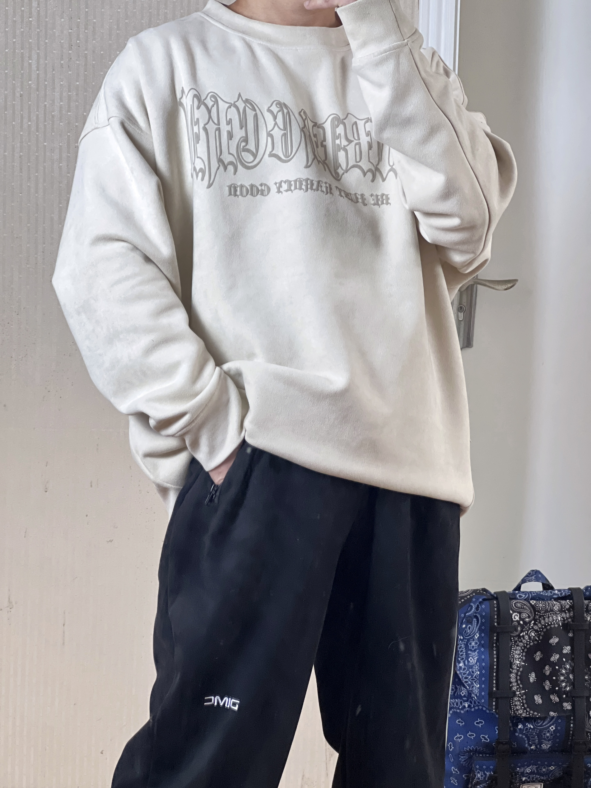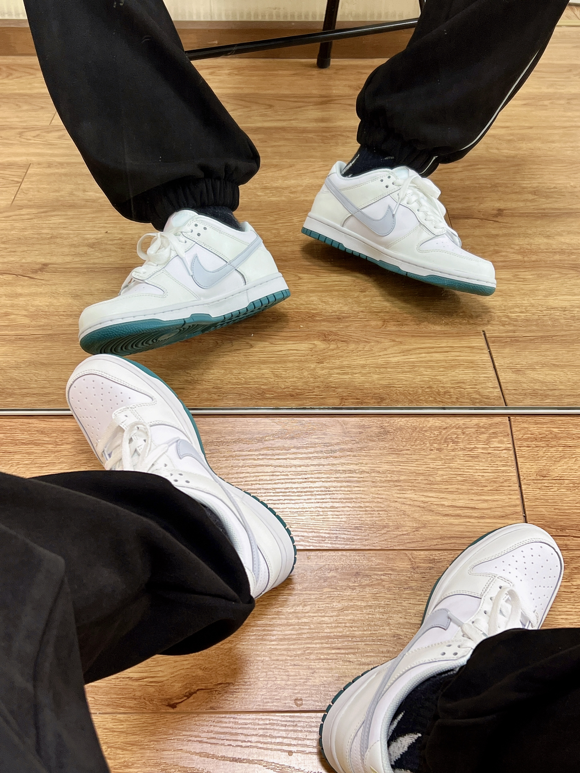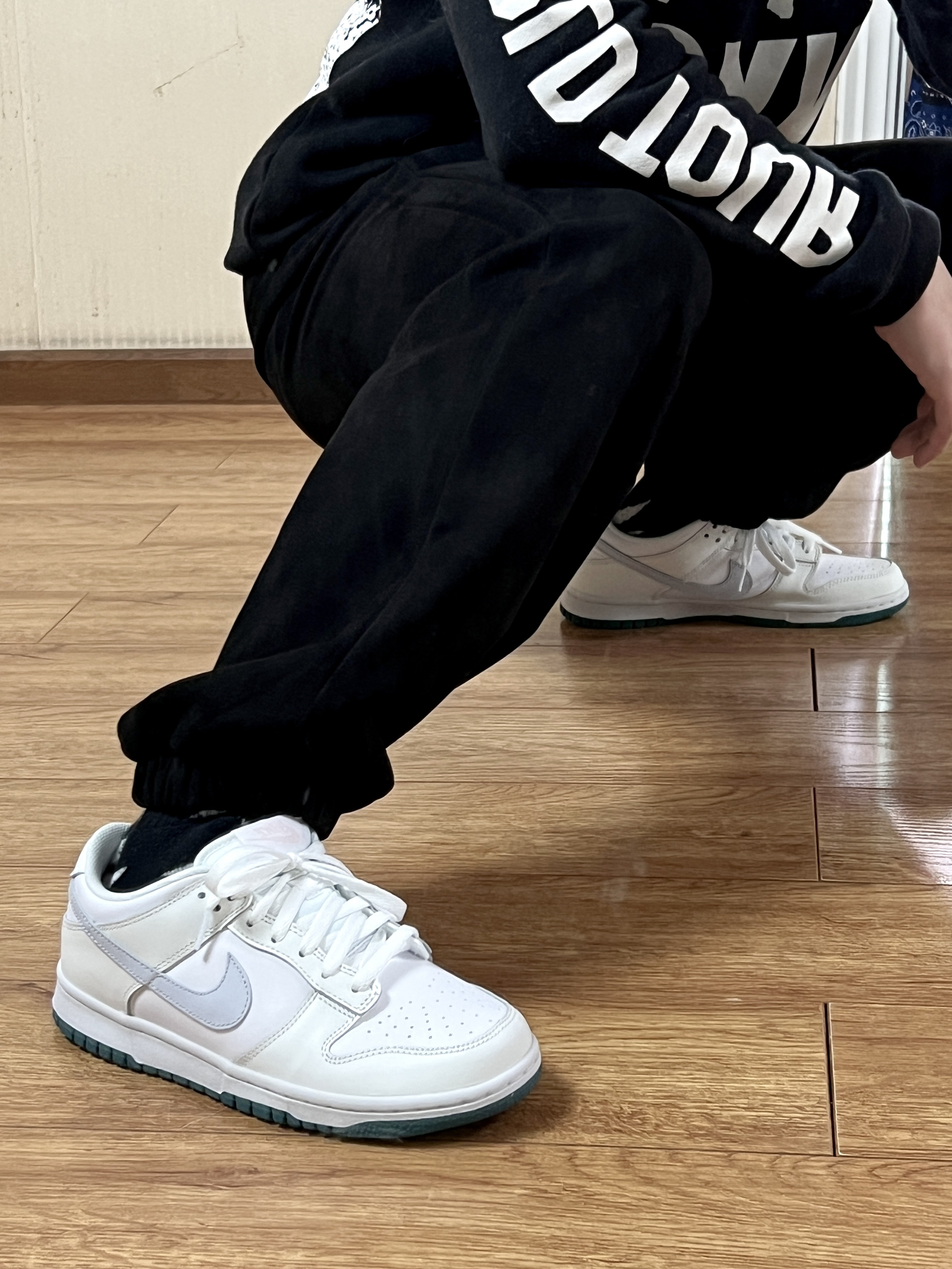 👴170 60 卫衣👔 BJHG 第一次买国潮的东西 对比美潮其实挺香的 裤子👖 DIMC 麂皮束脚裤 麂皮材质很不错 挺有质感 鞋子👟 Nike Dunk low (gs)白绿 小脚40码正好能穿gs 每次都省不少钱啊🤔
