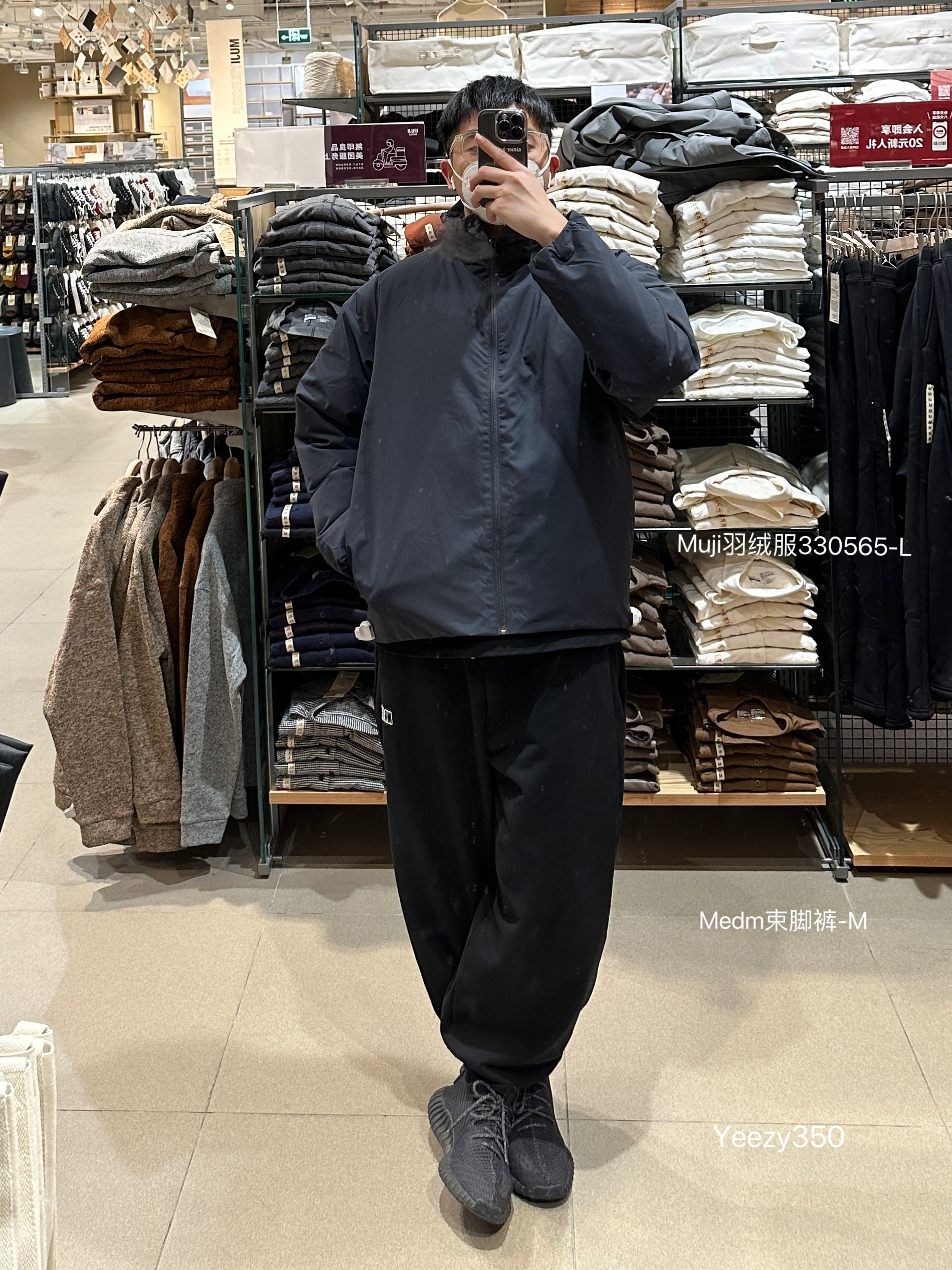 素人也能好看系列~ 174cm/68kg 🧥-极简风还得看MUJI,羽绒外套-330565-藏青色真不挑人。上身的是L,上装显得宽,恰好下装束脚裤比较廓形,整体算和谐的~至于价格,代购500内可以拿下了。 👖-MEDM的廓形束脚裤,口袋小LOGO,版型有点气球裤的意思,不算百搭,但搭起来也足够帅。 👟- 黑武士350,最近看上了NIKE ZOOM VOMERO 5 全黑,那双价格舒适,也很帅。下...