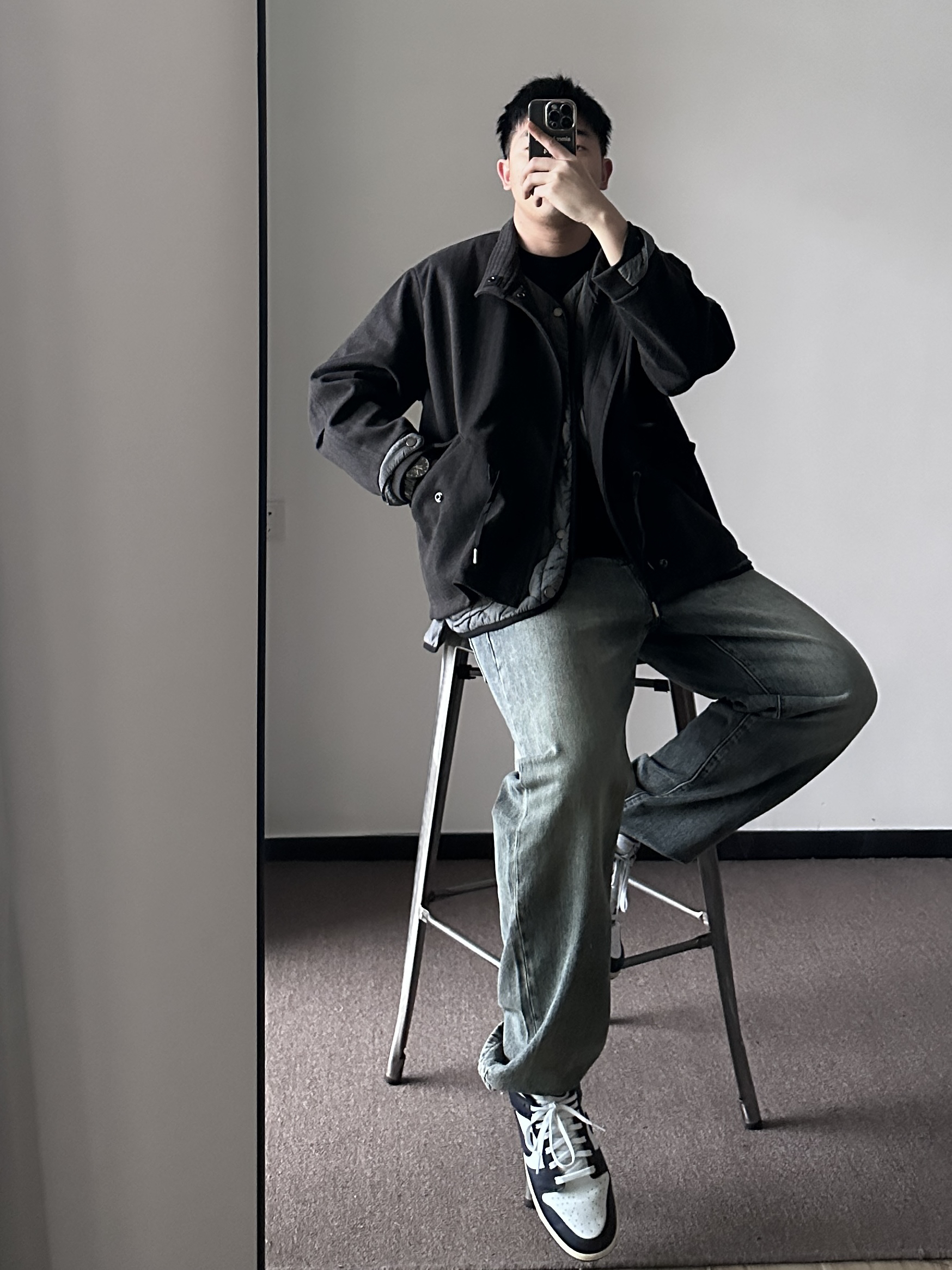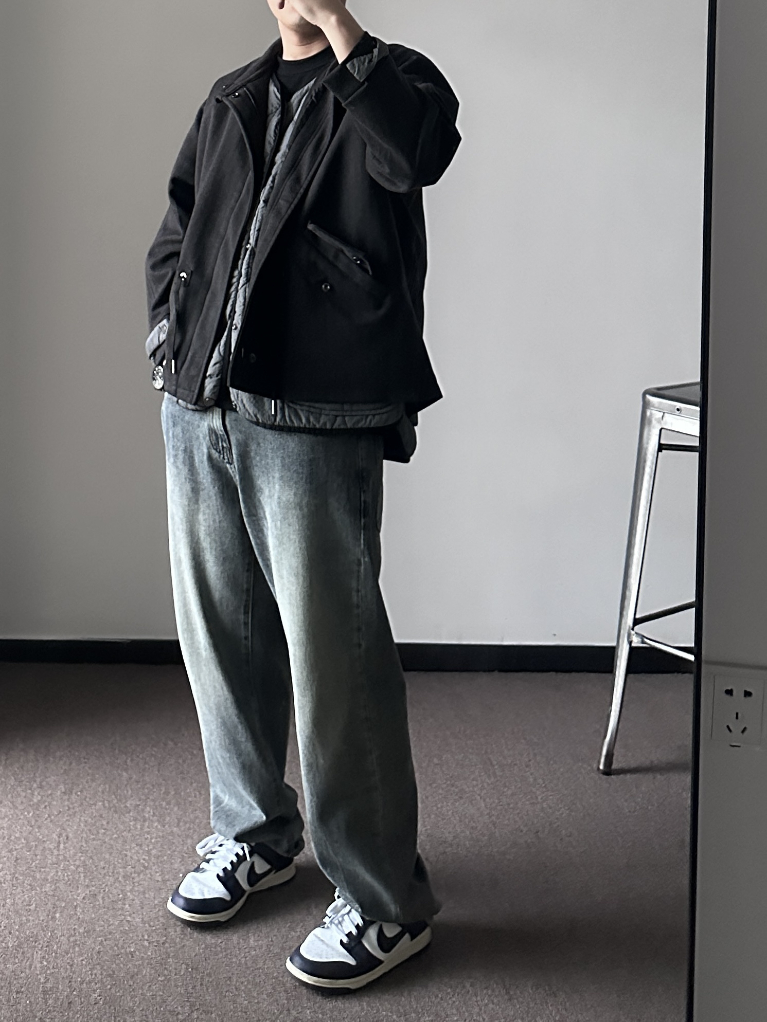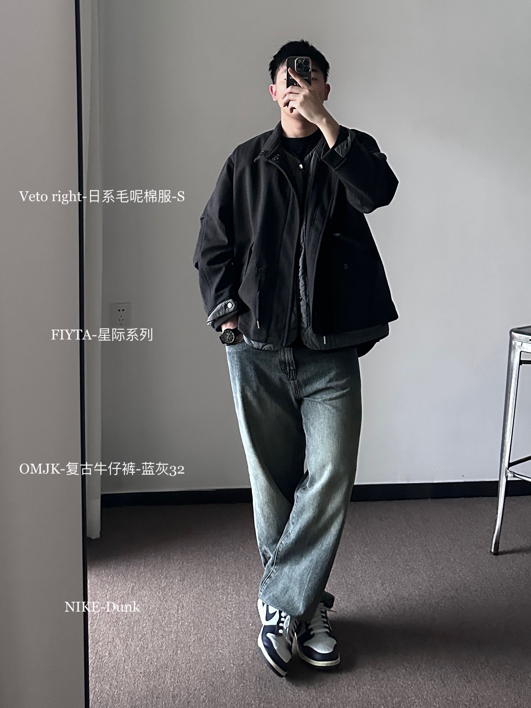 素人也能好看系列~ 174cm/65kg 🧥-毛呢两件套,含菱形棉服内搭,自带叠穿效果。出门一件过也帅。 👖-裤管的宽度和裤长堆叠感都是我喜欢的类型。 👟- 牛仔裤配DUNK,独一的好看。 ⌚-金属感表盘,刚强感max,倒三角设计上档次,加上钢表带质感不错。