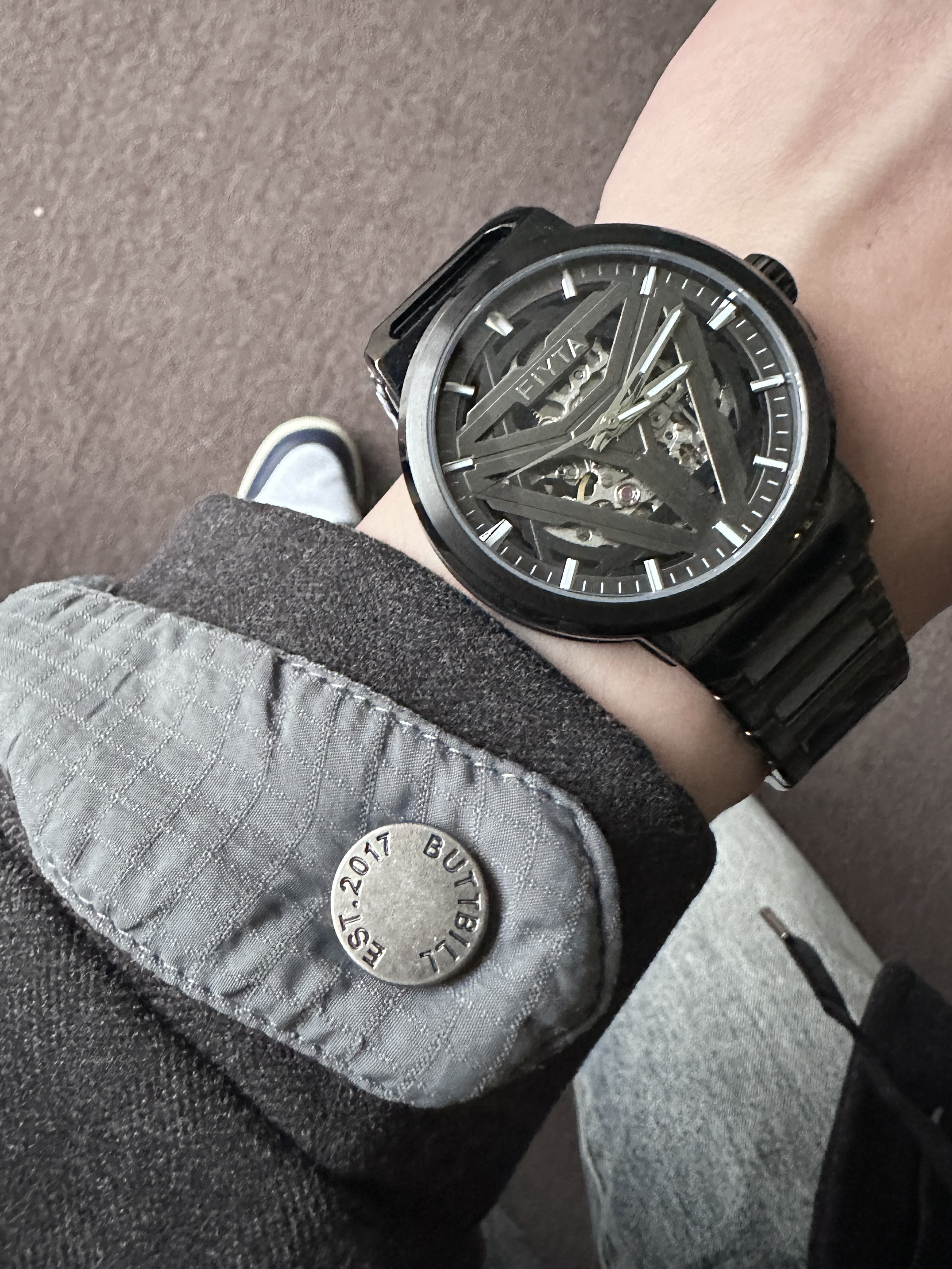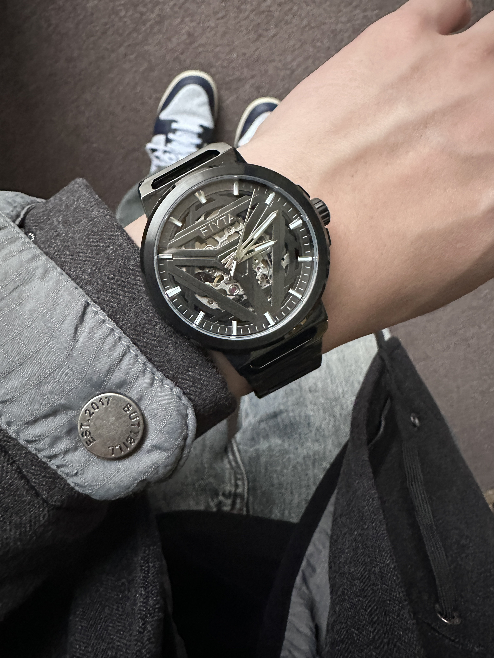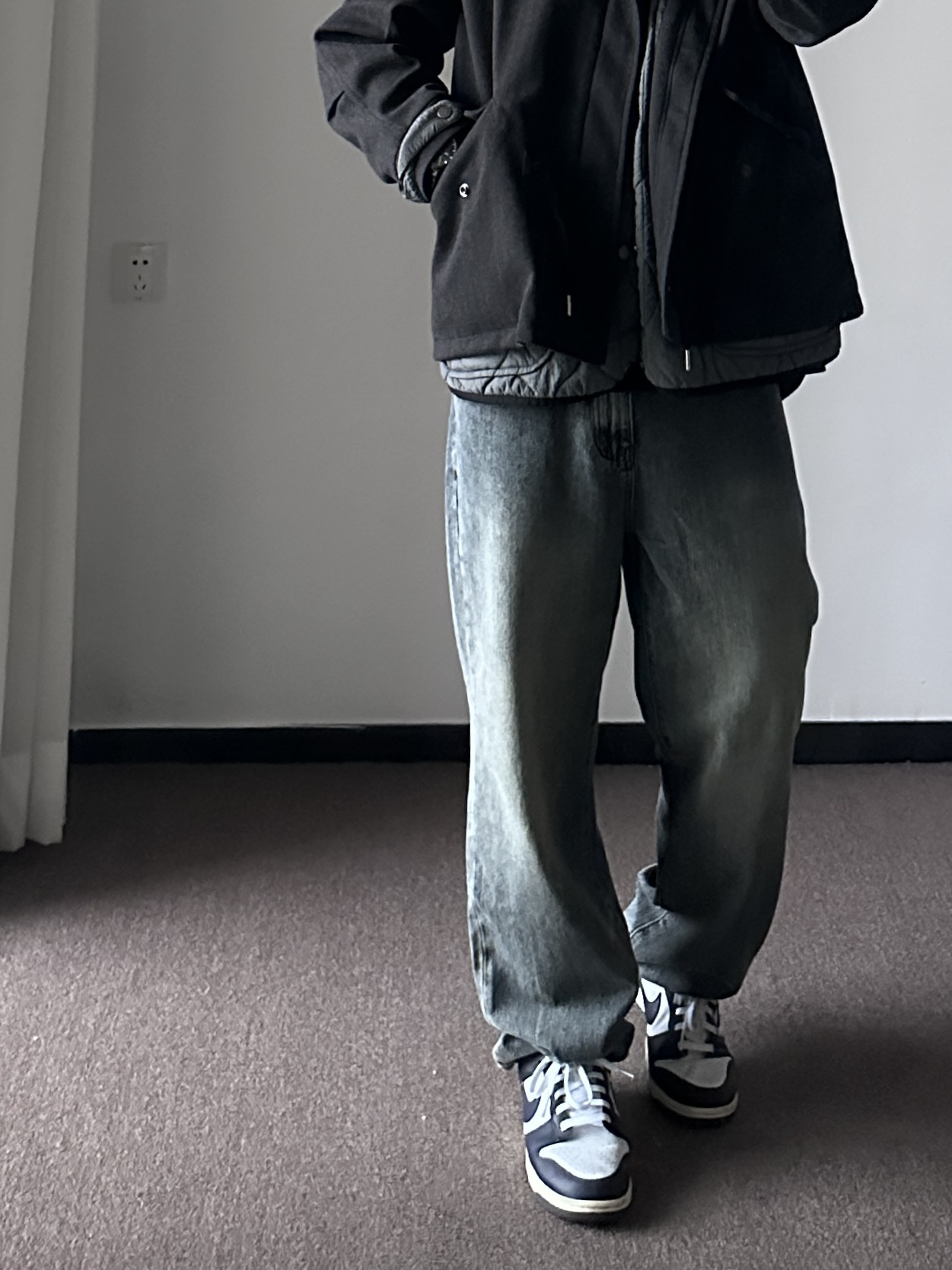 素人也能好看系列~ 174cm/65kg 🧥-毛呢两件套,含菱形棉服内搭,自带叠穿效果。出门一件过也帅。 👖-裤管的宽度和裤长堆叠感都是我喜欢的类型。 👟- 牛仔裤配DUNK,独一的好看。 ⌚-金属感表盘,刚强感max,倒三角设计上档次,加上钢表带质感不错。