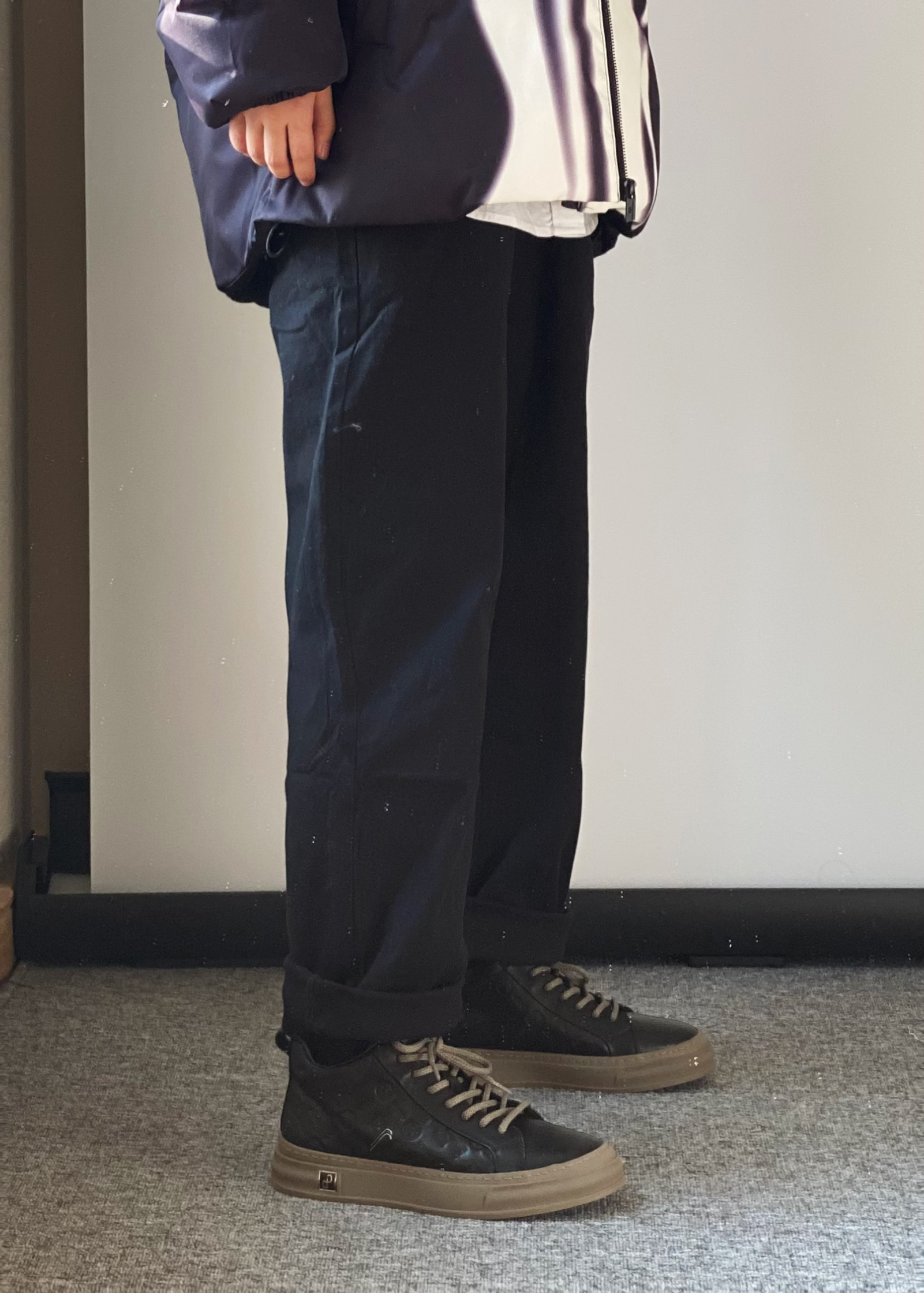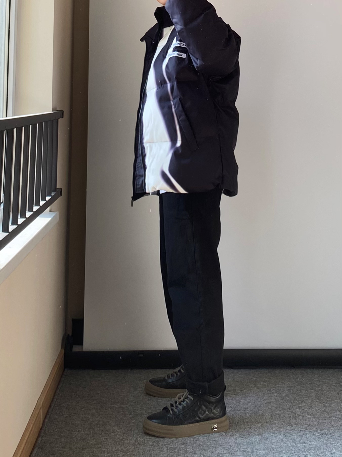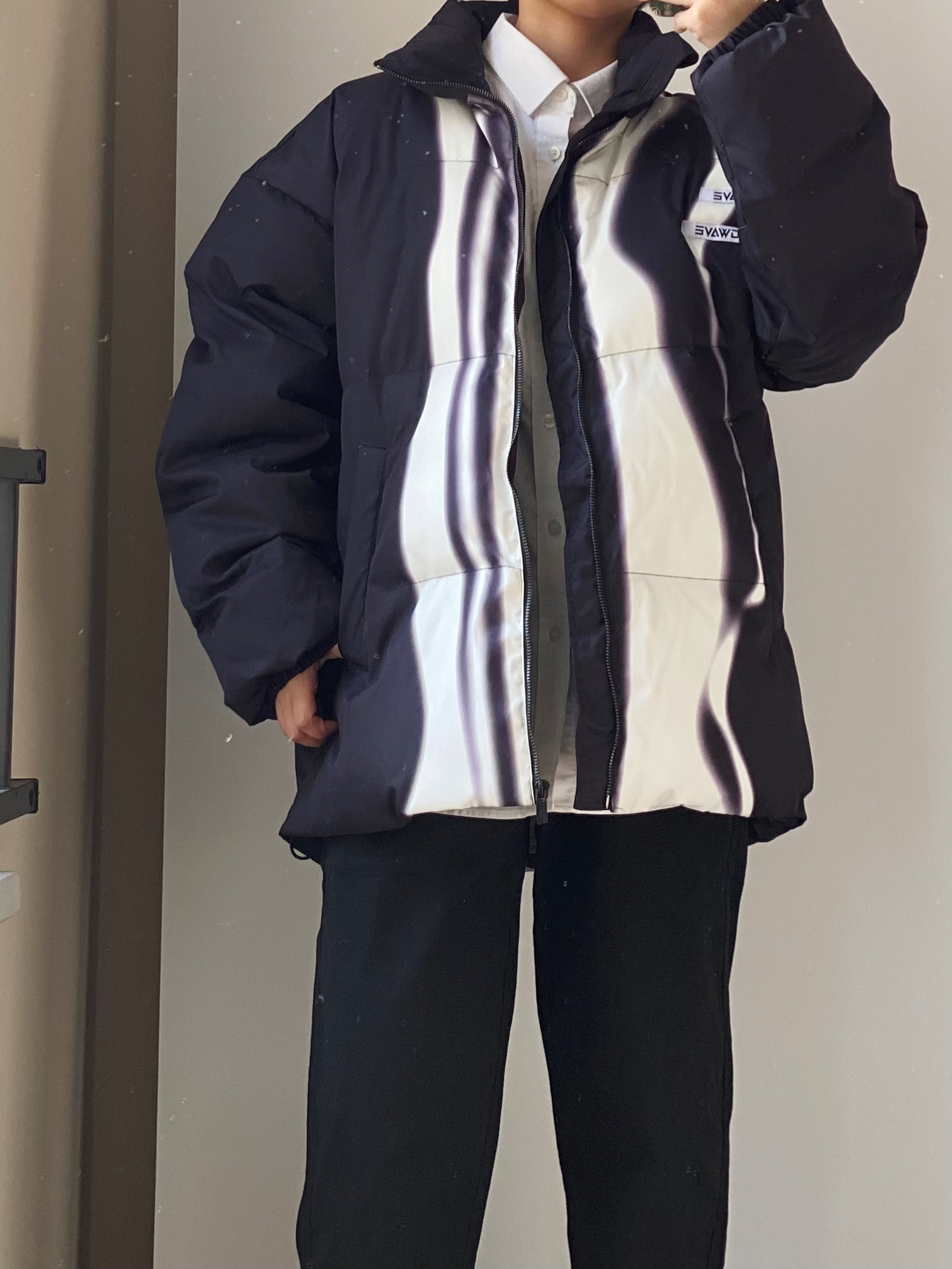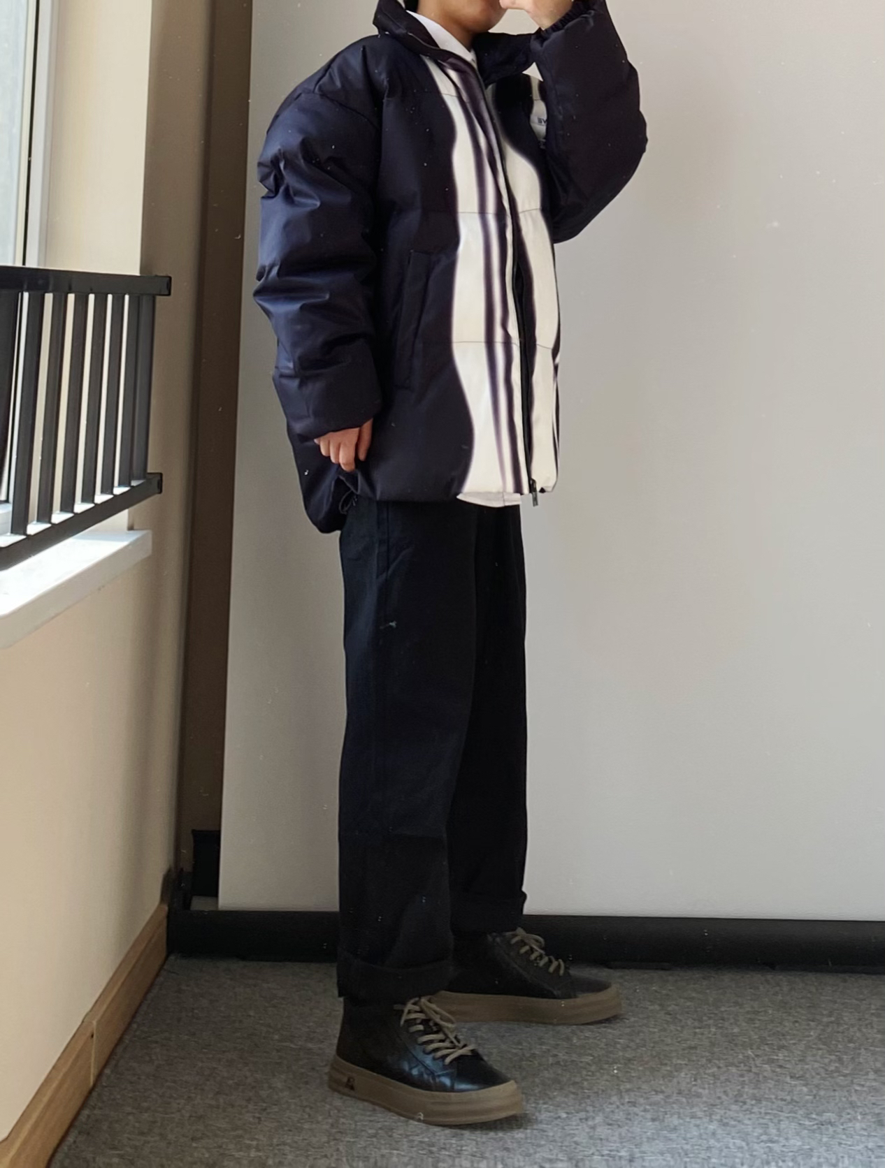 白衬衫➕棉服 yyds 这款线条撞色的棉服太抢眼啦~ 比较宽松的版型 保暖效果超级好零下10度都没问题 搭配一条黑色直筒牛仔裤👖 新年给自己准备了一双高帮板鞋 头层牛皮面料 侧边有暗纹logo压花非常高级哦~ - 👔WAITINGWAVE 👖白告studio