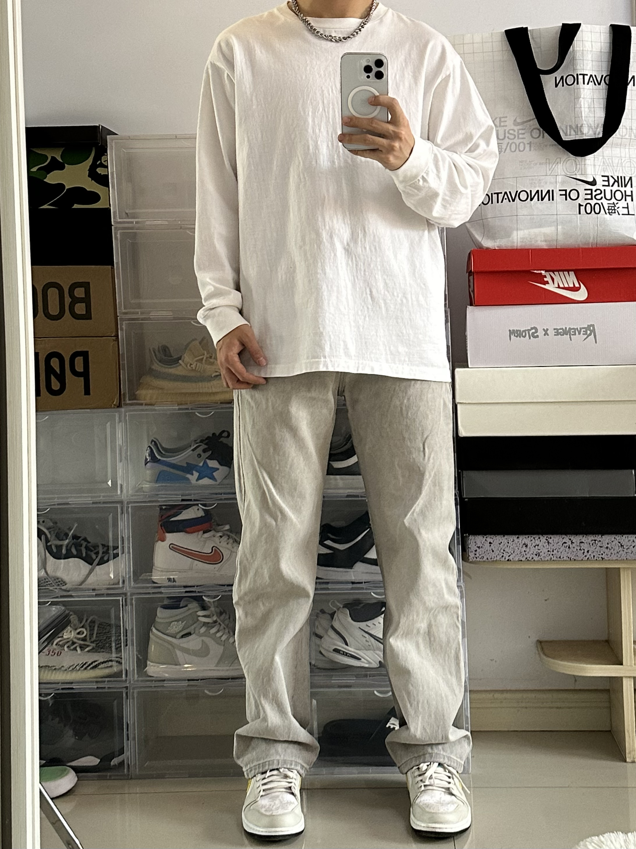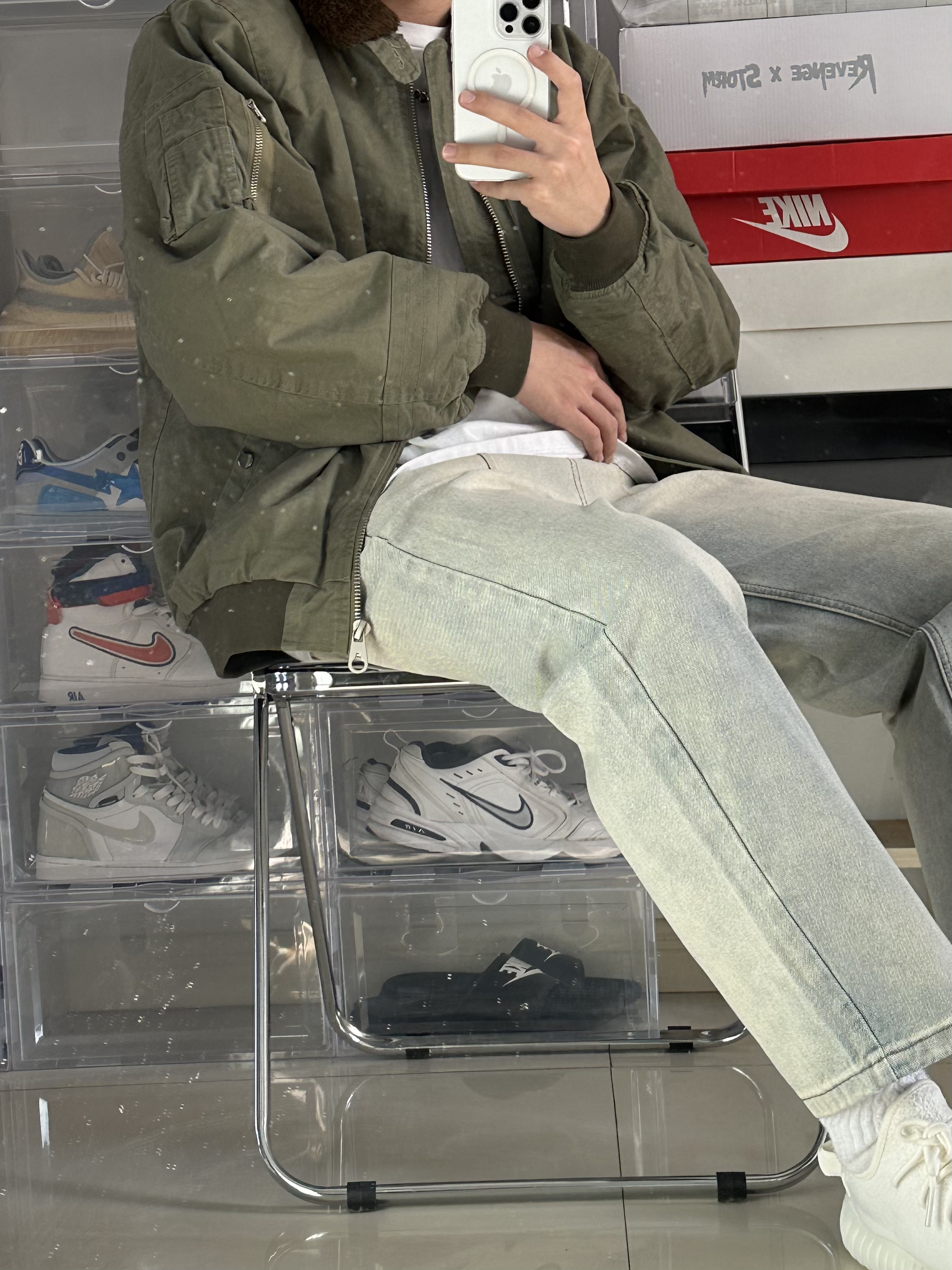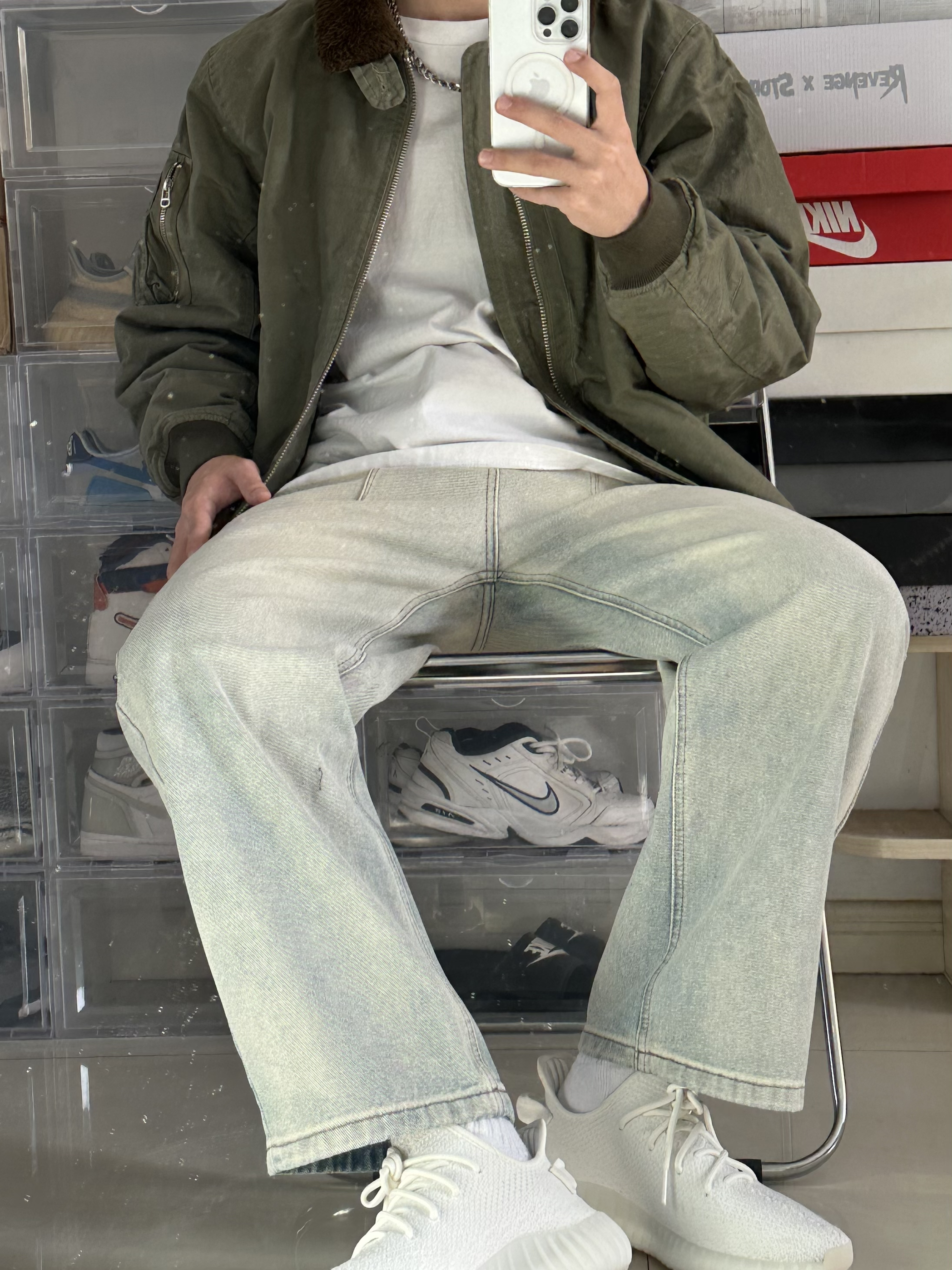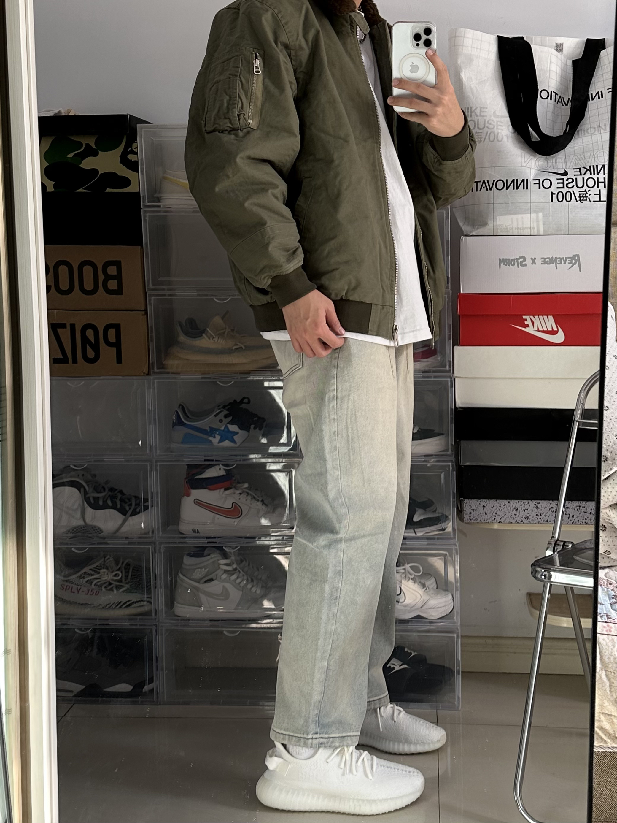 白打底配绿色棉服 配黄泥色牛仔裤 很暖和的一身