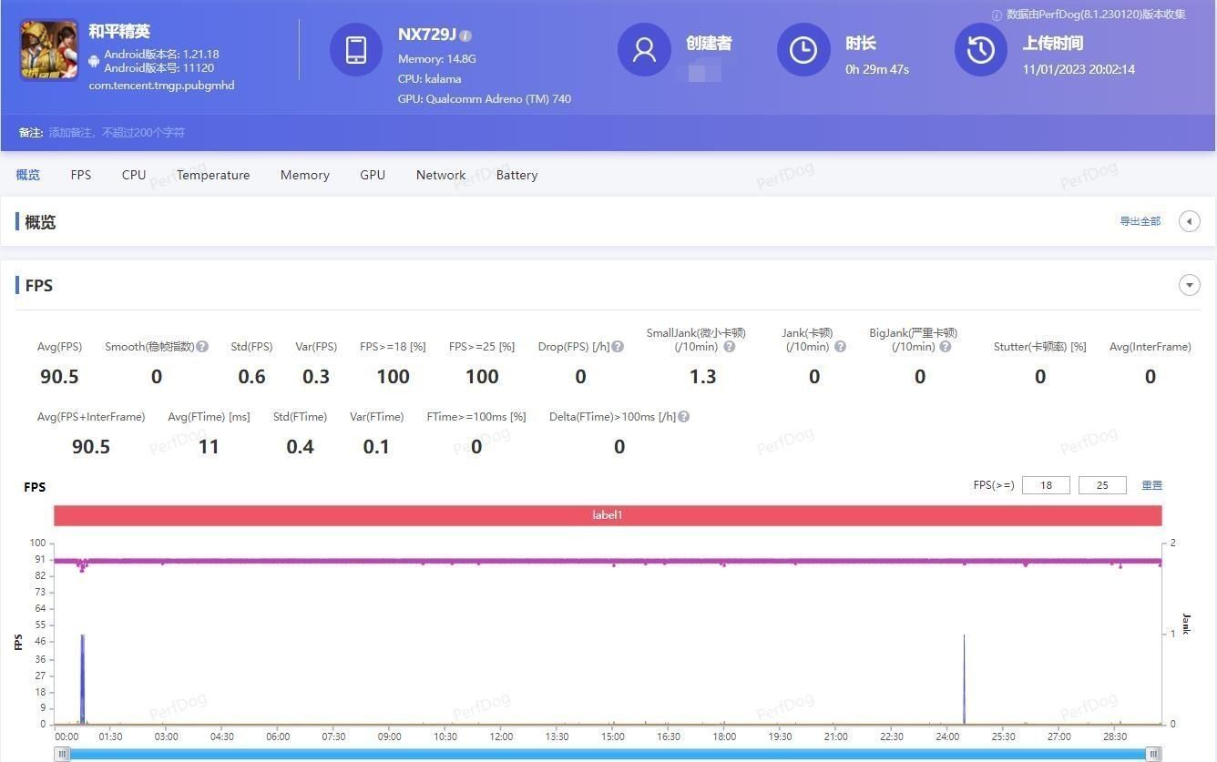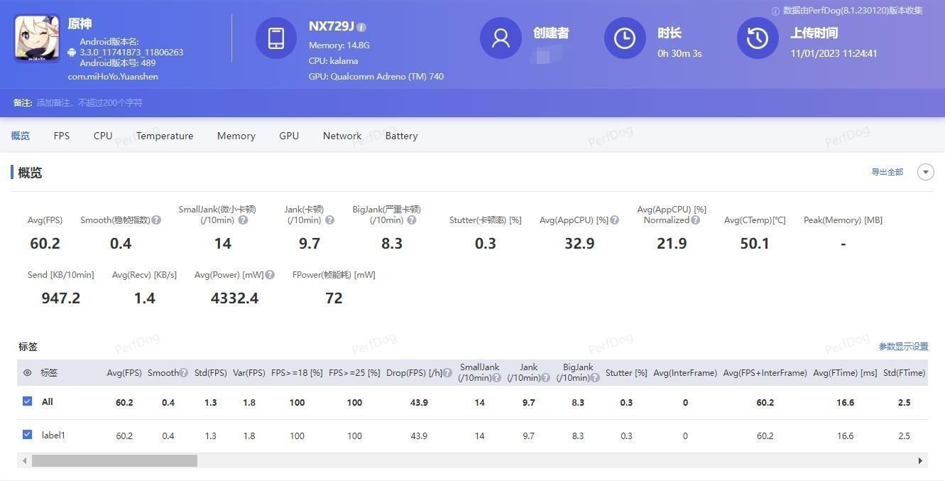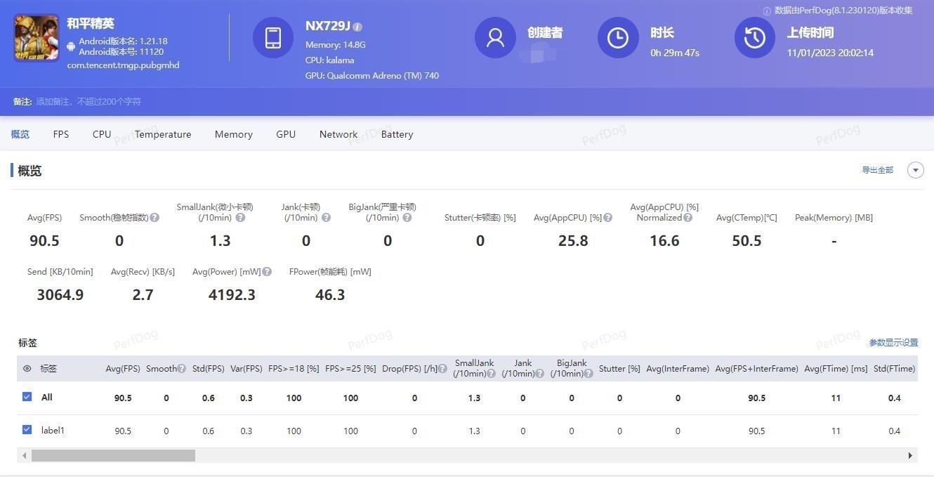 刚刚用红魔8 Pro+又玩了一下原神和吃鸡,顺便使用Perfdog测了一下帧率和功耗等信息。30分钟的原神,60帧高帧率高画质,主要还是以主线任务+打怪为主,平均帧率为60.2帧,平均功耗4.3W,抖动为1.8。同样30分钟左右的和平精英,90帧高帧流畅画质,平均帧率为90.5帧,平均功耗4.2W,抖动仅为0.3,而且全程机身也仅仅是有点温热而已,内置高转速风扇有一定效果,针对这两款热门游戏的表现...