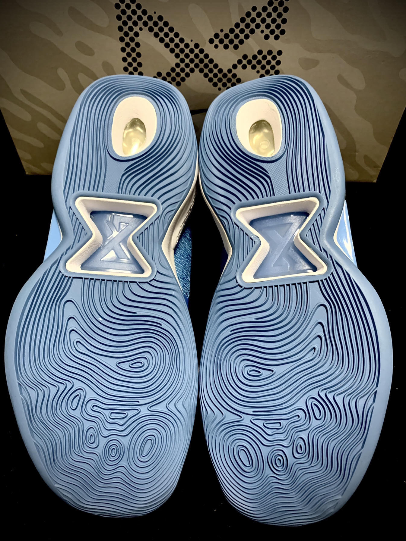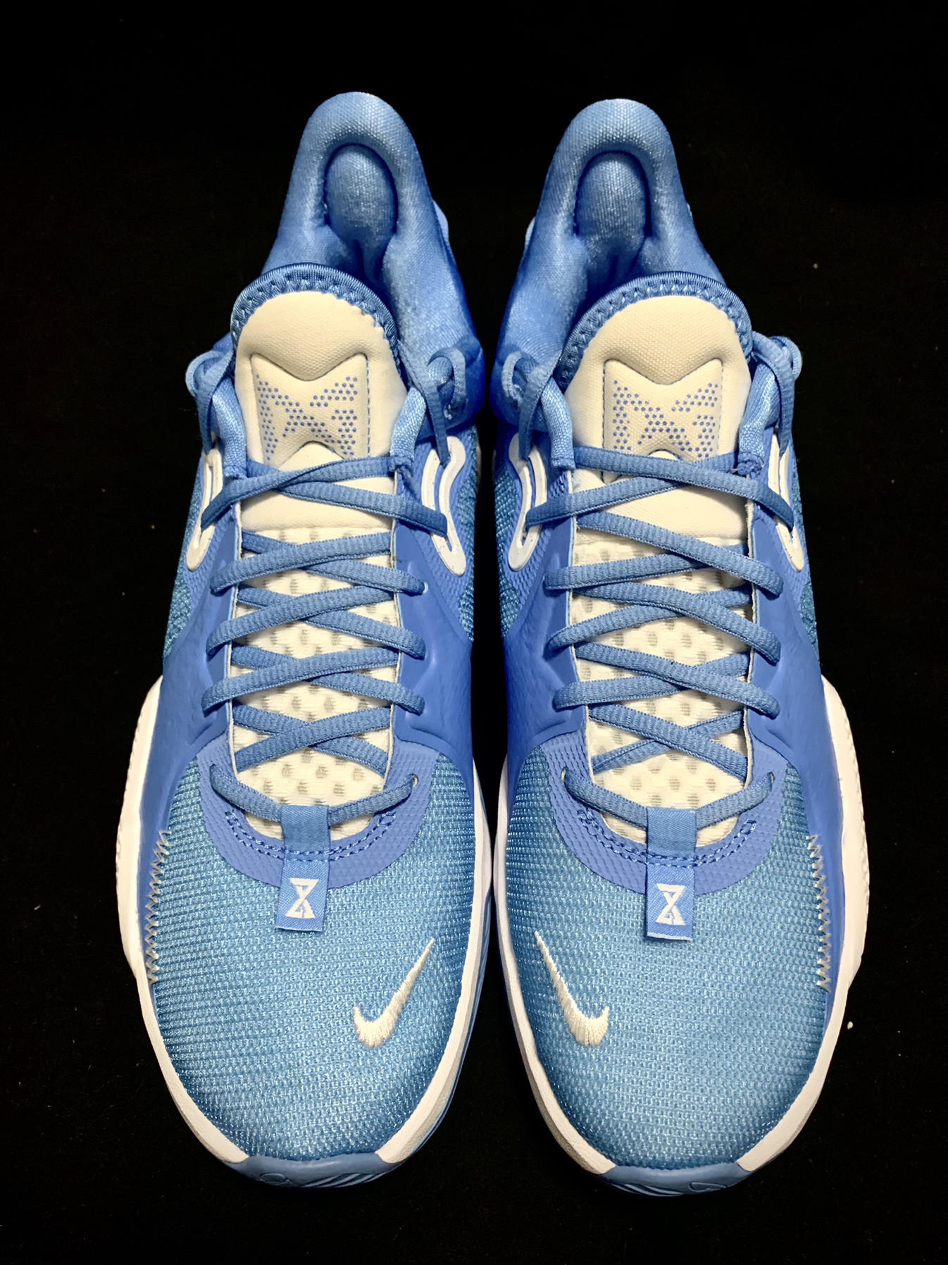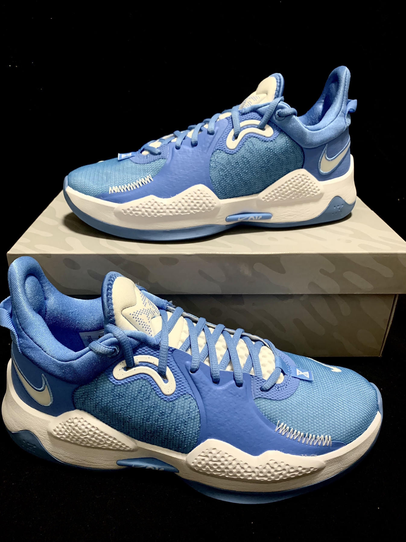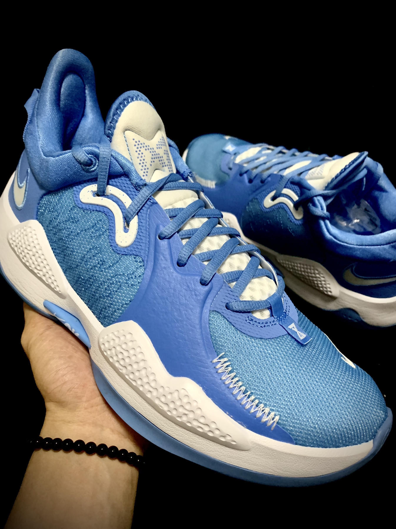 今天分享的是 PG5的一个TB配色——「北卡蓝」✅ 这个颜色真的一眼就爱住了❗️ 发现PG5好看的配色都是TB 这个鞋子还是非常适合我的 体重较轻的人穿着会很舒服 鞋底是全掌的Air Sole,回弹效果还不错的~ 🌟鞋底采用的是「科比9」同款纹路 我就说第一眼看这么眼熟! 泡脚不愧是曼巴门徒😂 鞋身内侧和鞋后跟的包裹非常赞👍 一穿上去就很舒服! 还有防侧翻也可以夸一下! 对比PG4...真的天差地...