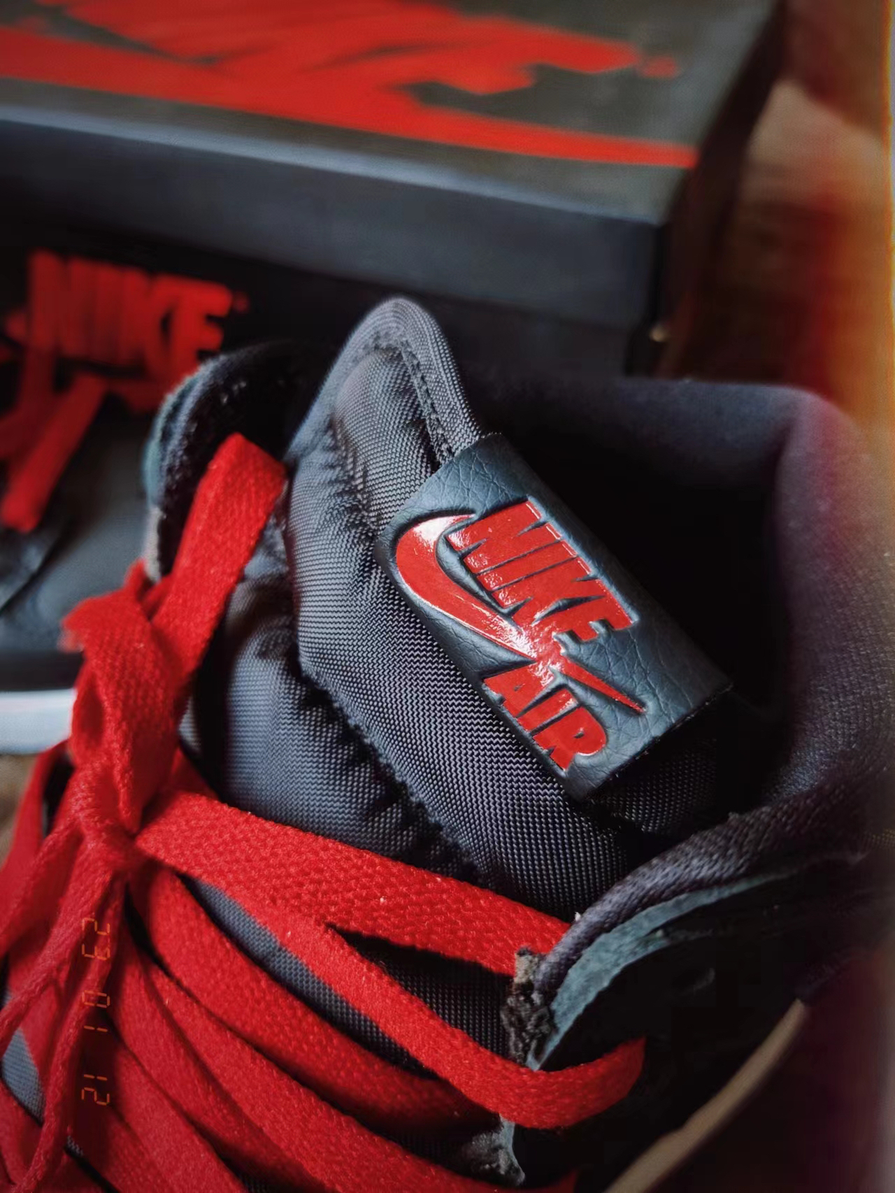 第一双AJ1高帮,性价比很高的一双高帮AJ1,还有丝绸加成✅,随赠两幅鞋带,黑色和红色鞋带加分加分🆒。 全黑的鞋身搭配红色的鞋带,直接改头换面,红色鞋带与飞人logo相呼应,很百搭 经典的AJ黑红鞋盒