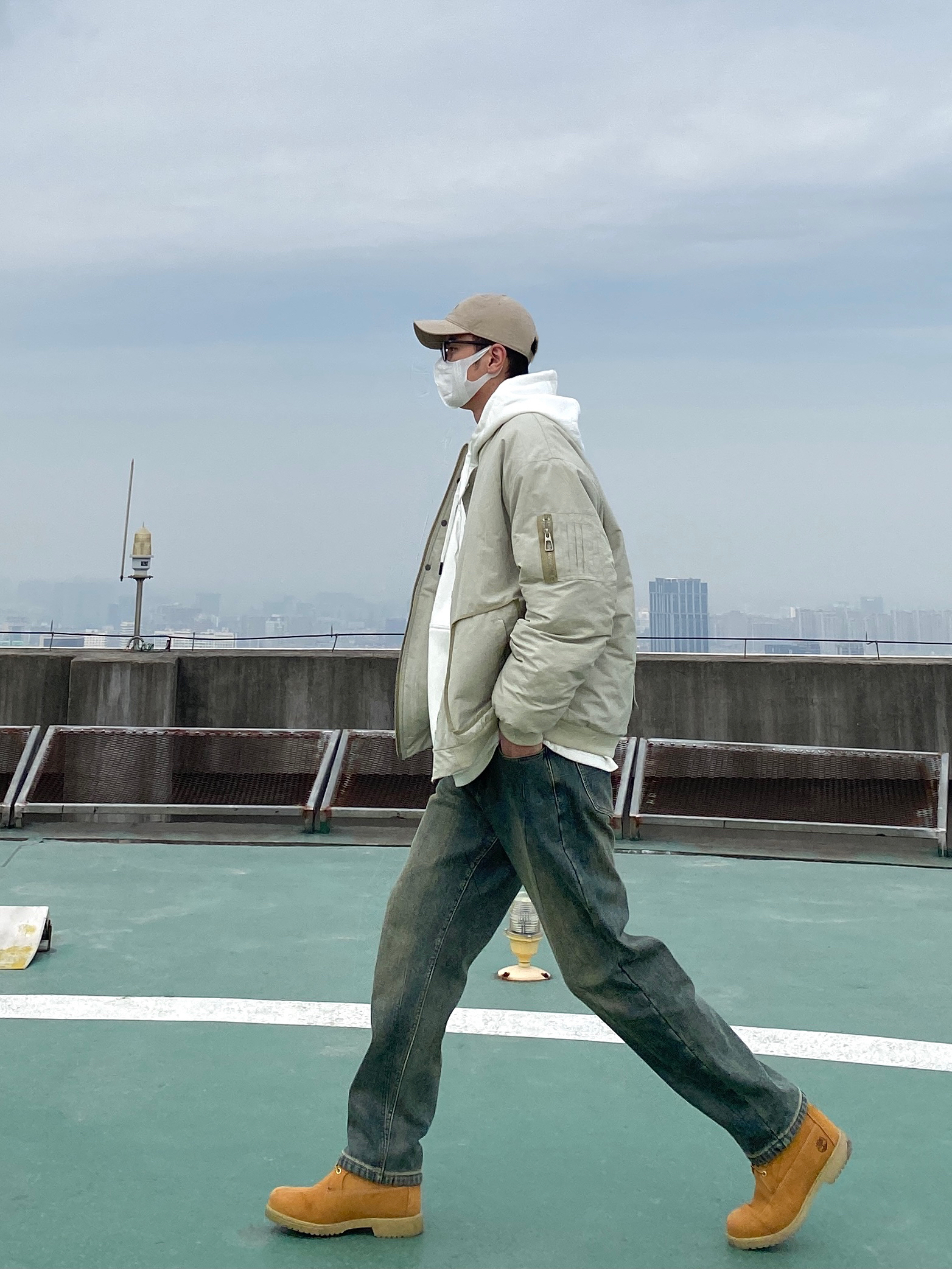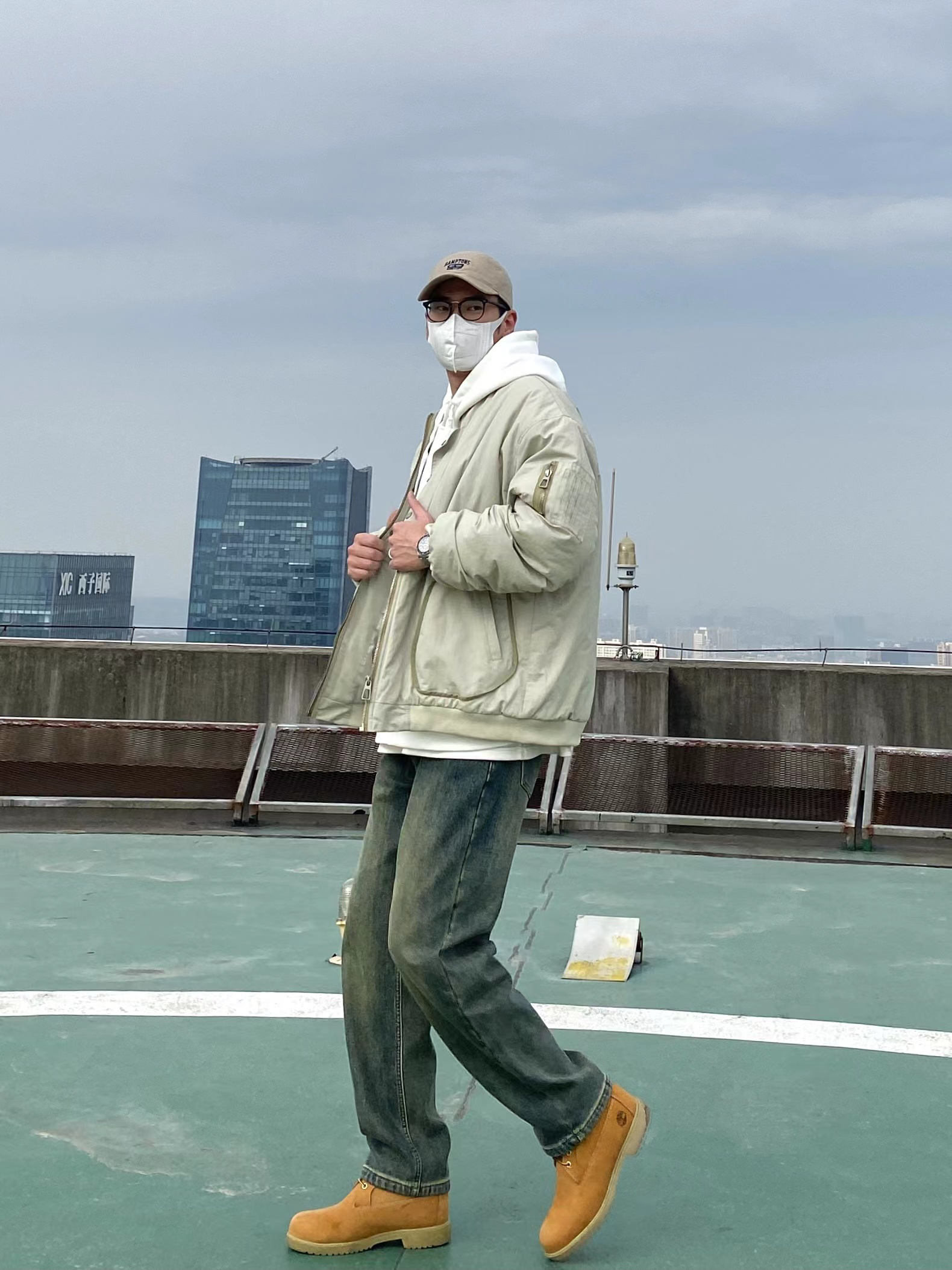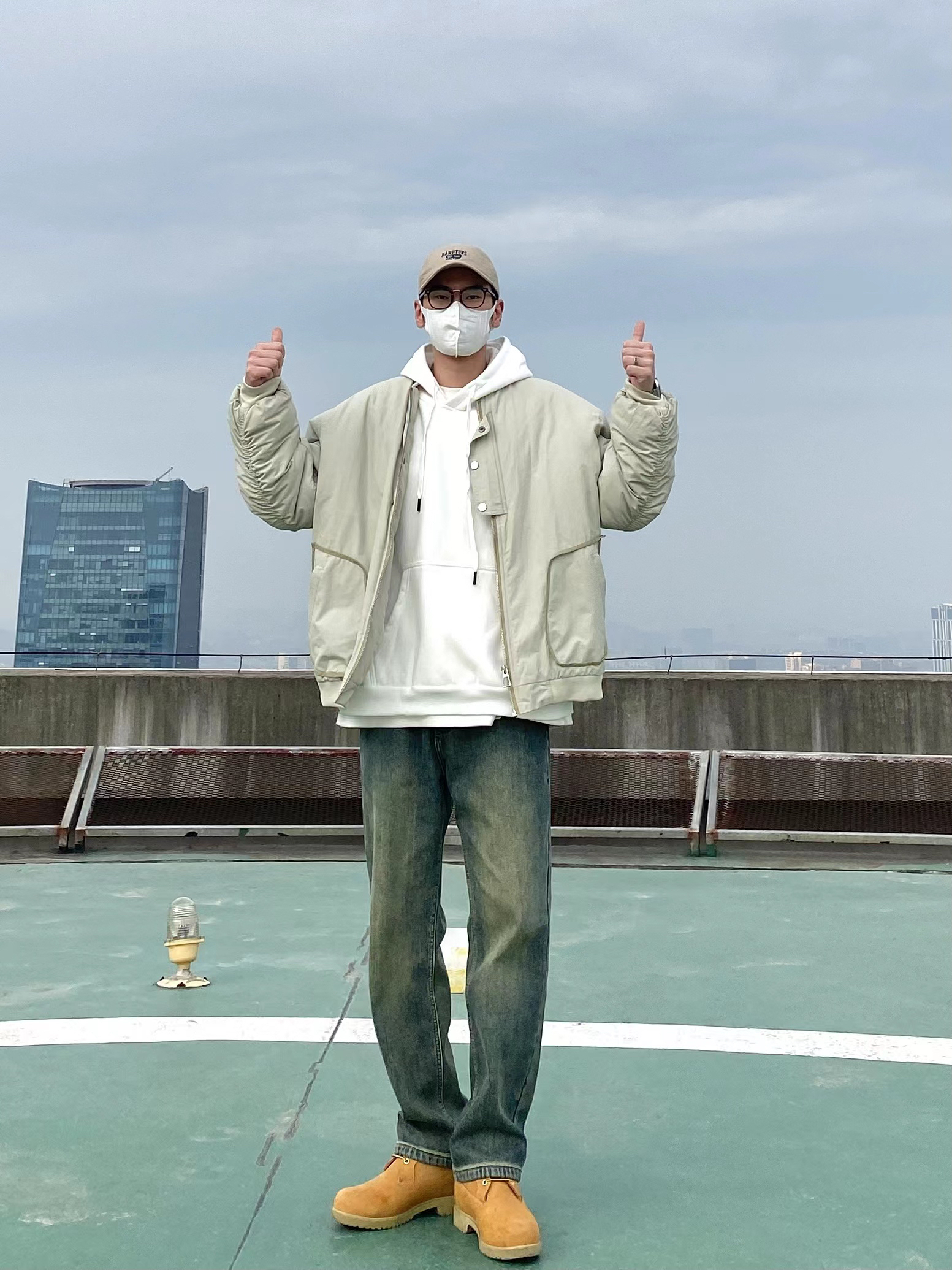 今天这套先用白色加绒连帽卫衣做内搭,裤子选择不挑腿型的水洗直筒牛仔裤,鞋子上脚秋冬必备的timberland工装靴,接着套上灰绿色宽松阔版空军棉服夹克,最后戴一顶卡其色棒球帽呼应下鞋子的颜色,OK,出门看看搭配效果吧! - 今日穿搭 衣服裤子:NICE LILI 鞋子:timberland