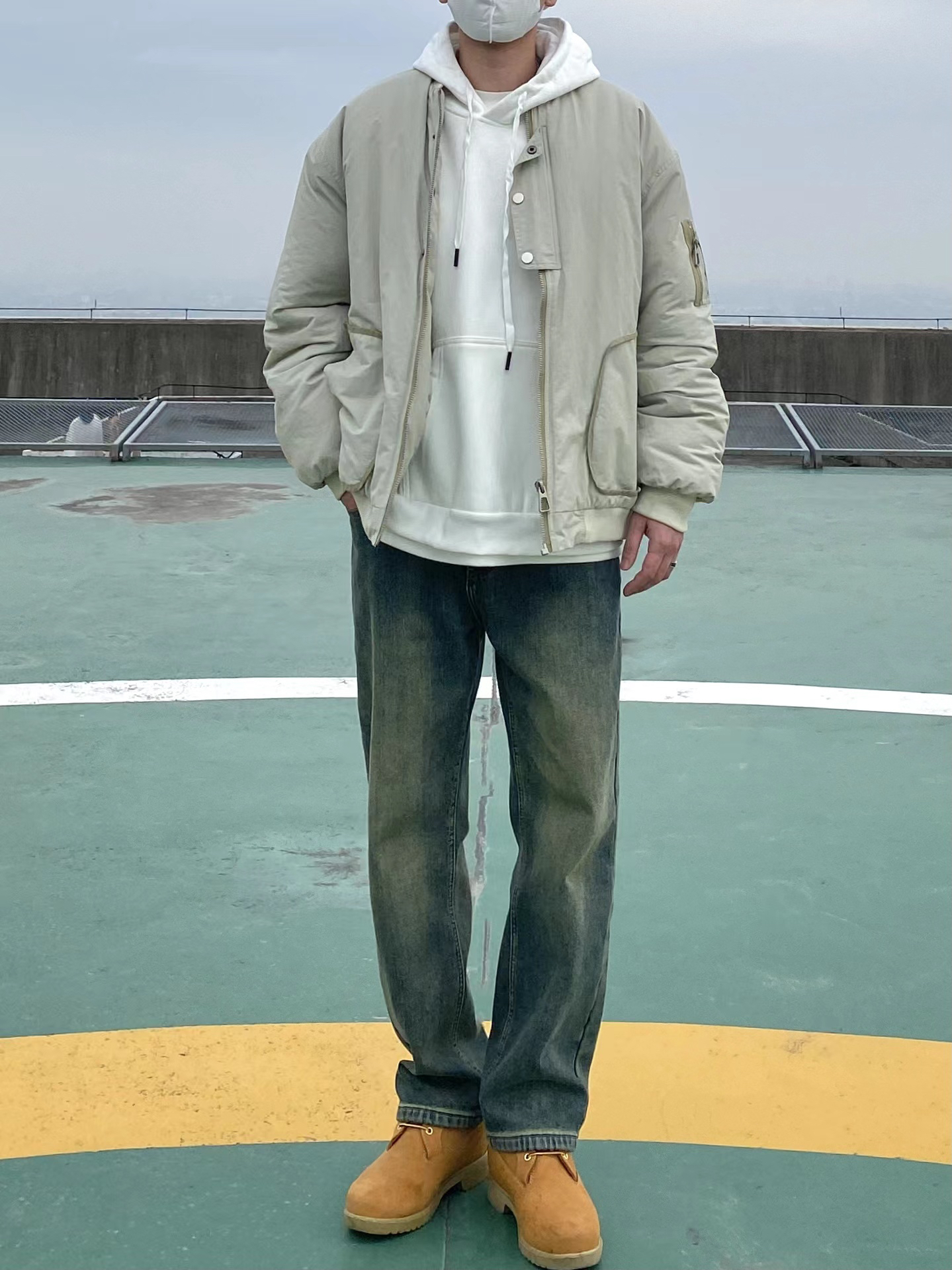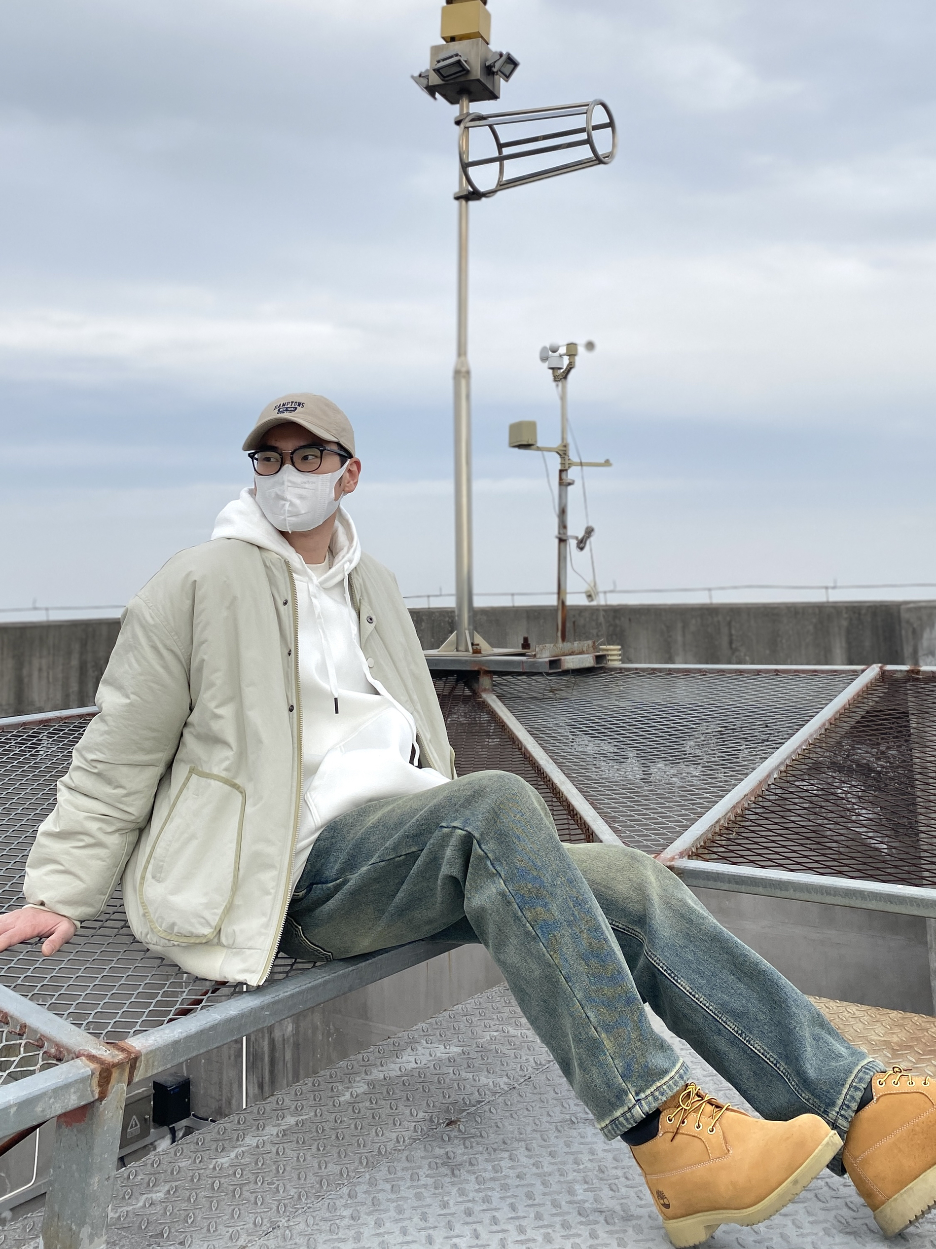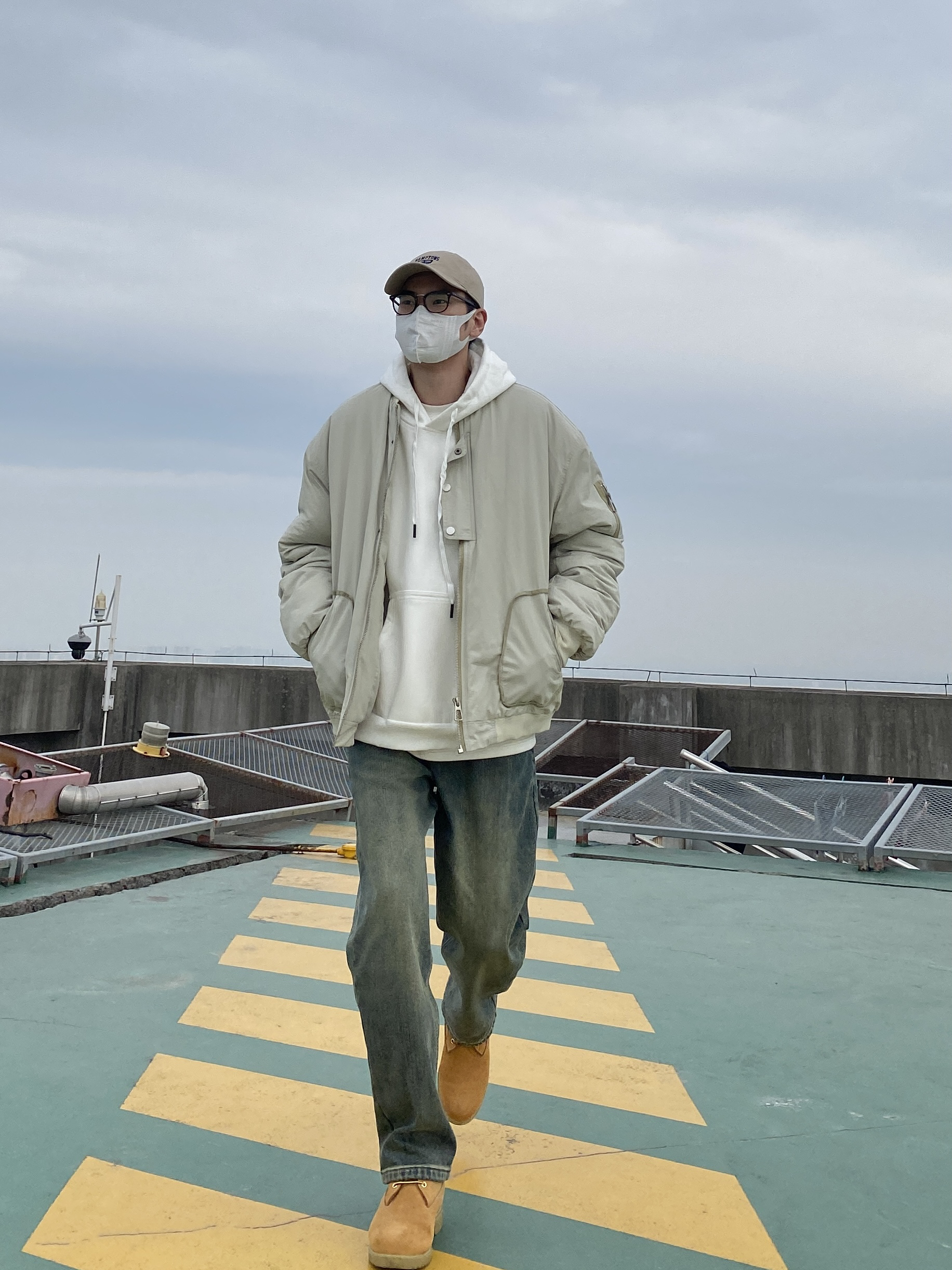 今天这套先用白色加绒连帽卫衣做内搭,裤子选择不挑腿型的水洗直筒牛仔裤,鞋子上脚秋冬必备的timberland工装靴,接着套上灰绿色宽松阔版空军棉服夹克,最后戴一顶卡其色棒球帽呼应下鞋子的颜色,OK,出门看看搭配效果吧! - 今日穿搭 衣服裤子:NICE LILI 鞋子:timberland