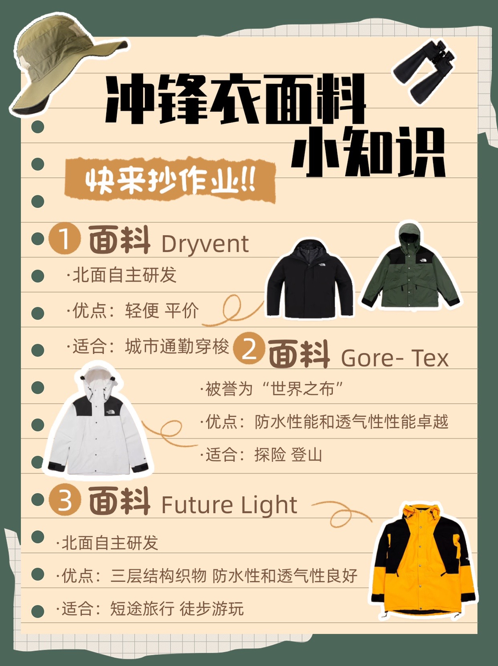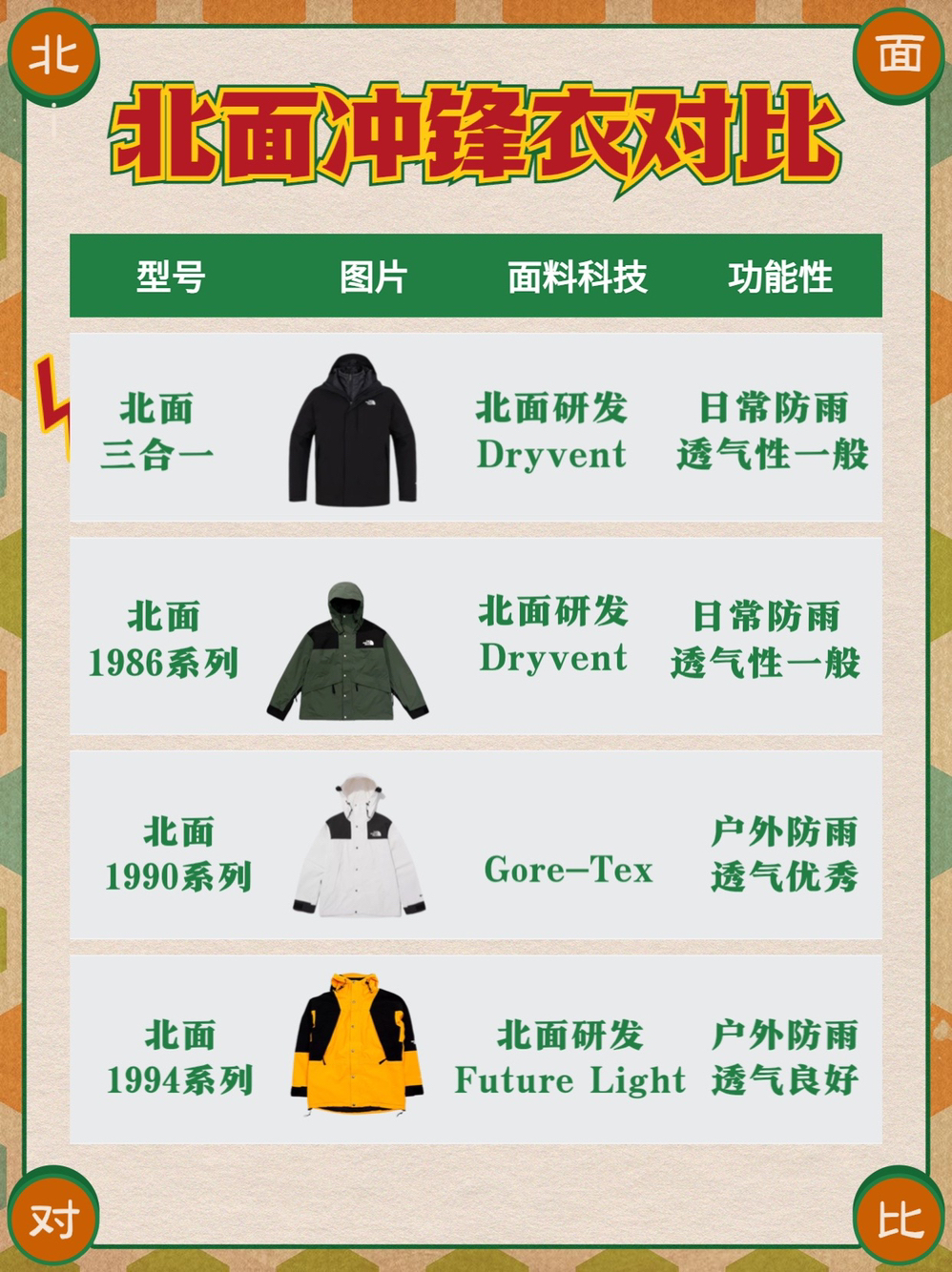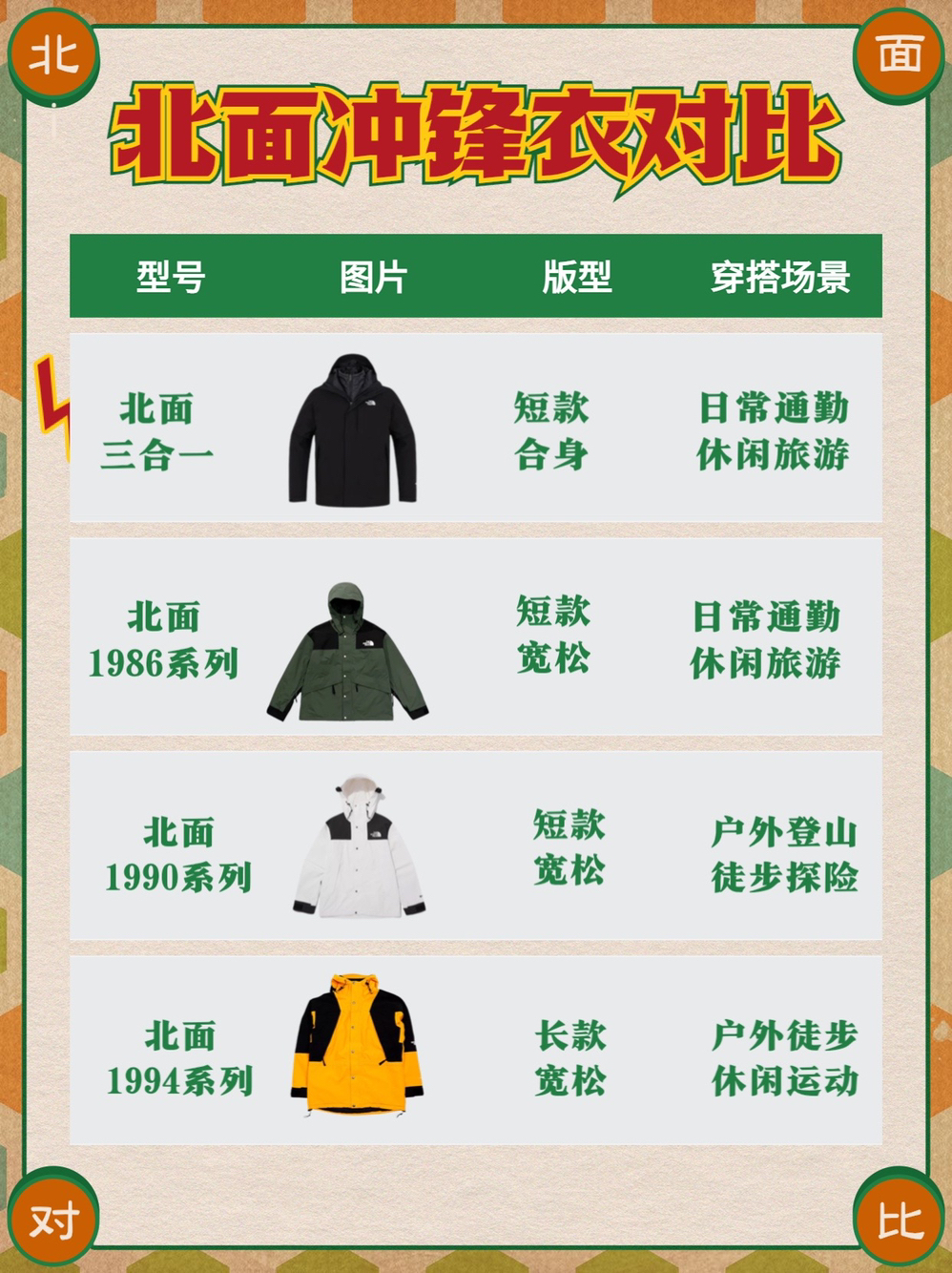 这个冬天你要问最火🔥的是什么❓毫无疑问就是冲锋衣 但是冲锋衣这么多,怎么才能避免当韭菜被割 这份北面冲锋衣对比清单,你可要收好了‼️ ✅版型对比 三合一是合身的,上身会比较修身,其余三款都是宽松的版型 下摆的长度则是三合一<1986短款<1990短款<1994长款 小个子比较适合短款不会压身高👍 💚面料对比 北面不同版本的冲锋衣选用的材质都有所差别 三合一冲锋衣和1986系列都是采用的北面自...