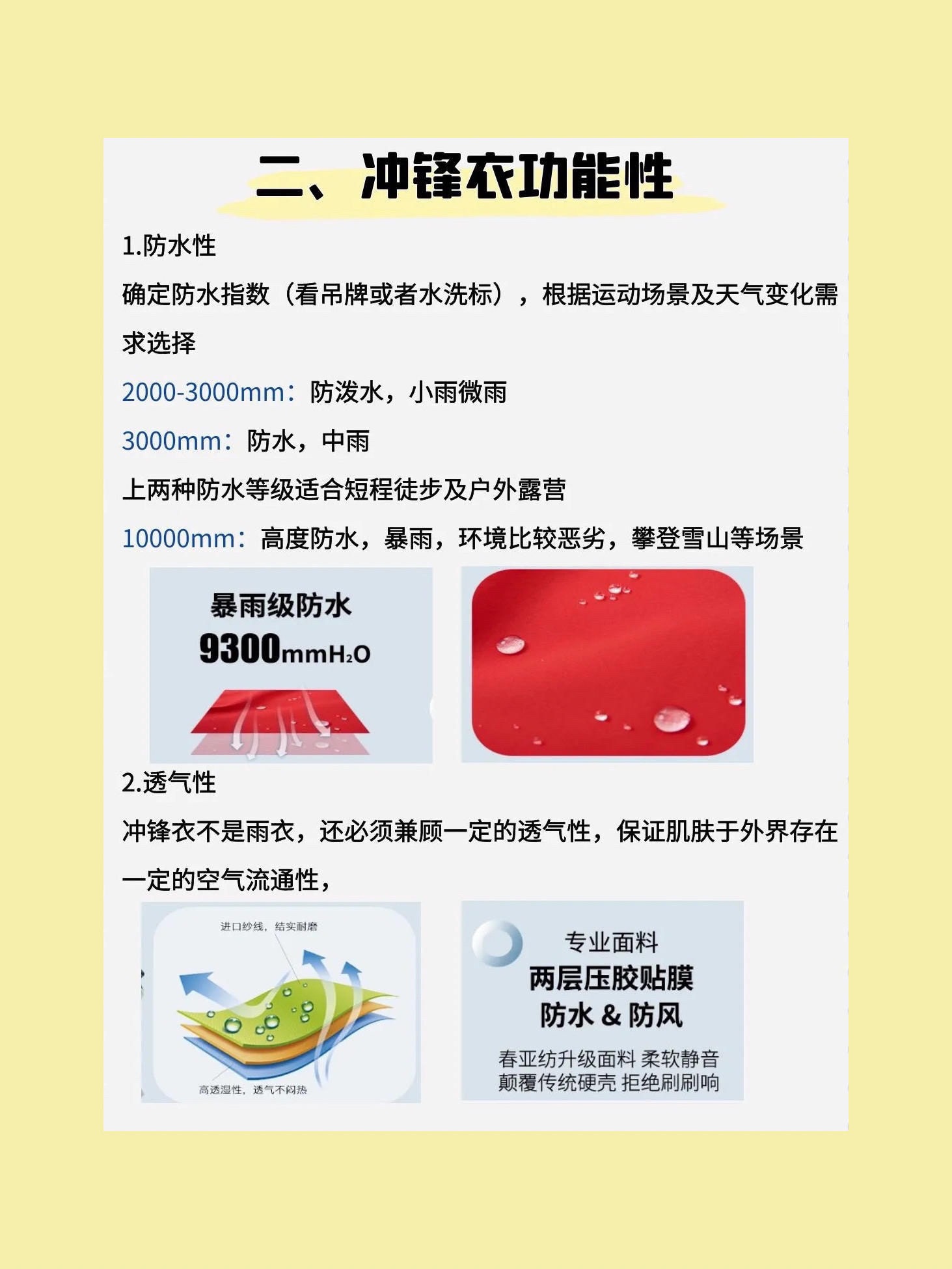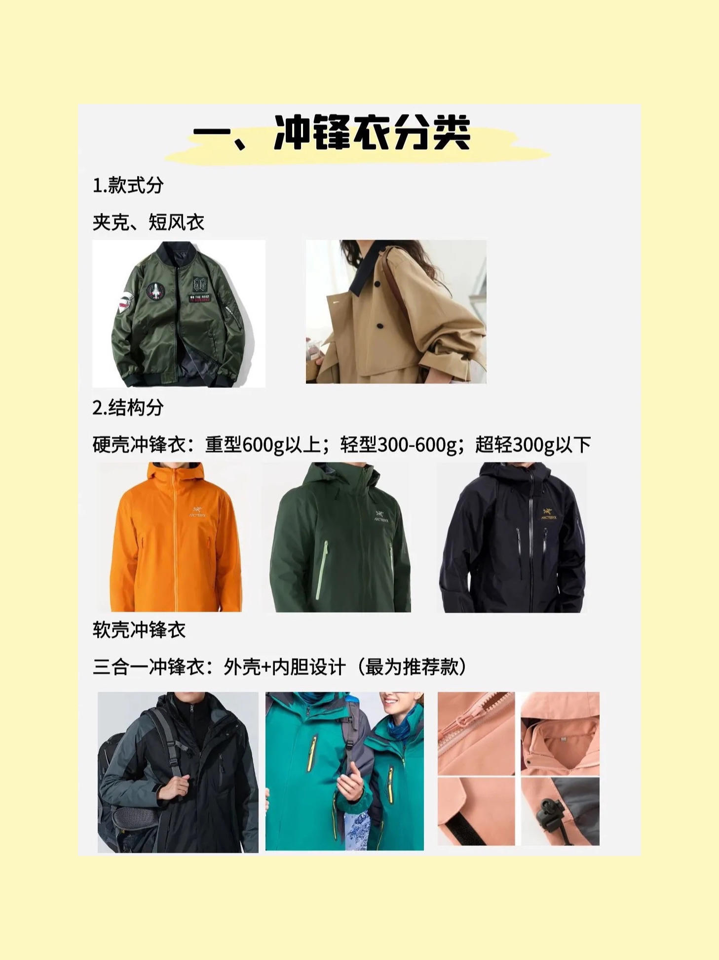 💥买冲锋衣,看这一份指南就够了!!! 🔥冲锋衣怎么选?这里有一份从实际使用中总结出来的选购指南。 📍一、冲锋衣分类 1.款式分类: 夹克、短风衣 2.结构分类: 硬壳冲锋衣:重型600g以上;轻型300-600g;超轻300g以下 软壳冲锋衣: 三合一冲锋衣:外壳+内胆设计(最为推荐款)。 📍二、冲锋衣功能性 1.防水性怎么看? 确定防水指数(看吊牌或者水洗标),根据运动场景及天气变化需求...