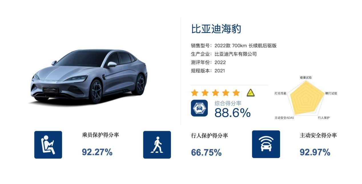 尽管如此,但海豹仍取得了突破常规的成绩表现,甚至打破了测试机构的历史最佳记录。例如在乘员保护方面,海豹拿到了创纪录的92.27 %,在鞭打得分和儿童乘员保护得分更是得到了满分的评价;碰撞得分为58.211分(满分60分),正面100%重叠刚性壁障碰撞试验得分为22.783分(满分24分),以综合得分率88.6 %荣膺五星安全评价。