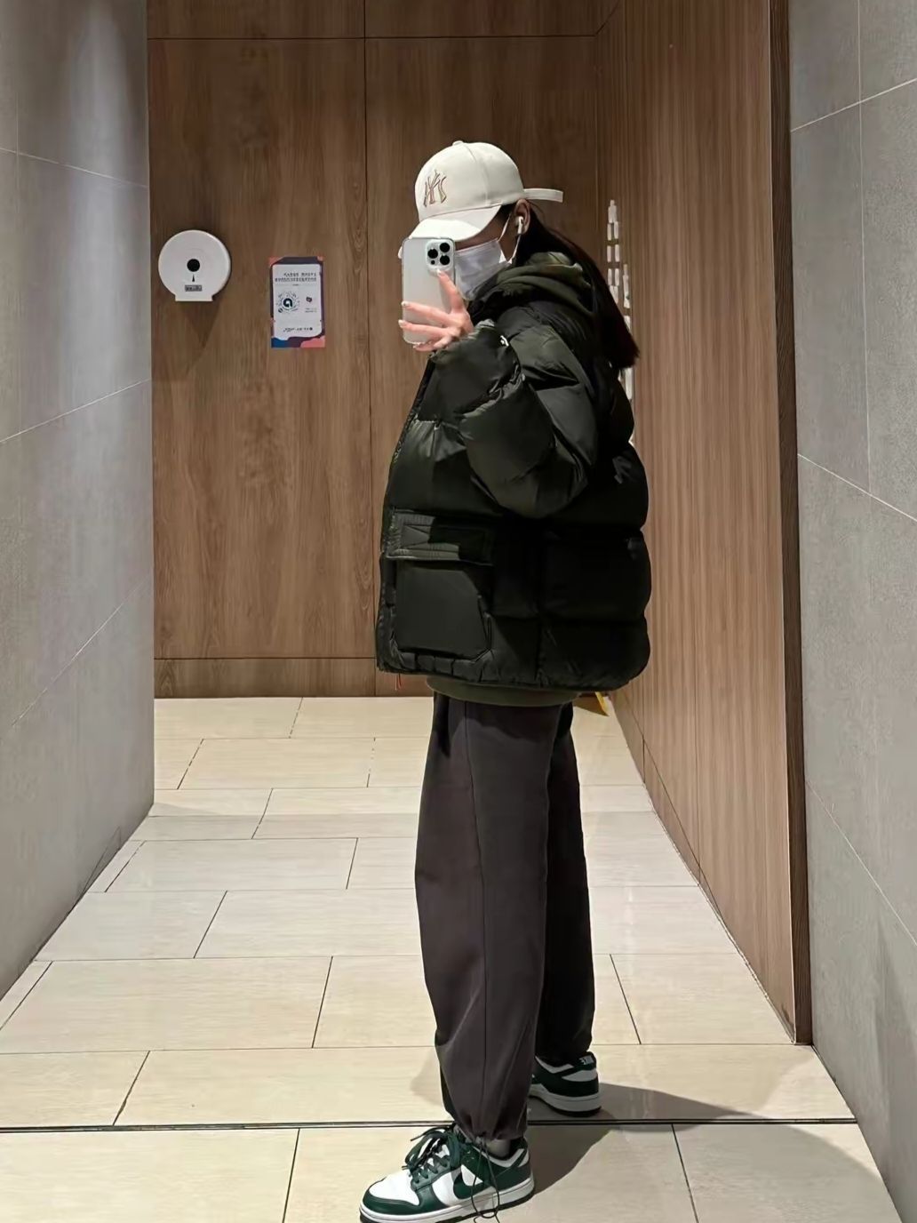 🔷冬天还是得Converse羽绒服 质感很好 很轻薄不厚重敲暖和!!里面单穿一个背心都不冷 北方的天气都够了~黑色也很显瘦 百搭 尊滴很爱 🔷下身搭配灰紫色束脚休闲裤,脚踩白绿色dunk,很有秋冬氛围感 (图源网络侵删)