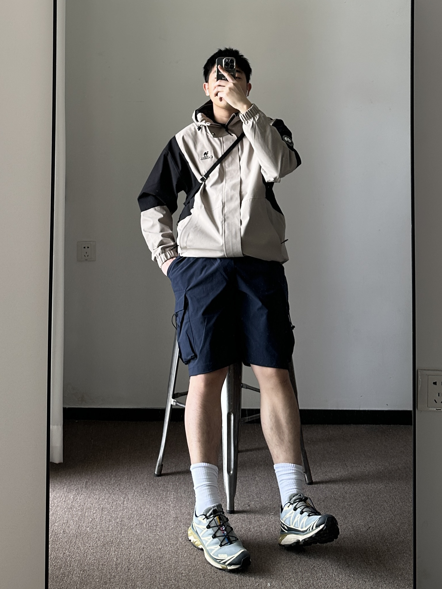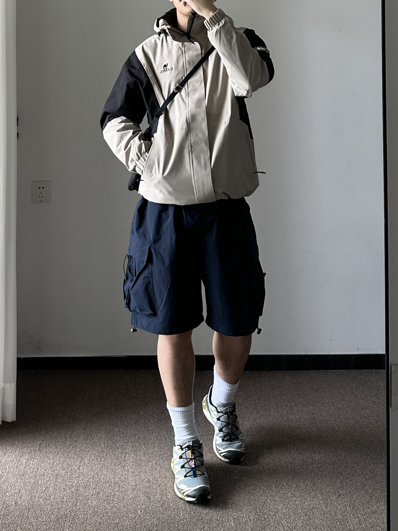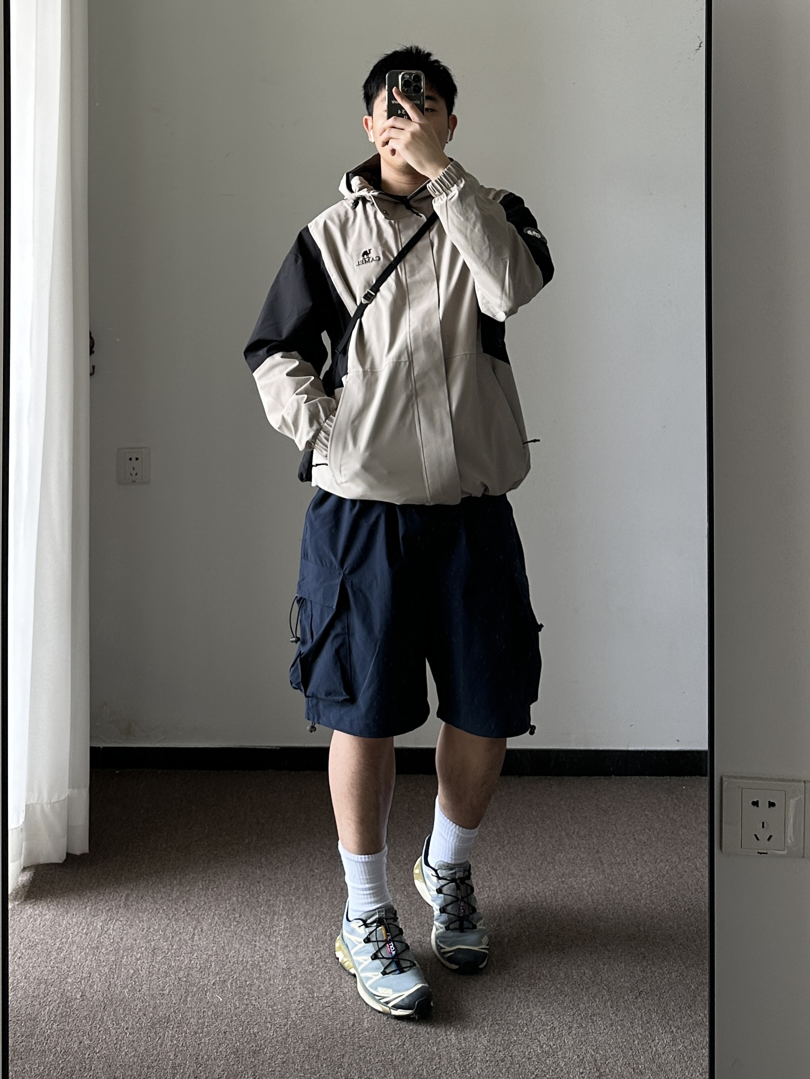 素人也能好看系列~174cm / 65kg 🧥- 穿着好看的三防冲锋衣踏春去了,面上的水珠一丝不挂,性能不赖呢。浅卡其搭黑色拼接,这个配色yyds! 👖- 来条藏青色机能工装裤吧! 👟- XT6