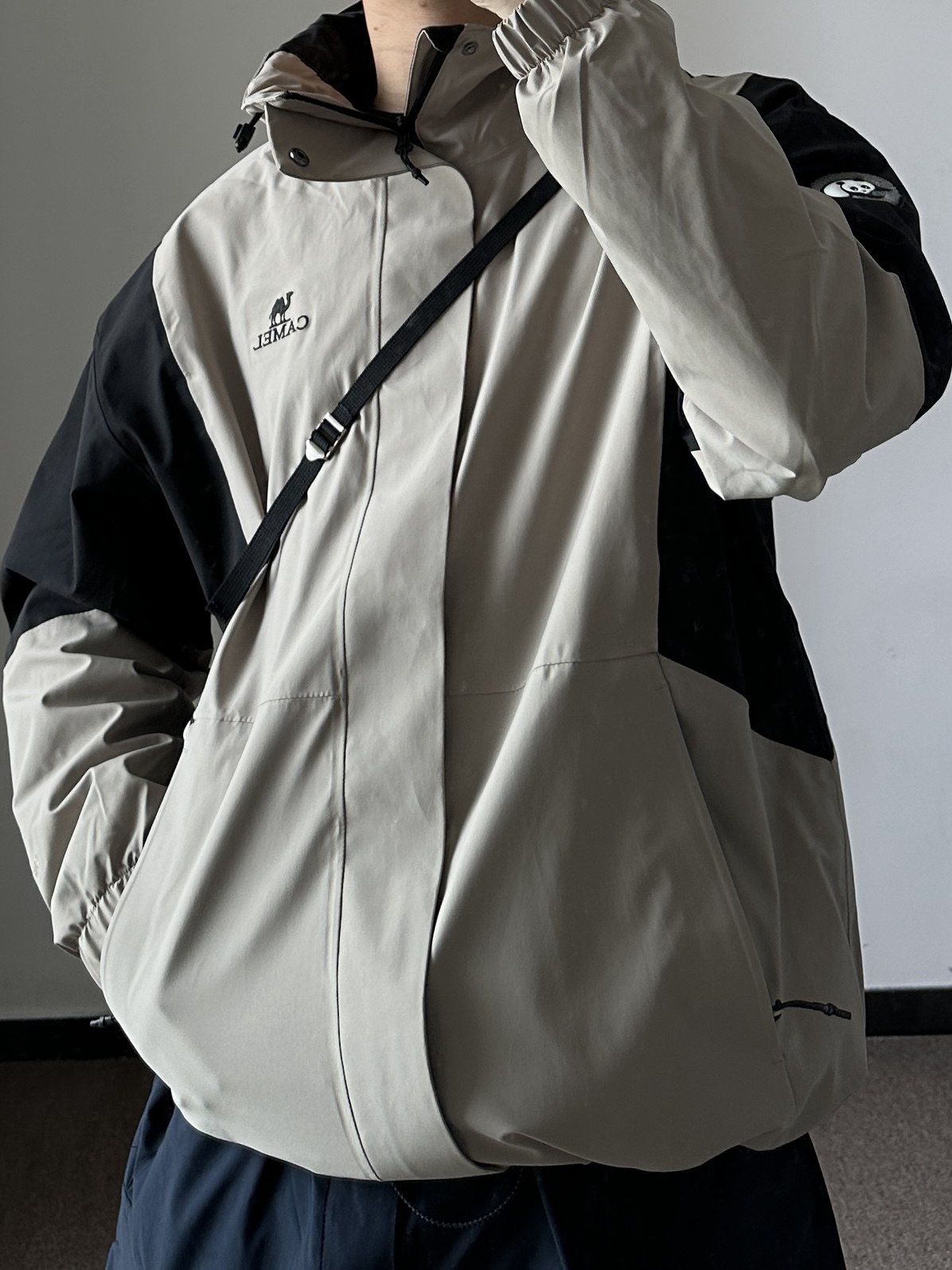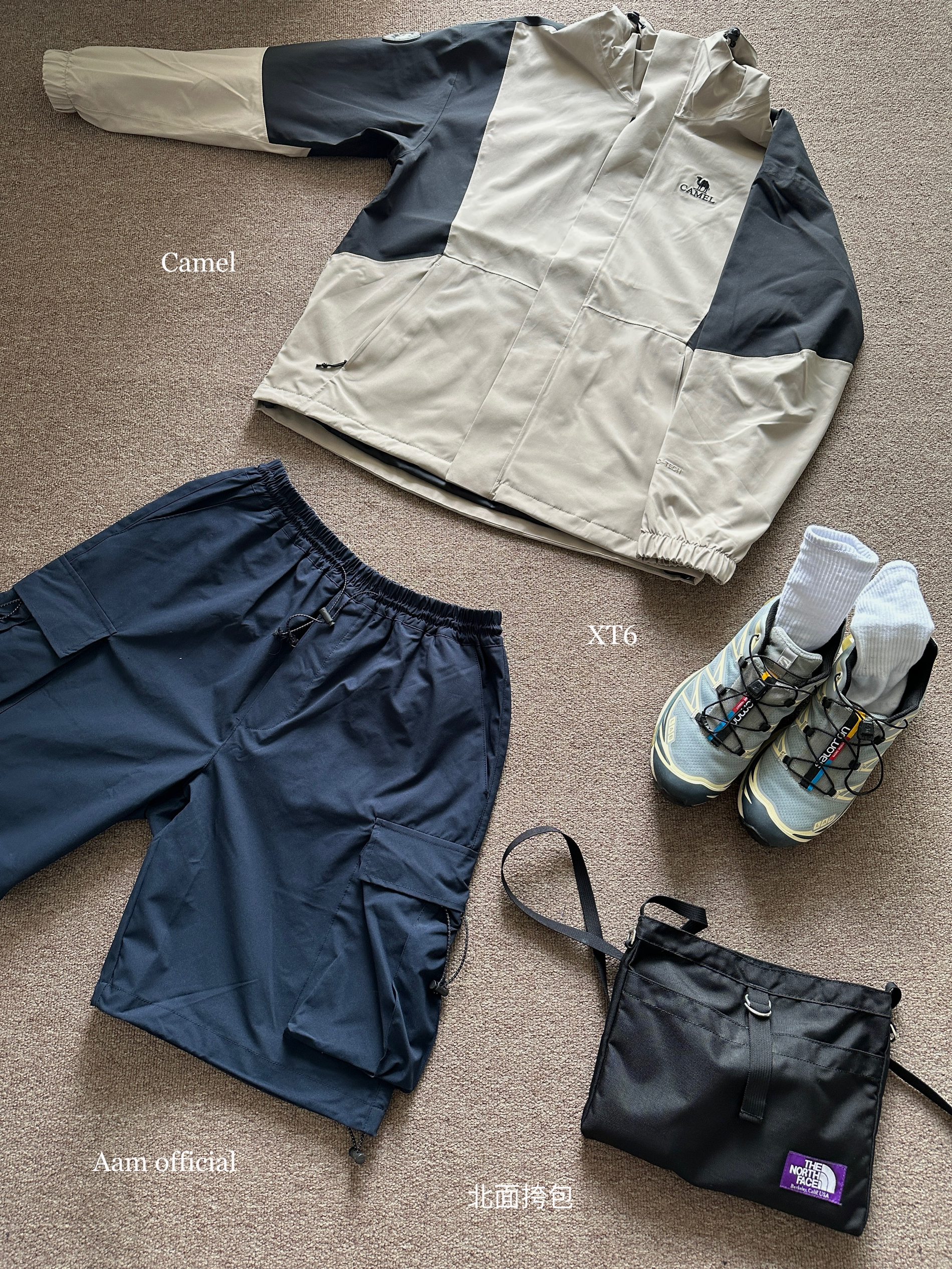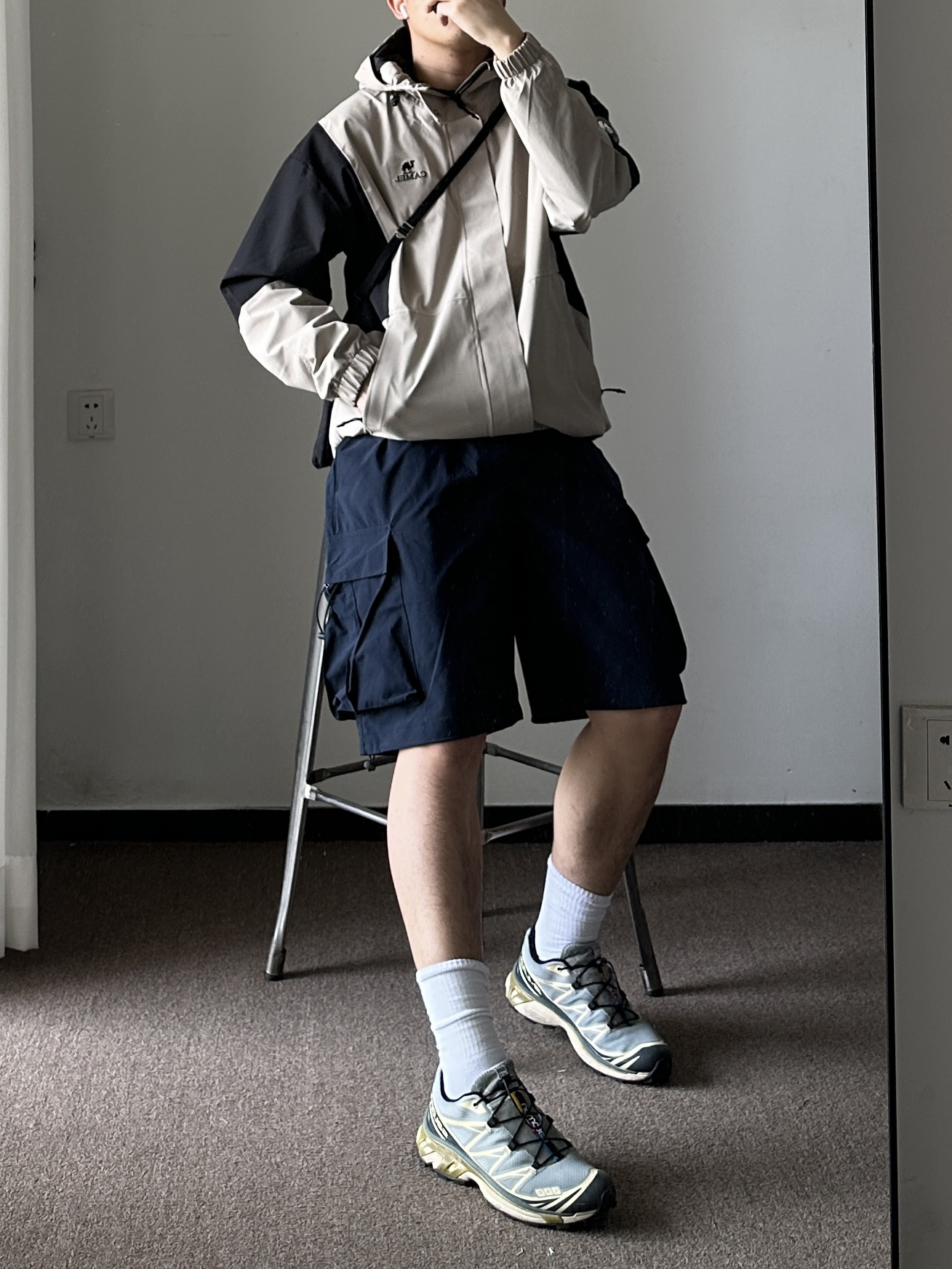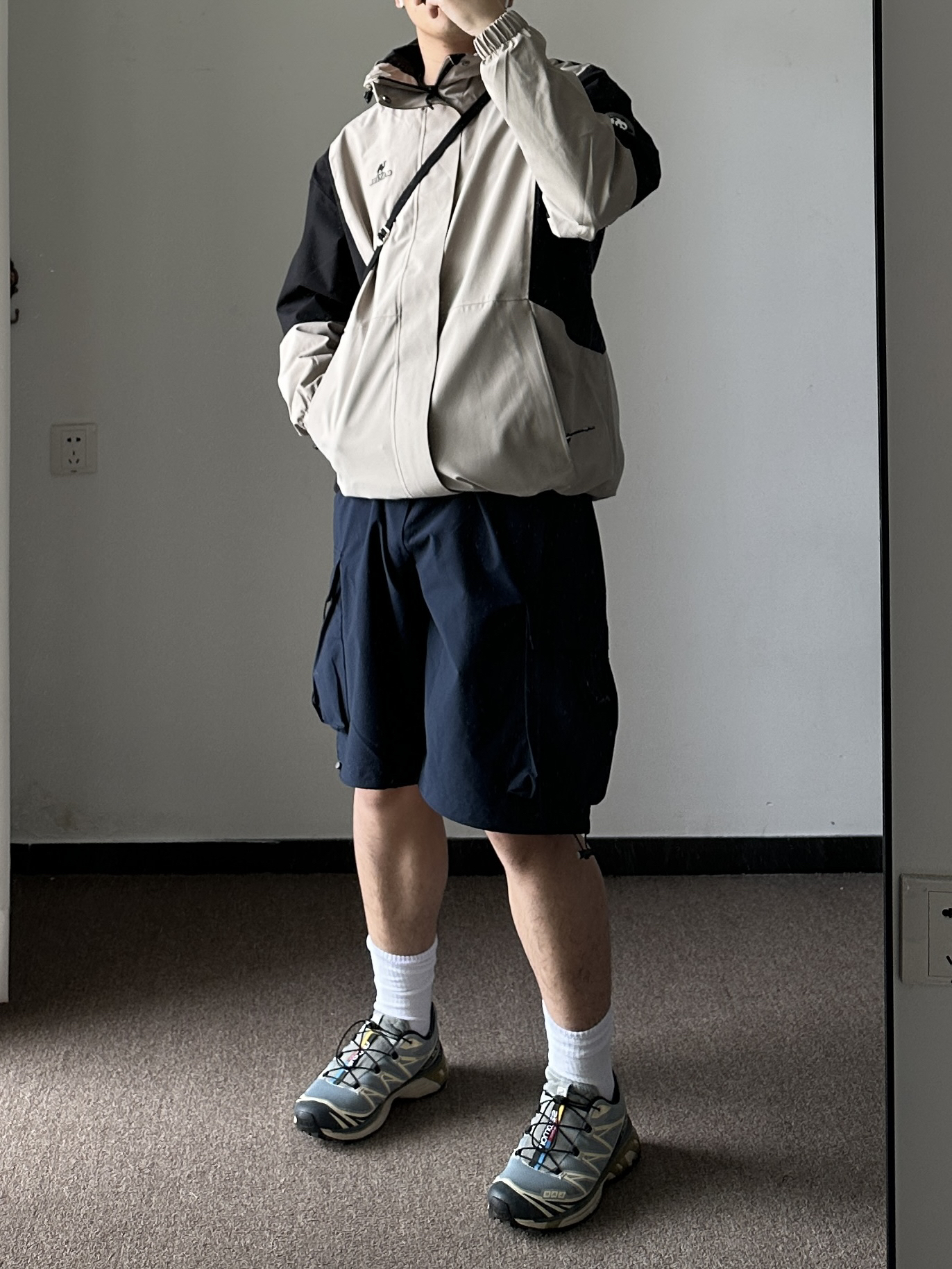 素人也能好看系列~174cm / 65kg 🧥- 穿着好看的三防冲锋衣踏春去了,面上的水珠一丝不挂,性能不赖呢。浅卡其搭黑色拼接,这个配色yyds! 👖- 来条藏青色机能工装裤吧! 👟- XT6