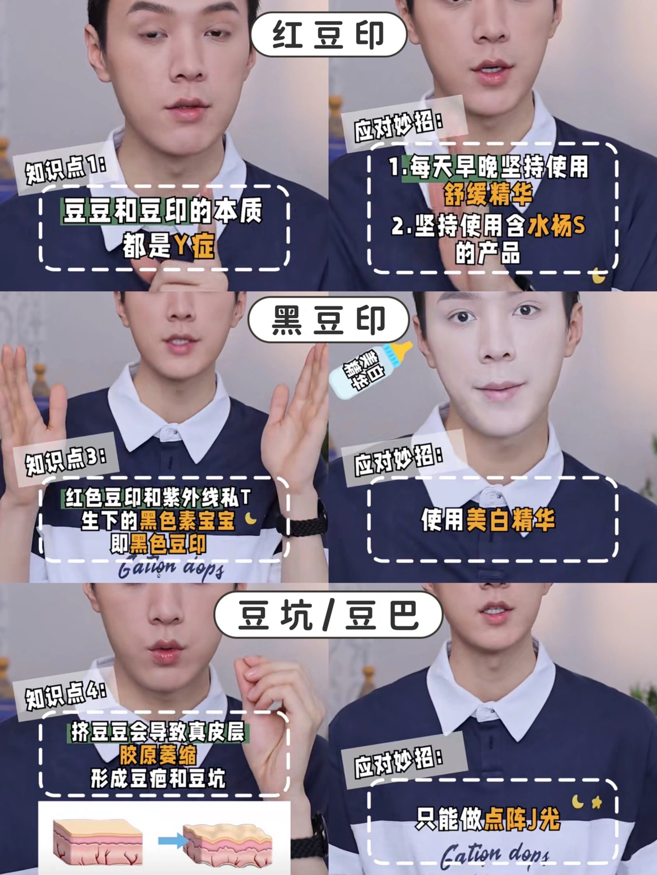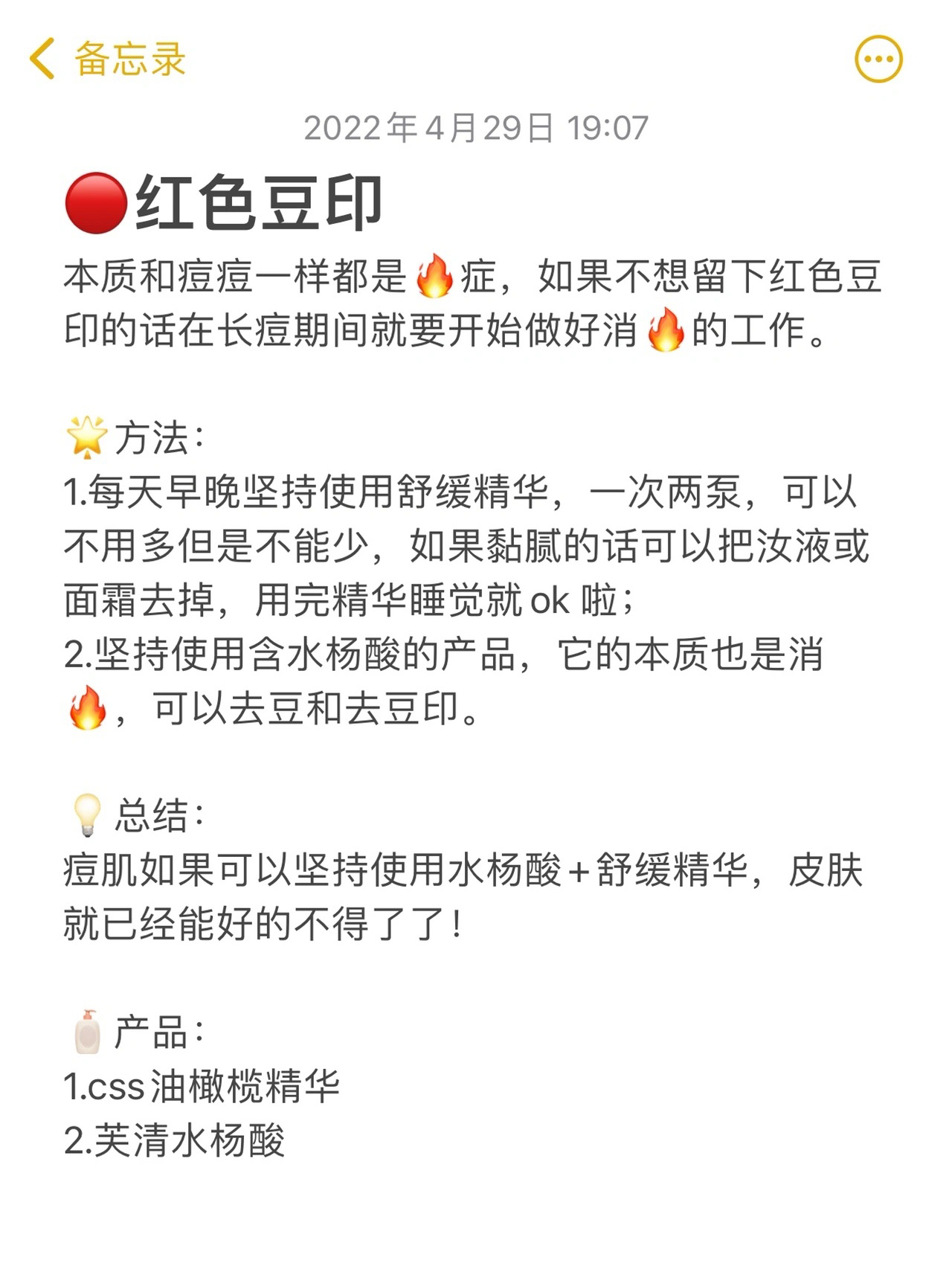 跟着大娘去红黑豆印❗️满脸印到干净脸✨|||身为一个长了10多年痘痘的老痘肌人告诉你们,骆王宇这个去豆印方法亲测真的🉑️❗️ 具体方法如下👇 🔴红色豆印 本质和痘痘一样都是🔥症,如果不想留下红色豆印的话在长痘期间就要开始做好消🔥的工作。 🌟方法: 1.每天早晚坚持使用舒缓精华,一次两泵,可以不用多但是不能少,如果黏腻的话可以把汝液或面霜去掉,用完精华睡觉就ok 啦; 2.坚持使用含水杨...