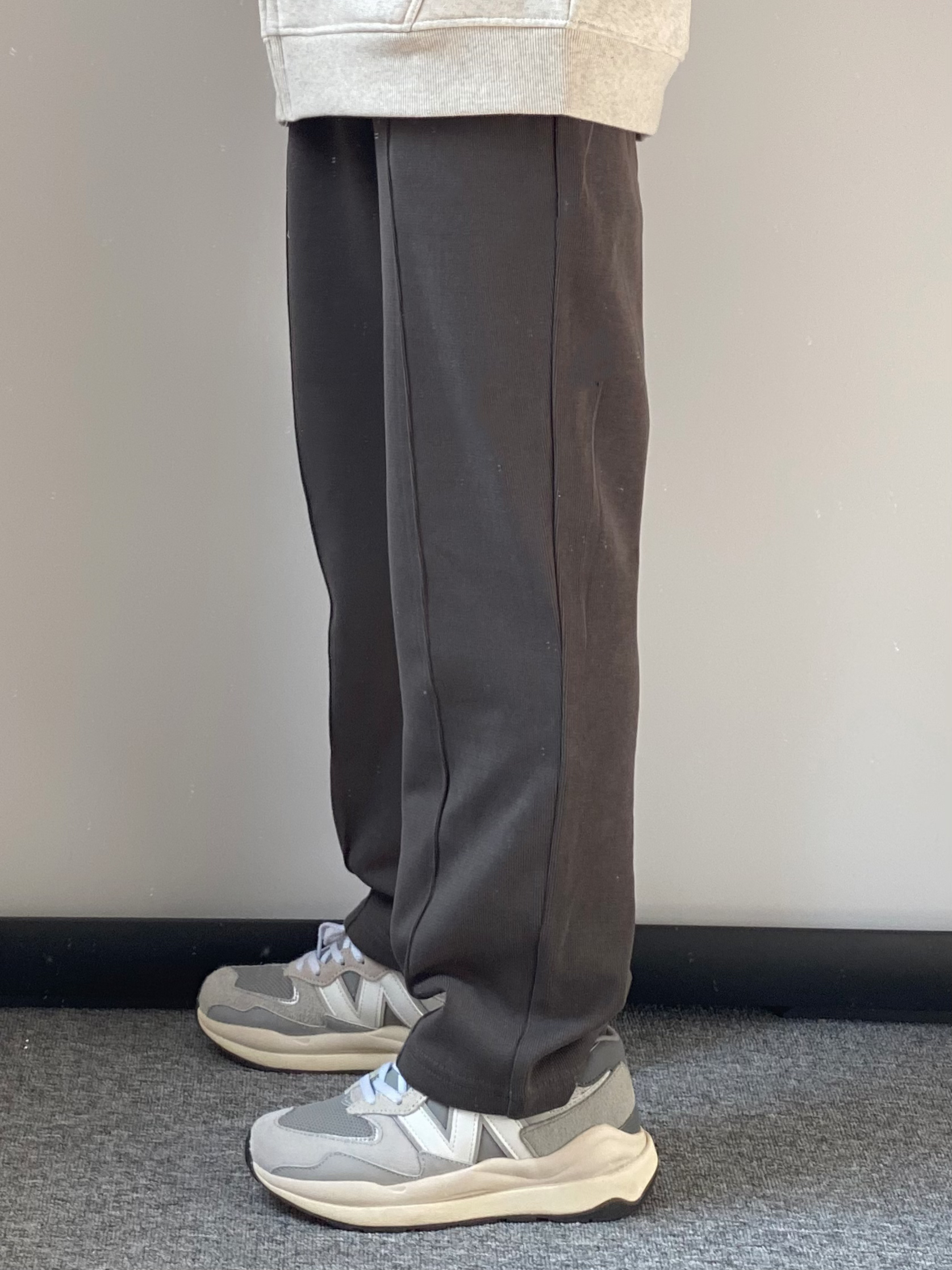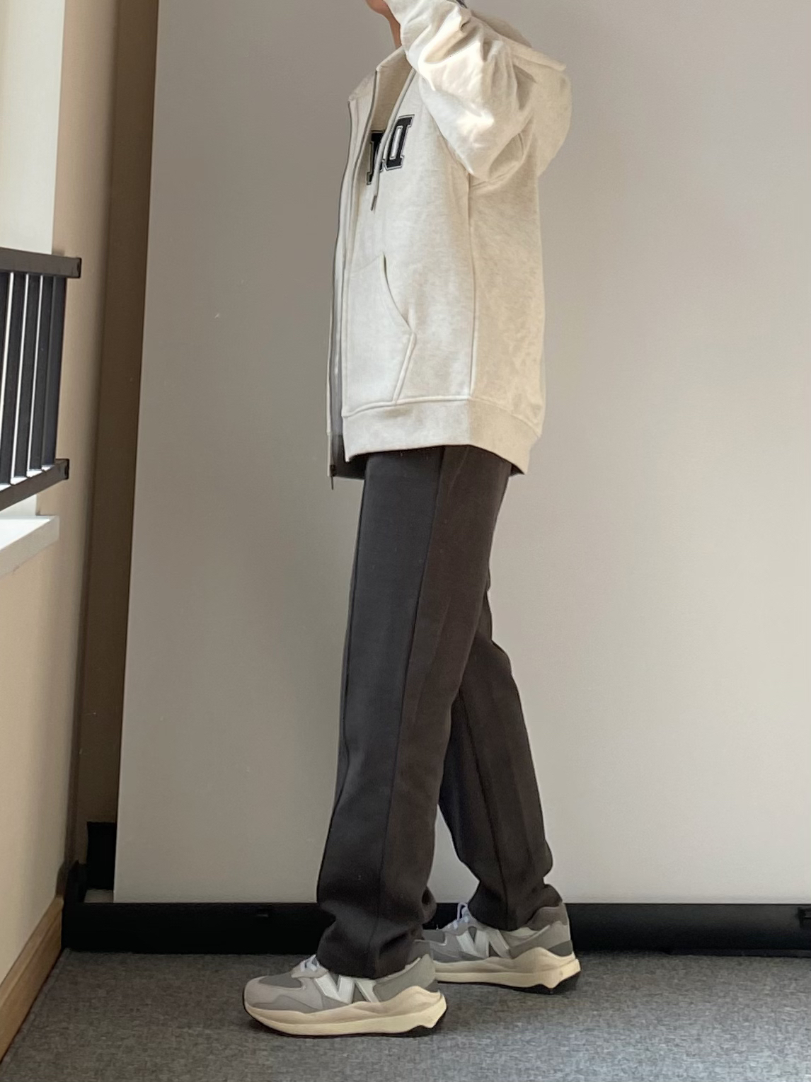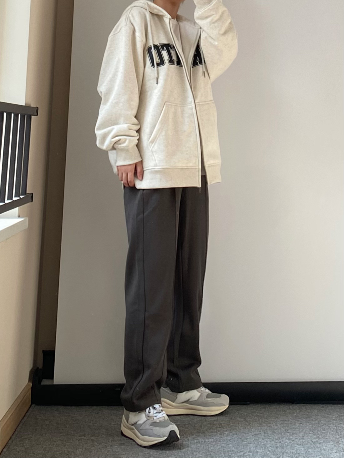 hello兄弟们 马上开春啦 分享一套很适合春天穿的搭配 👖灰绿色的直筒休闲卫裤 针织的垂感面料 搭配加绒的浅灰色开衫外套 👔👖一套白告studio