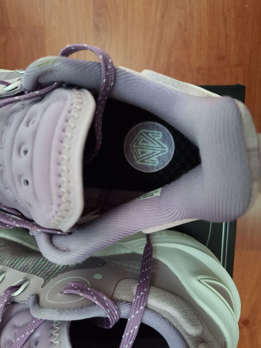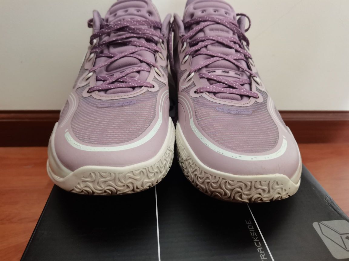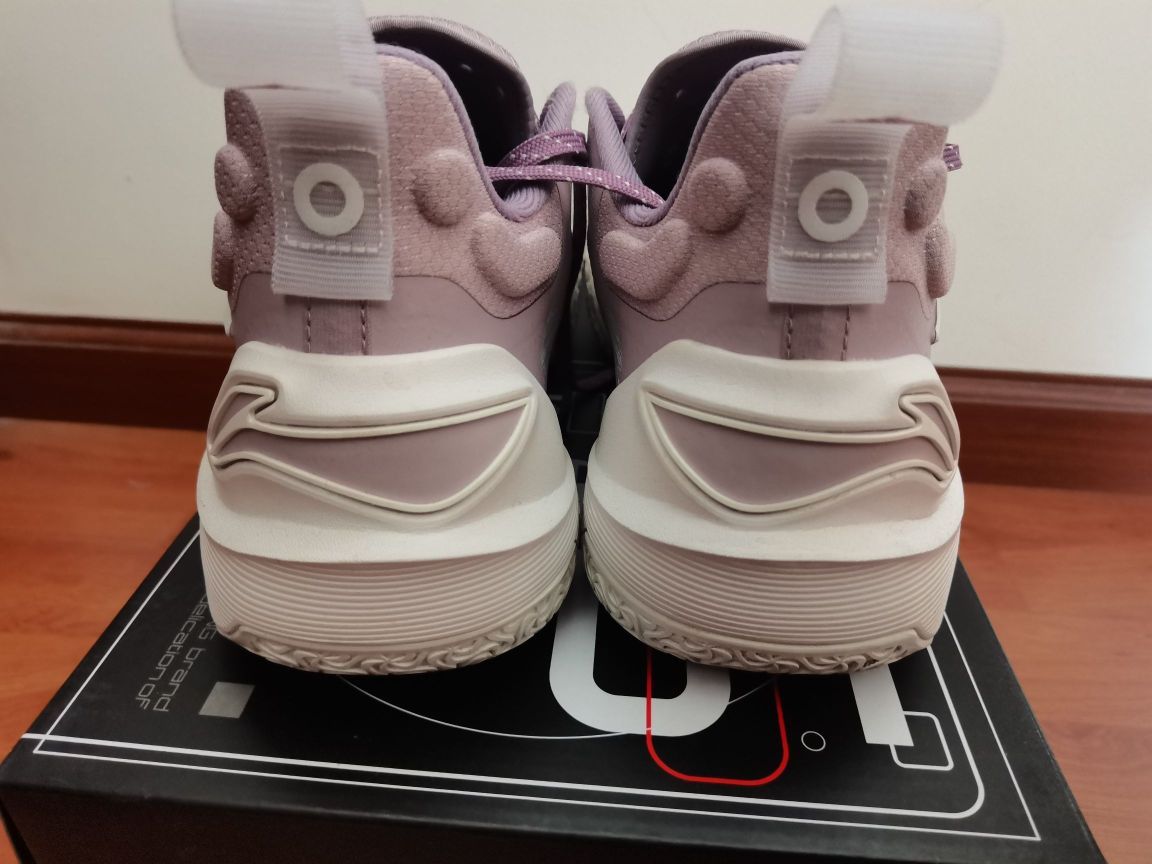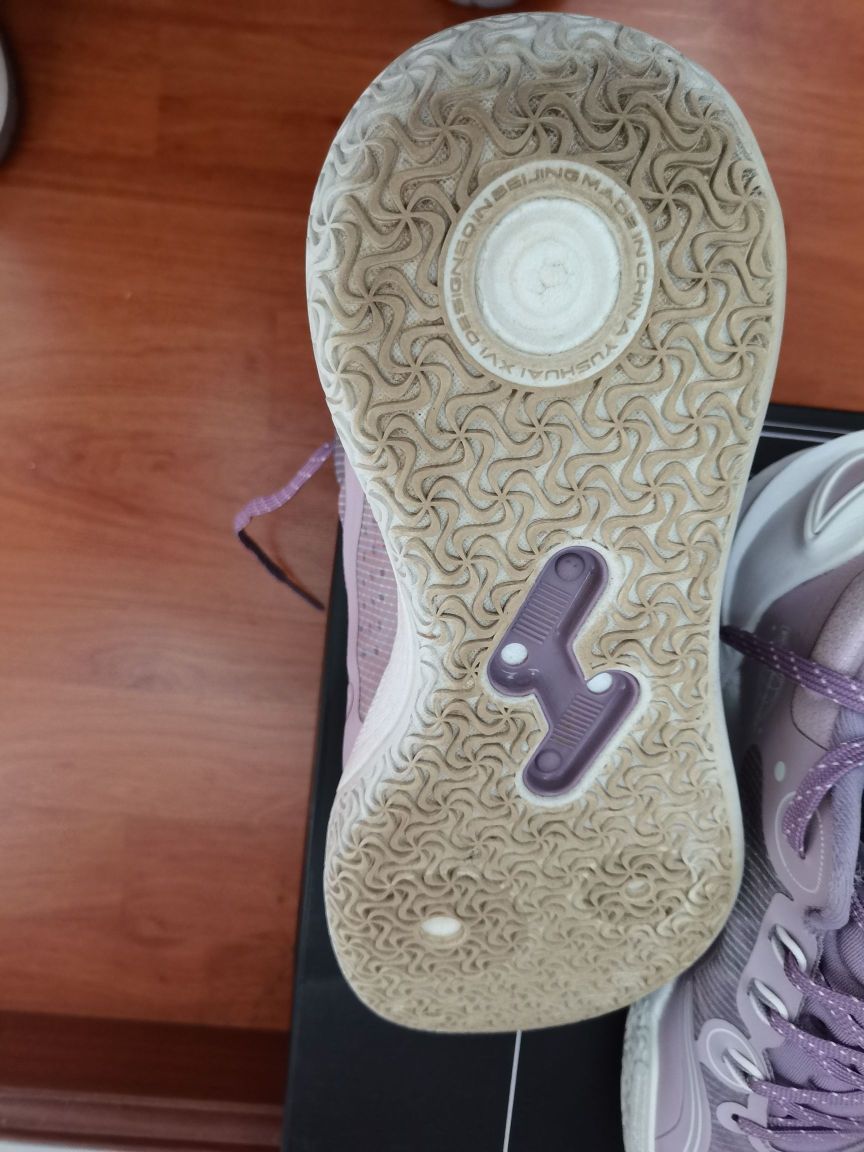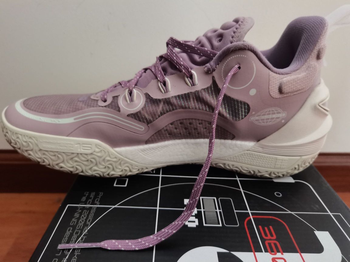 驭帅16v2也打了六场,简单谈谈我的实战初体验。 1⃣颜值,我认为是非常帅的,比高帮帅好多,质感也非常好,这个配色奶白和紫色搭配一绝,李宁标也简约大方。 2⃣重量,41单只360克左右,比高帮轻量化厉害太多。 3⃣中底,全掌䨻(我不清楚是什么䨻,没有驭帅14䨻首发哪几个配色的强烈塑料感,但我穿起来没什么区别)十分软弹,加上中底稳定系统,抗扭也没毛病,稳定性非常好。 4⃣鞋楦,我是标准偏瘦脚,但这鞋...