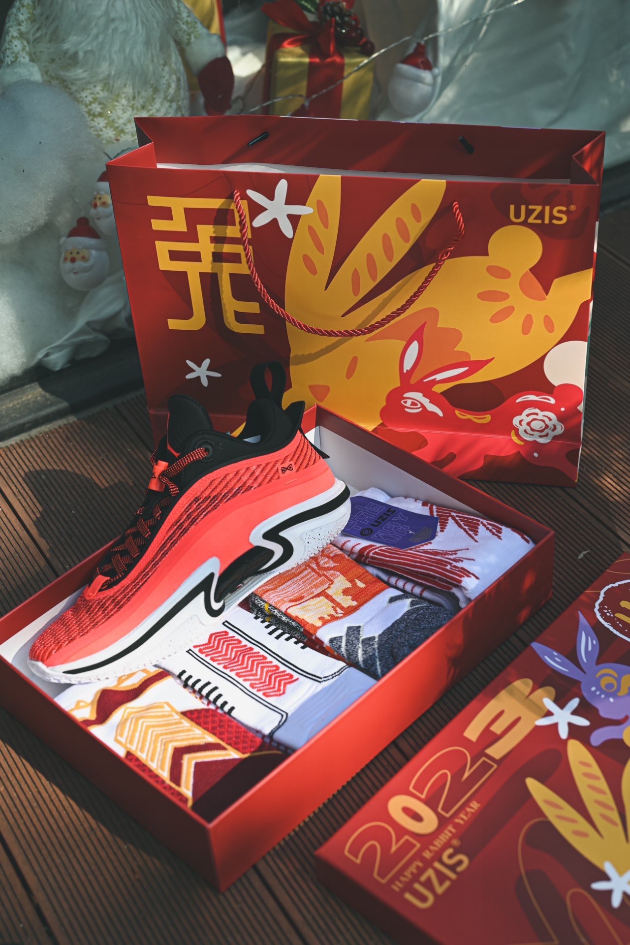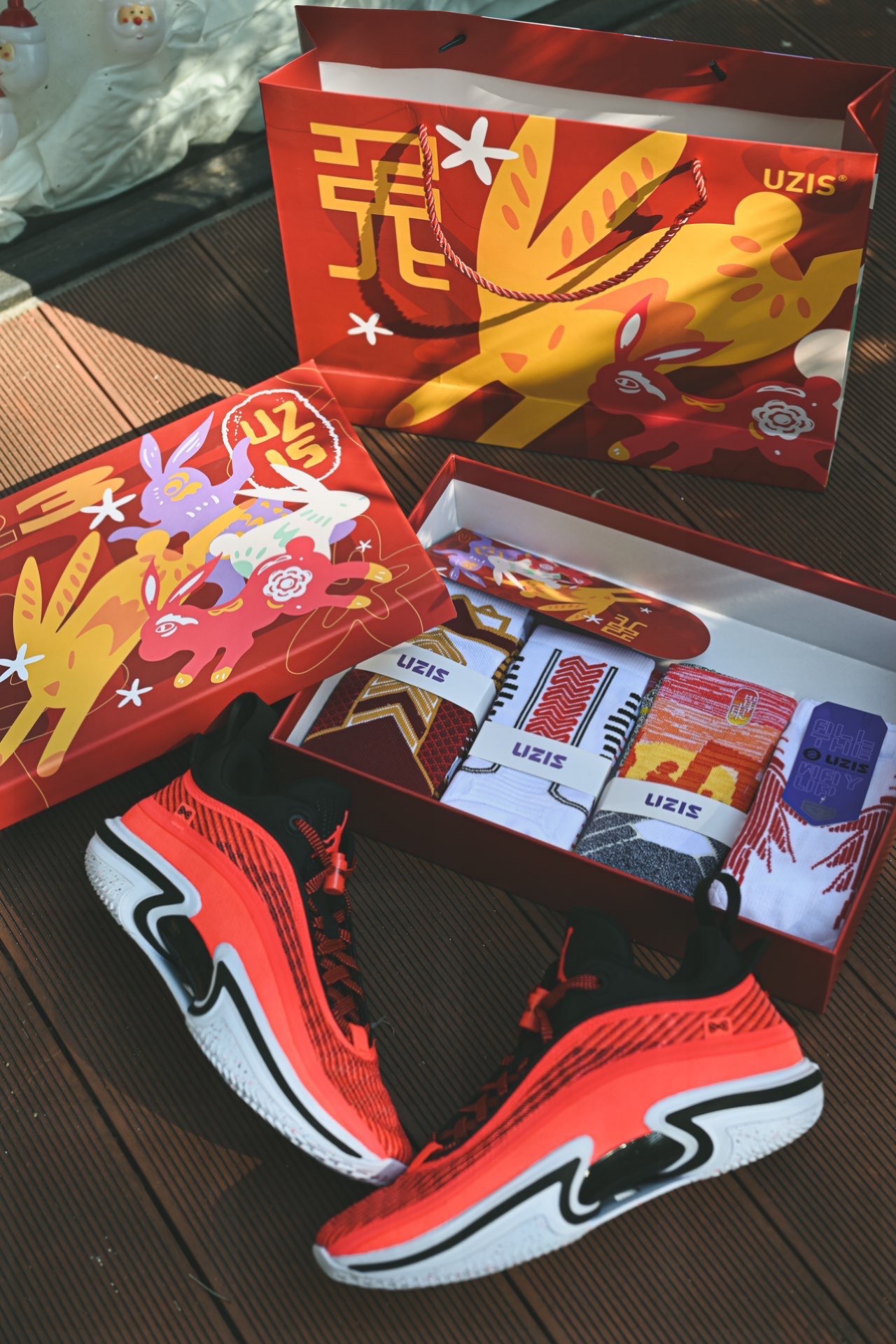 今天分享一个非常适合男生的新年礼盒! 来自 #UZIS 的兔年球袜礼盒绝对是非常适合送打球的男生或者是亲朋好友的最佳选择!包装非常精美,礼盒和手提袋都是大红色,里面配有4双不同设计语言的实战篮球袜! 不同款式可以穿着在不同的场合上,一个礼盒解决不同的场景需求,在新年穿更是每一个都很适合 AJ36的低帮红外线配色和这个礼盒非常搭配,都是喜庆的正红色,上脚明显感受到气垫带来的澎湃感,非常好穿的一...