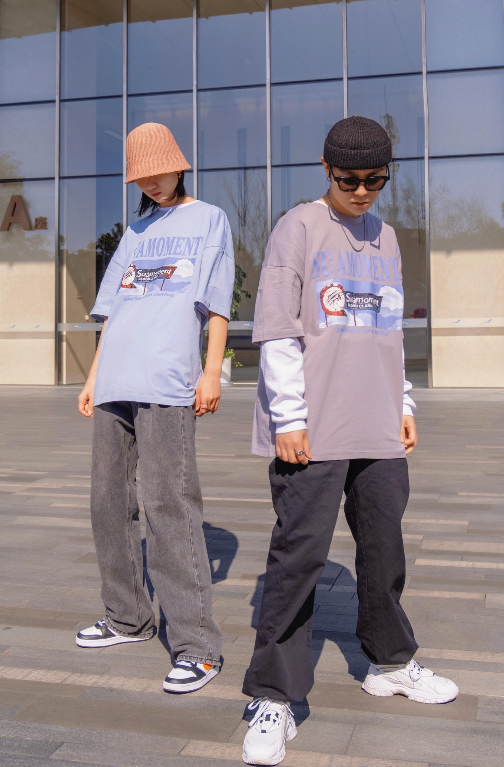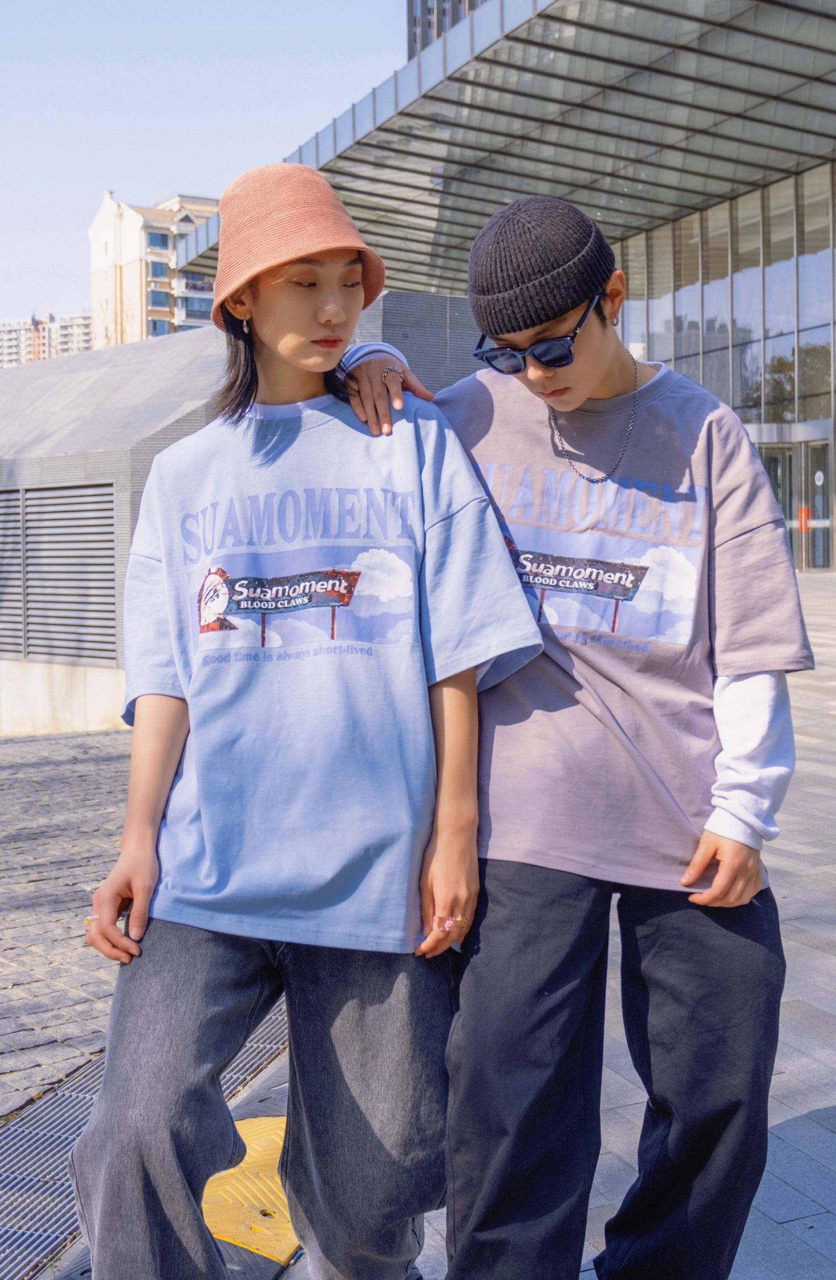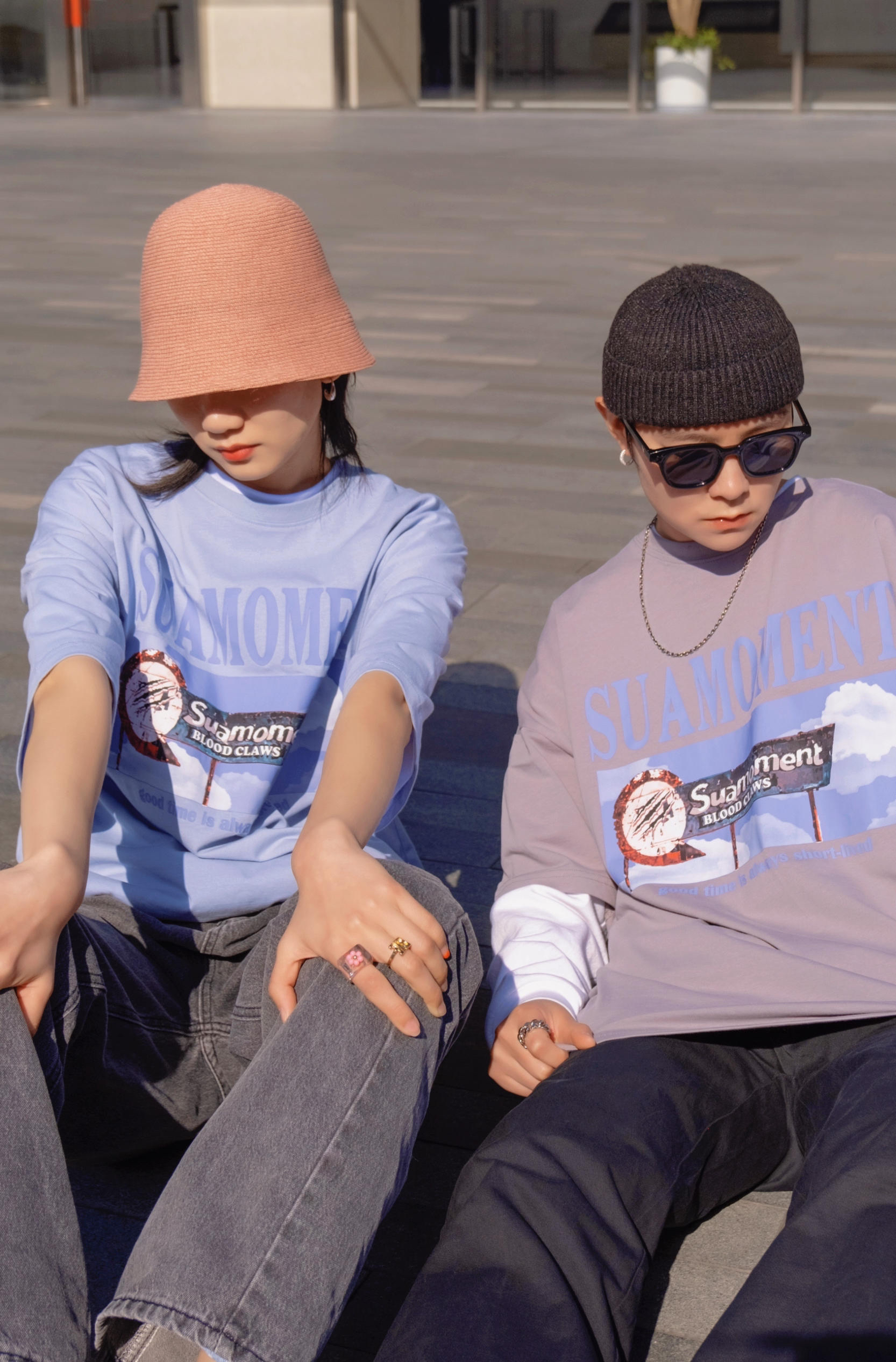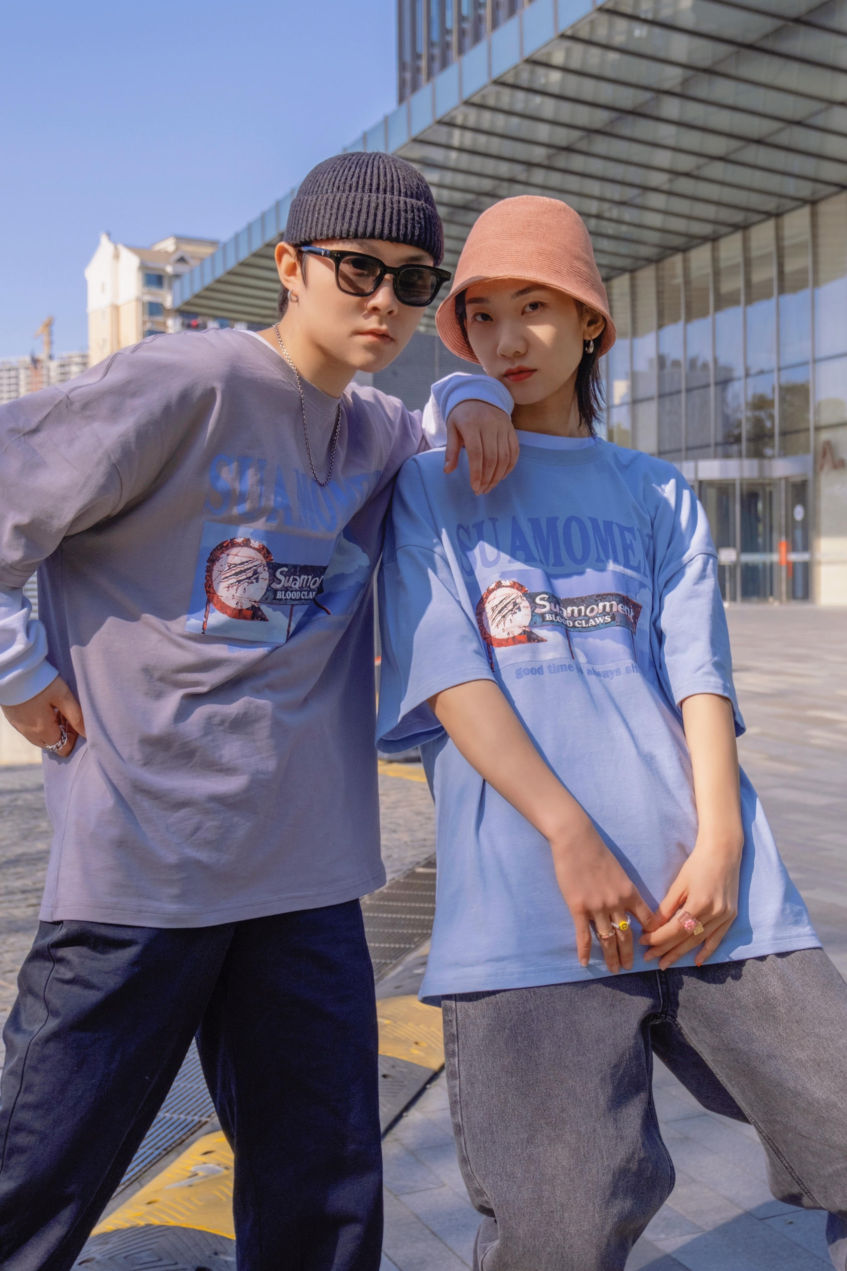 比起穿得一摸一样 情人节约会穿同款不同色也是个不错的选择 穿搭指南: 今天是低饱和的马卡龙色系 就跟色调一样 想马卡龙一样甜甜的太适合七夕来穿了 👧浅蓝色搭配水洗老爹牛仔裤 来顶亮色渔夫帽 👦浅灰色搭配黑色休闲裤 加顶黑色瓜皮帽 不同的搭配但都是偏街头休闲的 情人节出去玩 这样穿就够了
