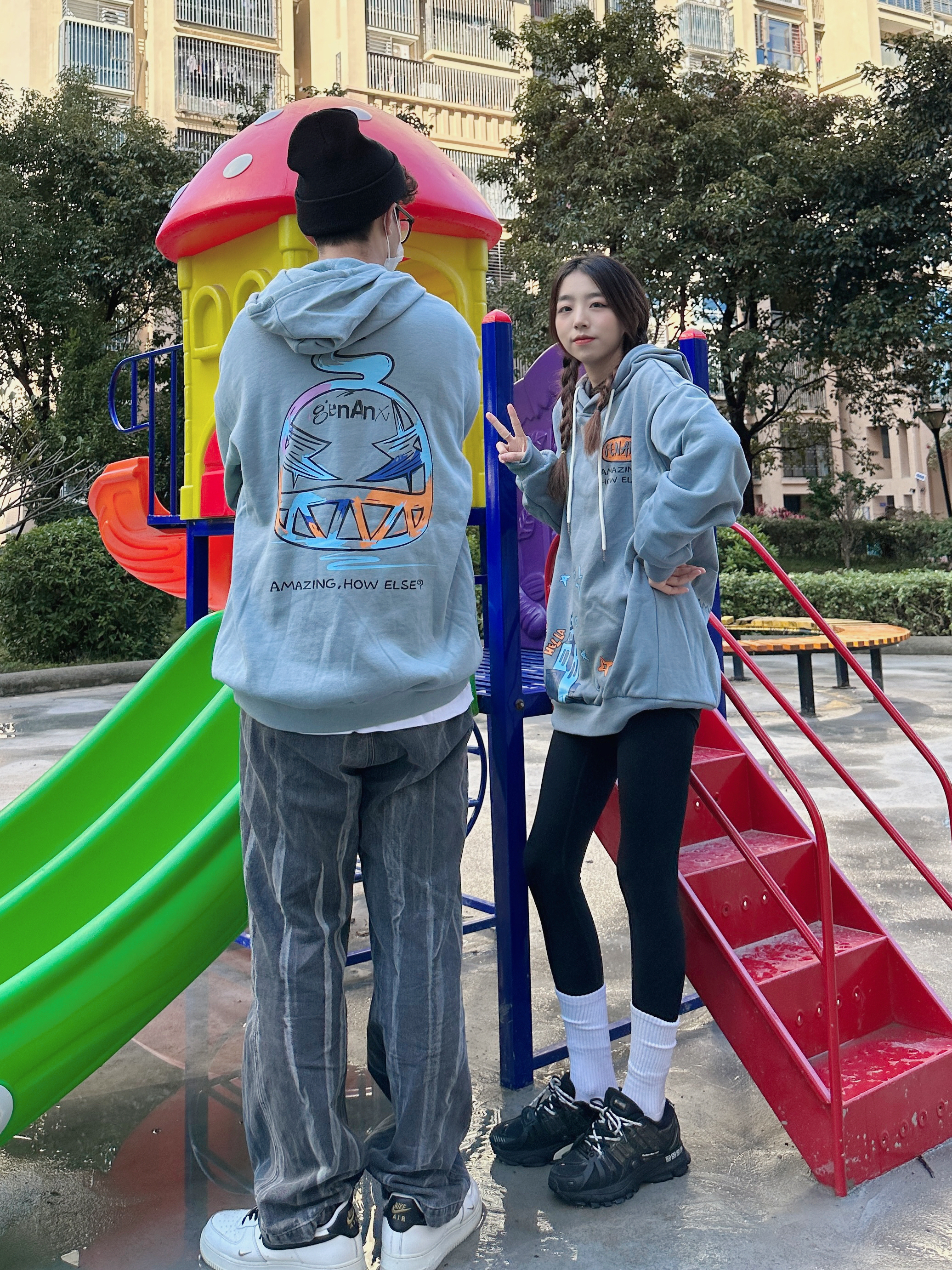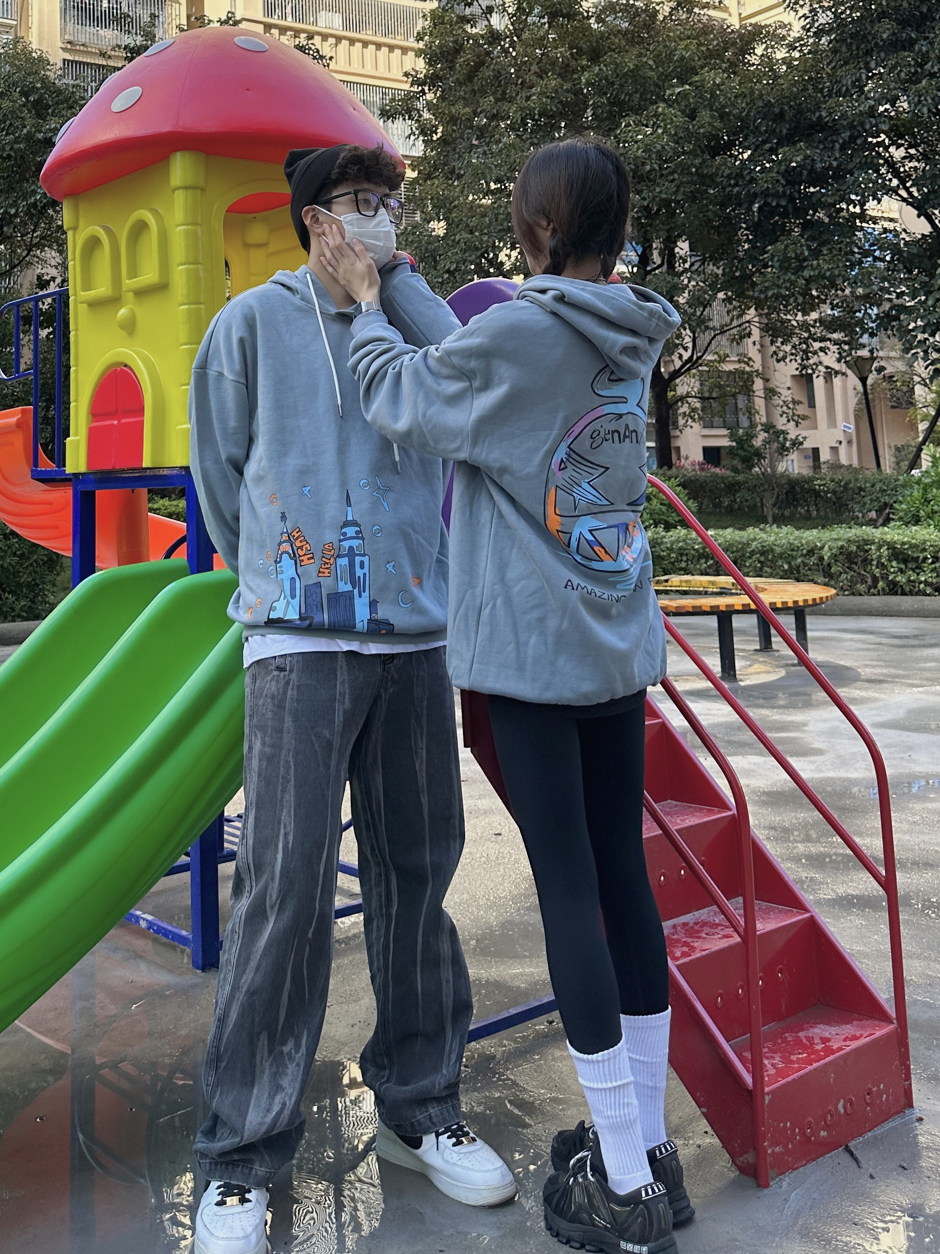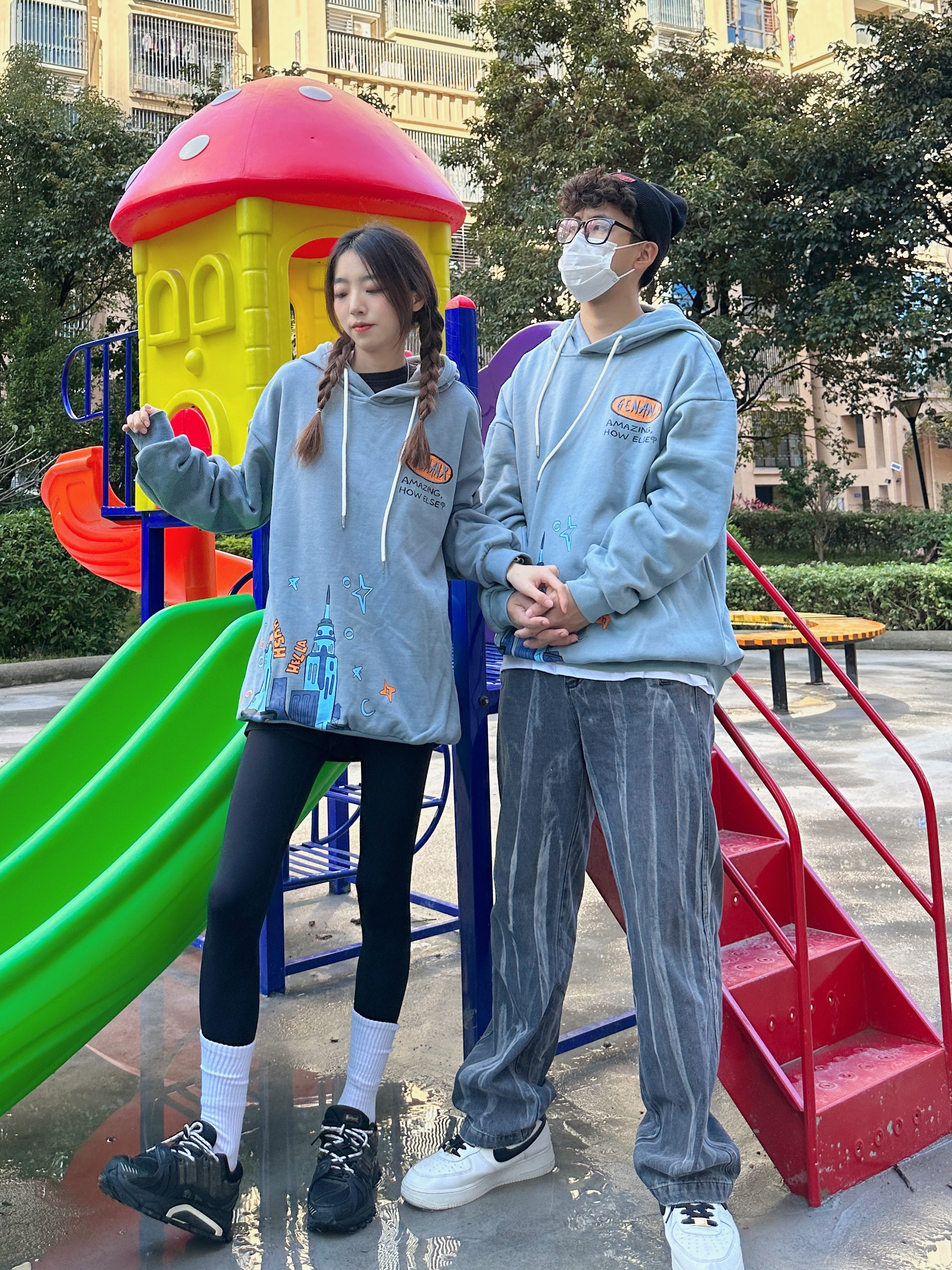 欢迎大噶来到我们情侣穿搭频道💗 👧:168/44 👦:182/70 冬天无论是内搭还是单穿都少不了连帽卫衣 最佳时尚单品~get到灰蓝色了耶 穿起来很🆒 卡通城堡🏯的图案 有点意思~ 喜欢版型好的卫衣 穿起来就很苏胡 加绒的设计在南方的冬天我觉得🉑️!