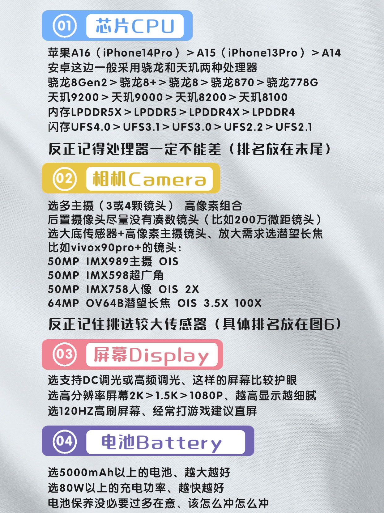 看完本文、相信可以解决你的选机难题、共9张图(建议直接看图文)。 以下是关于选机的一些注意事项📋 - ✅CPU - 苹果A16 (iPhone14Pro )> A15 (iPhone13Pro)>A14 安卓这边一般采用骁龙和天玑两种处理器 骁龙8Gen2>骁龙8+>骁龙8>骁龙870>骁龙778G 天玑9200>天现9000>天玑8200>天玑8100 LPDDR5X>LPDDR5>LPDDR4...
