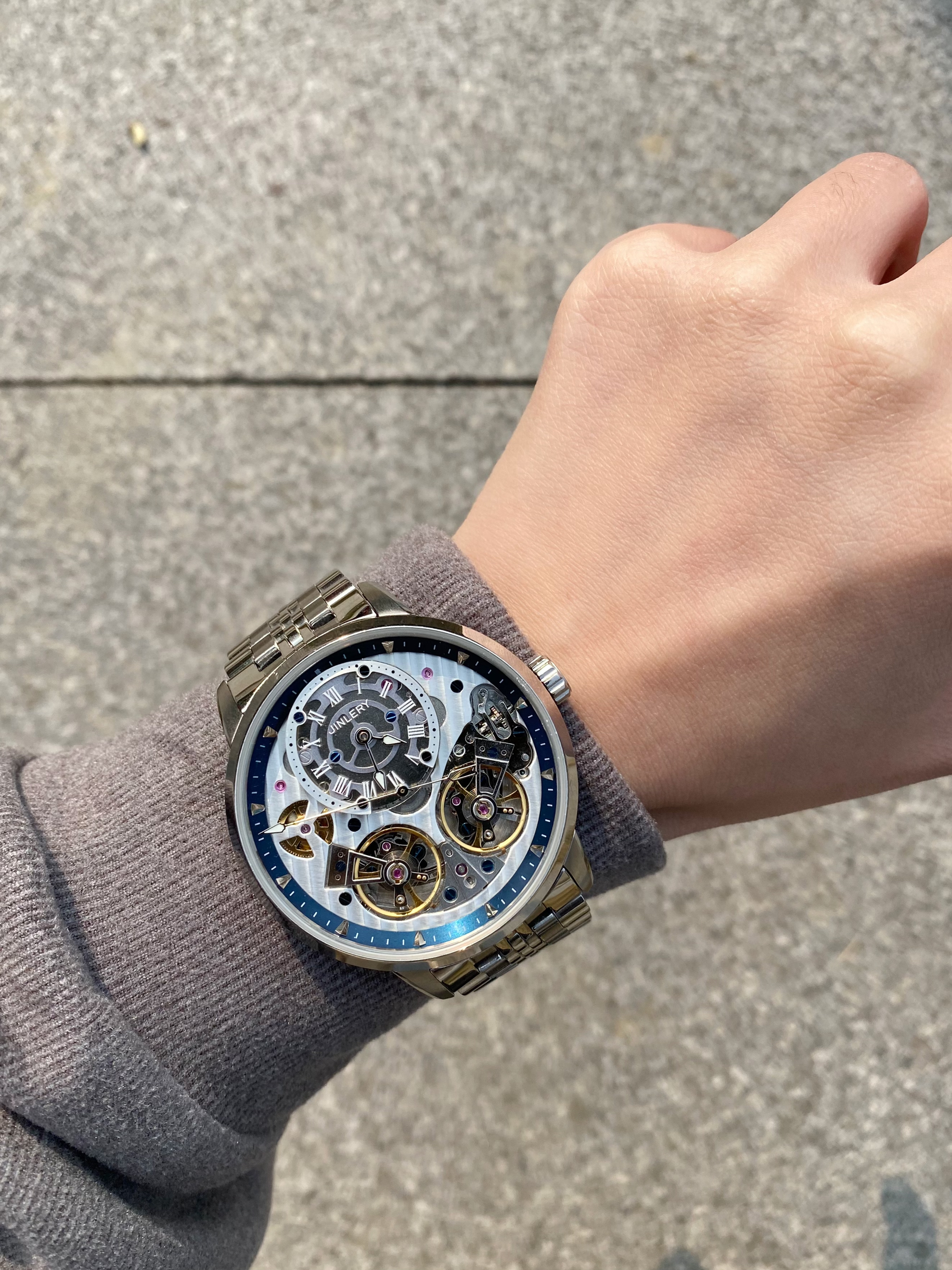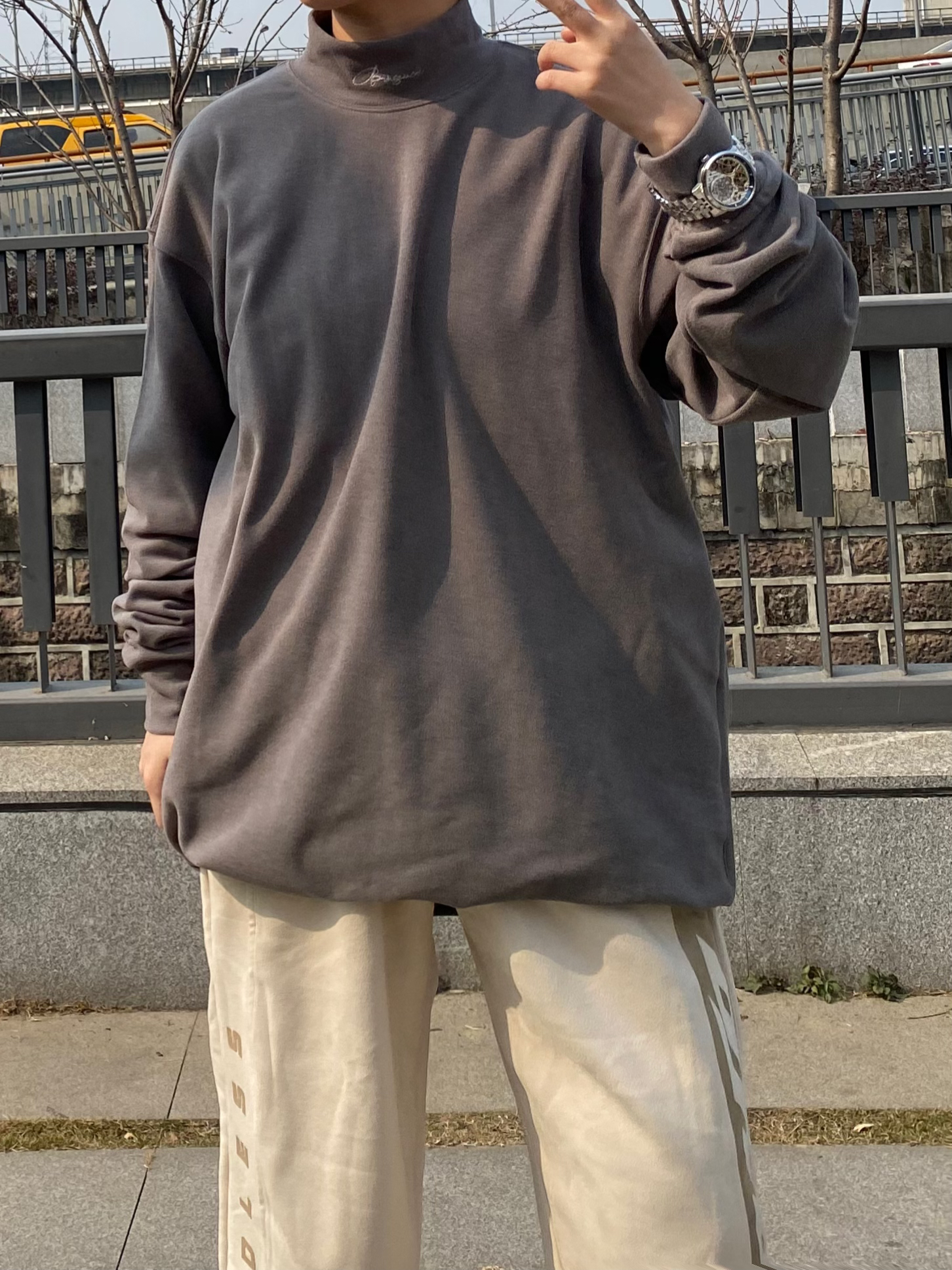 南方已经开始进入春天啦~ 早春尝试一下卫衣十卫裤搭配 BJHG的深灰色高领卫衣 摇粒绒面料很保暖 👖搭配 BJHG侧边拼接的奶茶色皮束脚裤 摸起来很有质感 ⌚️搭配精利JINLERY双飞轮系列机械表 适合男生日常佩戴