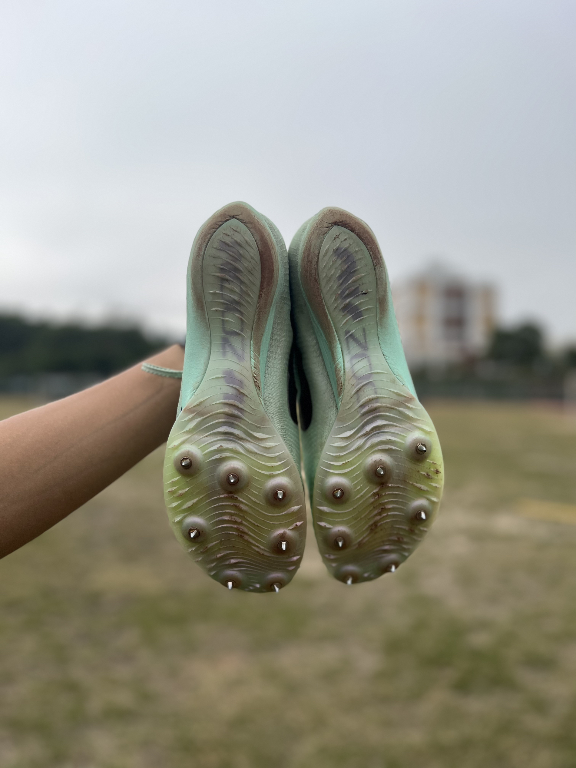Nike Air zoom Max fy 青绿配色🧩 鞋款特点: 1.前掌Z00m Air 气垫缓震配置,拥有舒适且缓震的回弹效果 2.全掌碳纤维板,具有出众推进力和稳定的脚感 3.后跟超轻泡棉缓震,高效回弹效果 4.梭织织物与合成材质组合鞋面,提供优秀包裹性 5.凹口鞋带,跑步途中不易松开 苏炳添9"83亚洲纪录同款 苏炳添2021全运会冠军🏆同款 此款鞋型适用干100m到400m 短跑及跨栏