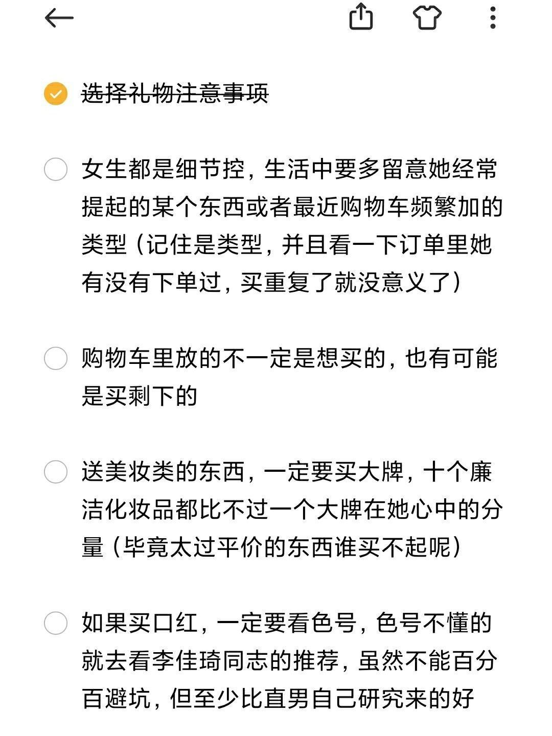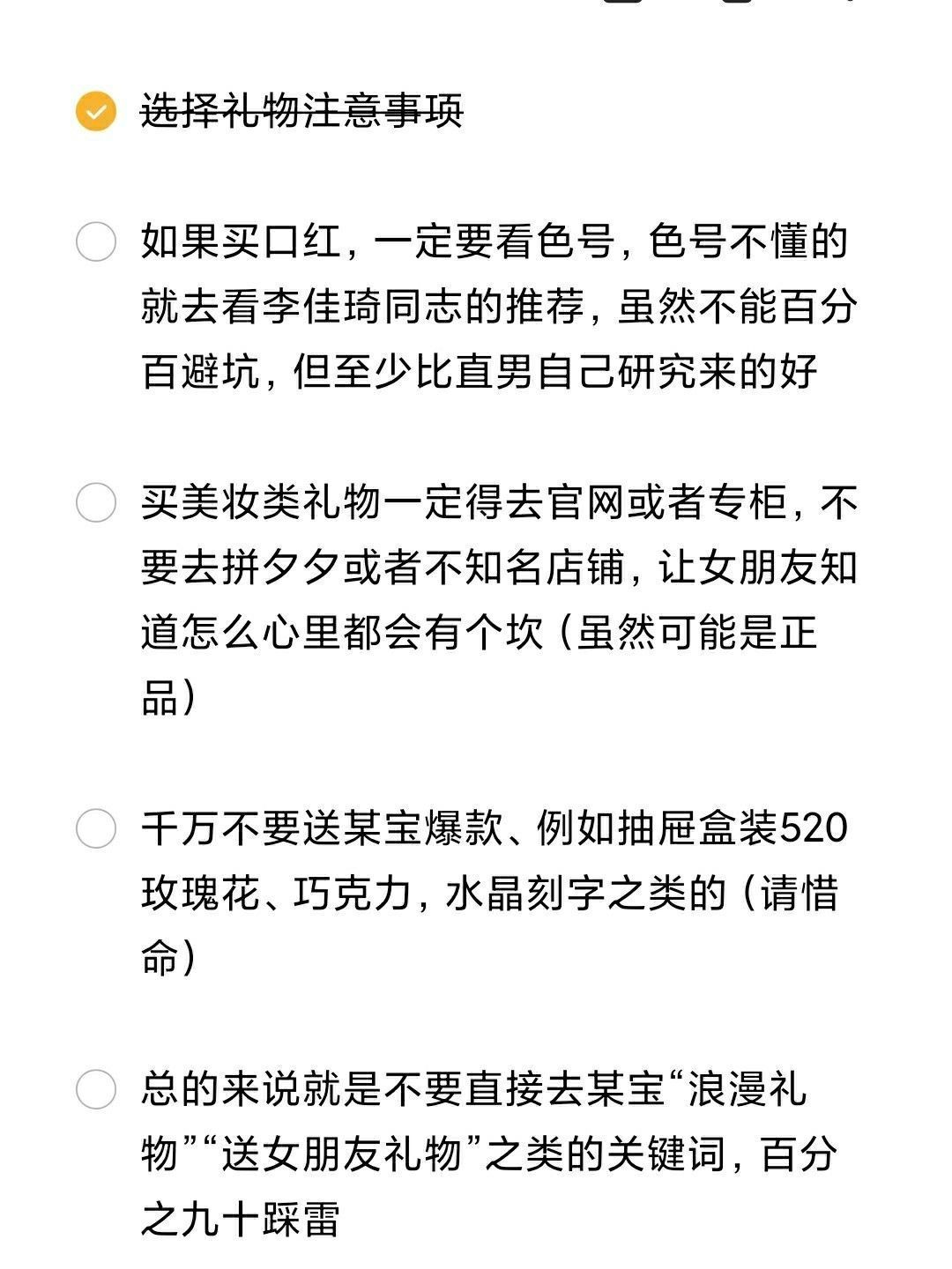 送女朋友礼物清单 拒绝踩雷 | 美妆篇 新年、情人节就快来了,女神节也不远了,是不是还在纠结送女朋友什么。 都知道女生最爱的是美妆,但就是不懂怎么挑?今天就出一期详细的美妆清单,看着挑准没错 最好的礼物就是合集礼物,一主一辅 美妆类+浪漫类 美妆类+实用类+可爱类 实用类+浪漫类 结合起来才算一个好礼物,又解决礼物的实用性又解决了浪漫性 送女生礼物最重要的两个点:实用、可以发朋友圈或跟姐妹分享 下...