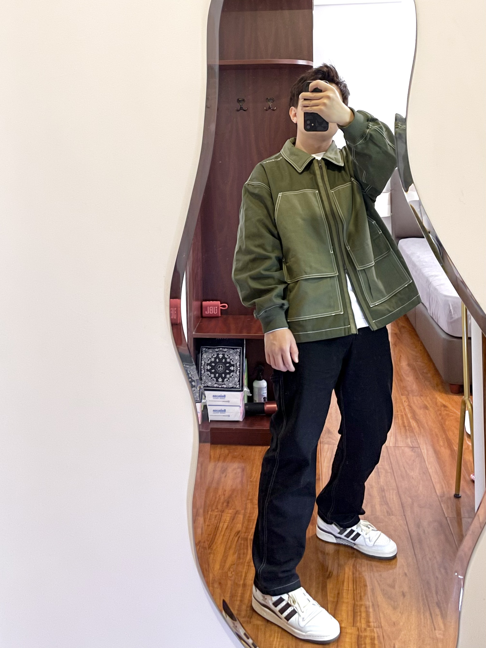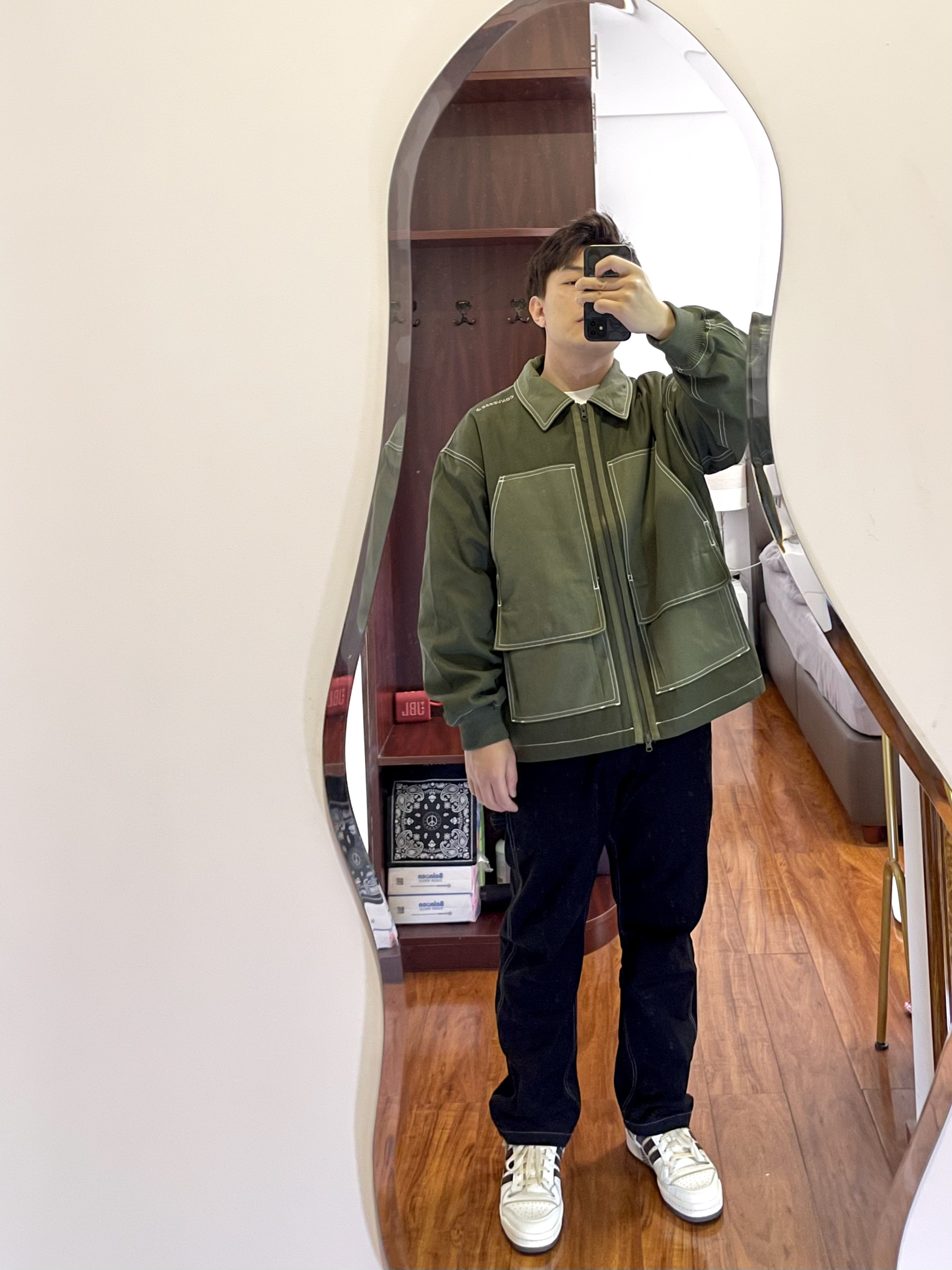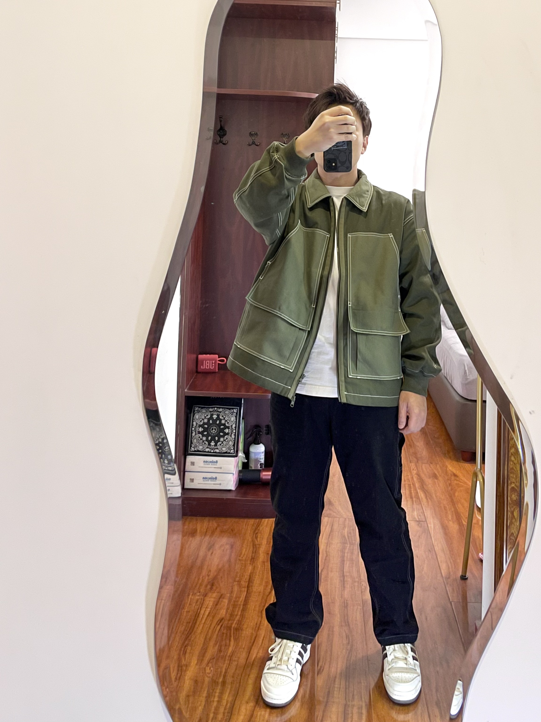 170/135斤 👔 Converse 工装夹克 M 👖 GU 黑色工装裤 M 👟 Adidas forum84 摩卡色 41 外套军绿色拼接夹克内里还有夹棉,外层面料有类似于帆布的面料,还有双拉链可以上下拉。 裤子也是工装长裤,侧面有个小口袋和裤带。 工装风又火起来了,日常搭配简单方便 我这算不算cleanfit吗?