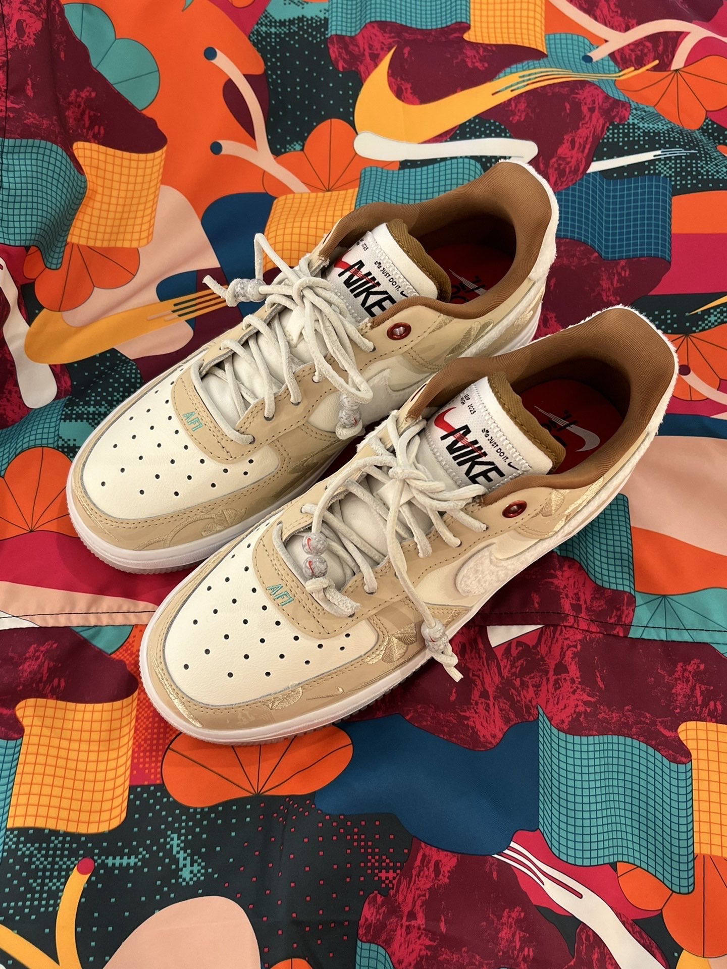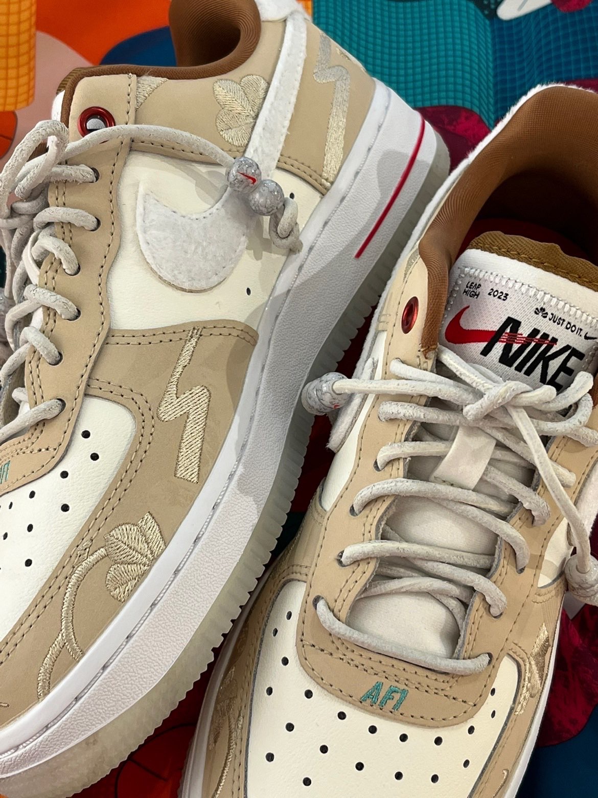 🐇2023耐克的兔年限定,巧妙融合了中国风元素,实物颜值是真的好看,尤其是米色这双空军,丝毫不输男款的白红空军!!! 👟Nike Air Force 1 Low“CNY”兔年🐇低帮 板鞋 女款 米色 ✔️侧边钩子和后跟,采用兔子兔毛一样的绒毛设计,摸起来柔软,很有质感~ 💛米白色和奶茶摩卡组成的鞋面,鞋带上加入了可拆卸的珠子配饰,鞋垫上Just Do It经典标语。 ㊗️鞋面上带有松树和柳枝的刺绣...
