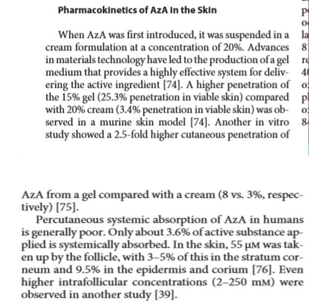 目前现有的研究(图三),在鼠皮肤模型上的渗透率,15%凝胶(25.3%)高于20%乳膏(3.4%),而另外一项体外研究显示,凝胶的渗透率相比乳膏有着2.5倍的差异,这就表明对于壬二酸而言,凝胶剂型优于乳膏剂型