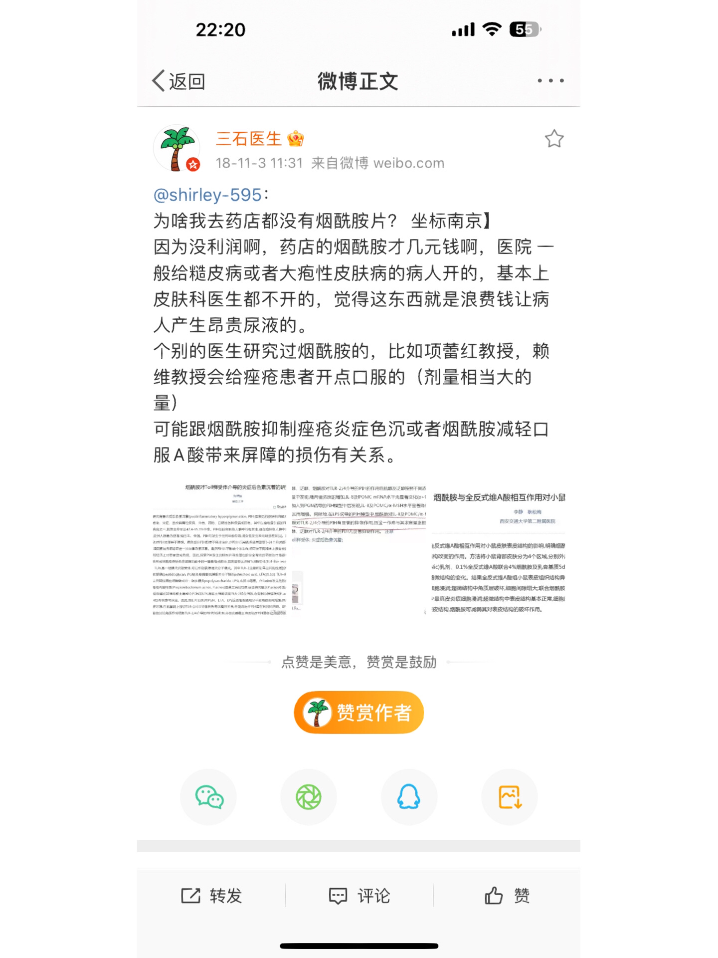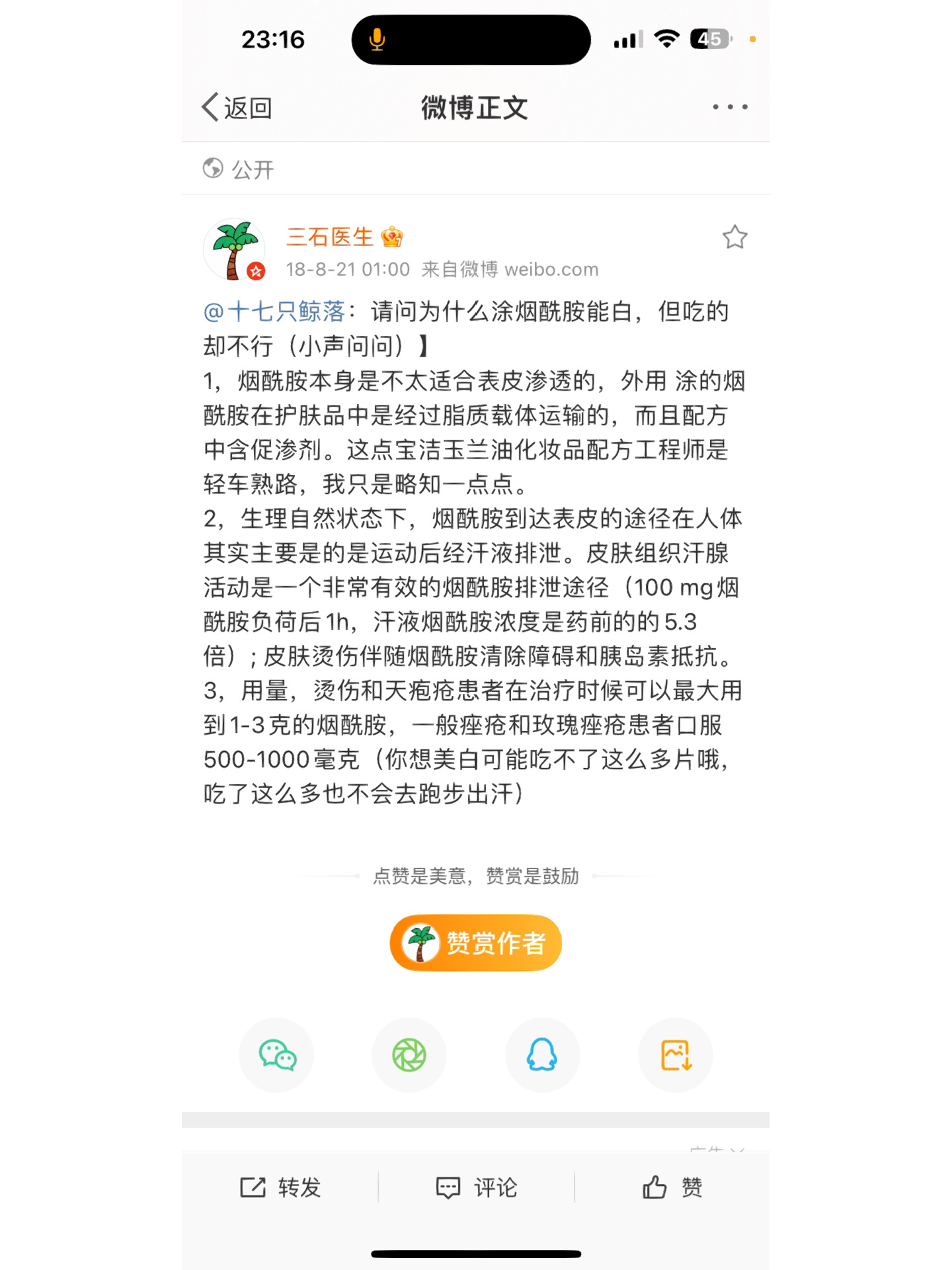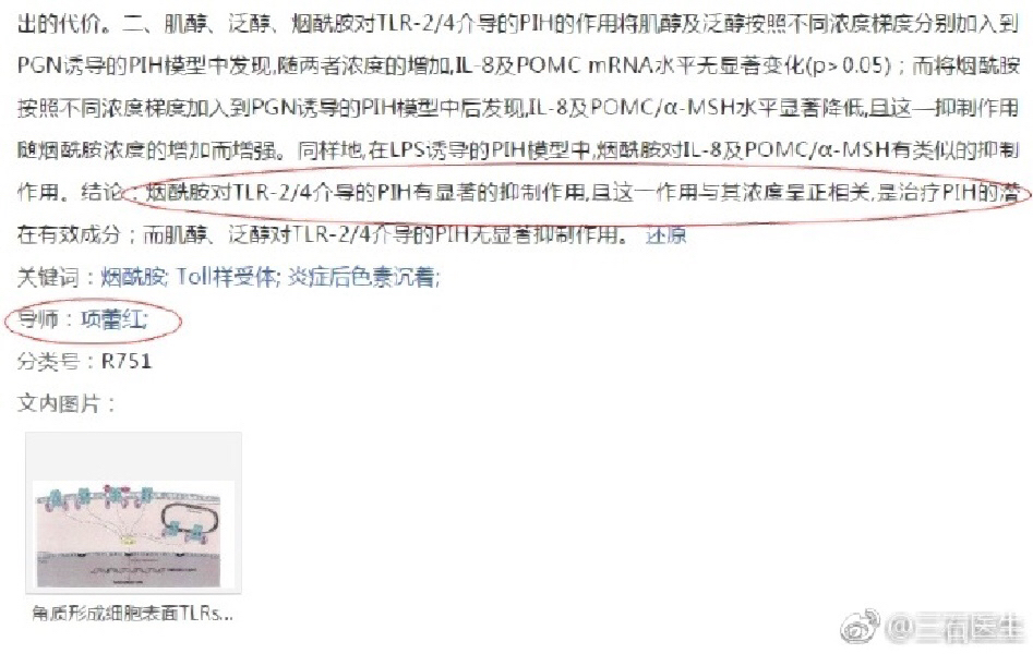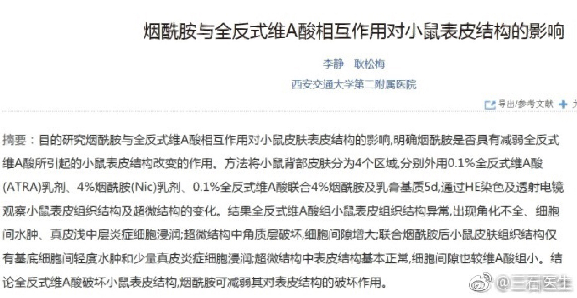 口服烟酰胺最早是在三石医生那里看到的(图二)。想要口服下去的烟酰胺最大程度的被皮肤利用,是一定要去出汗的!吃完卧倒不动不仅不会让皮肤收获烟酰胺的改善,还会危害肝脏,因为烟酰胺通常情况下是通过肝脏代谢,过多的烟酰胺会给身体增加负担,而通过汗液尽快将其代谢干净,能使得烟酰胺在安全的前提下效果最大化
