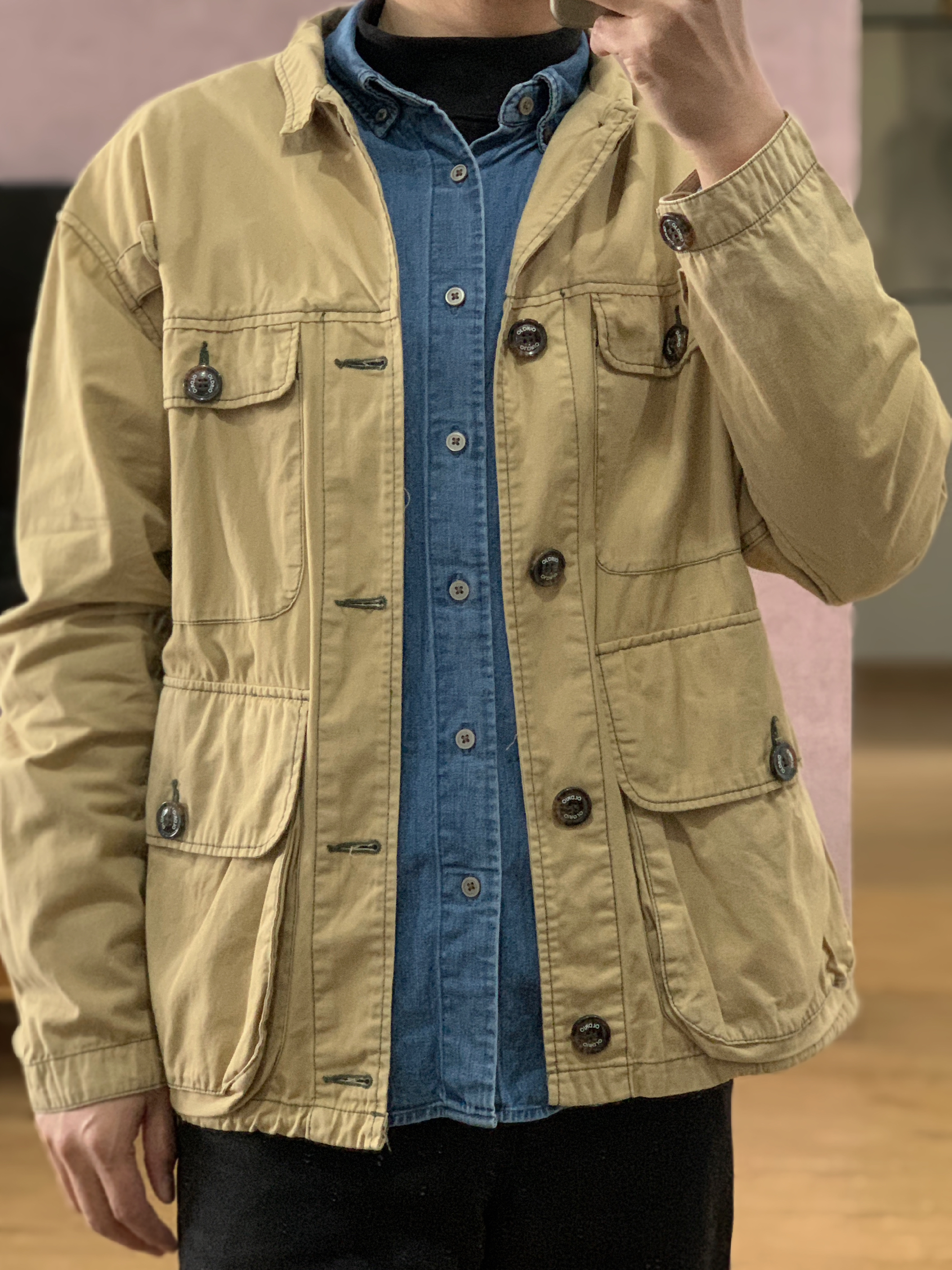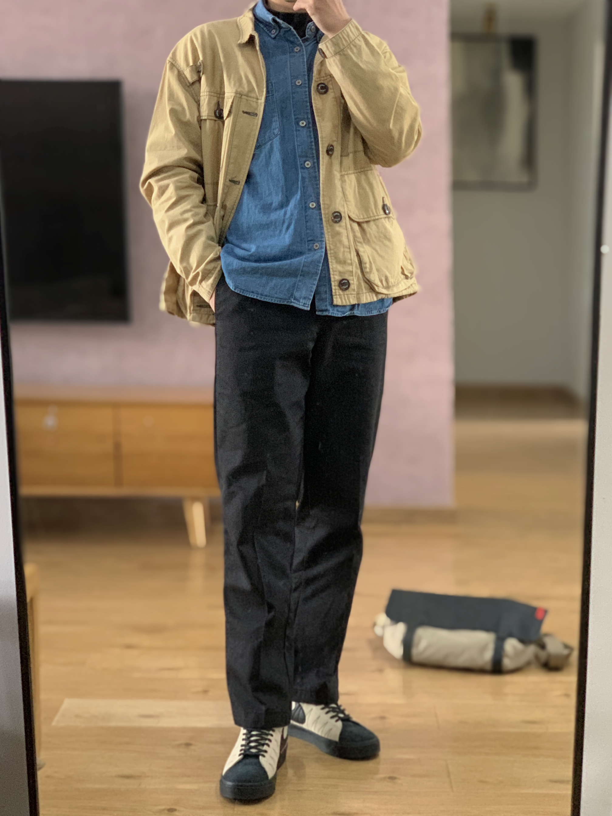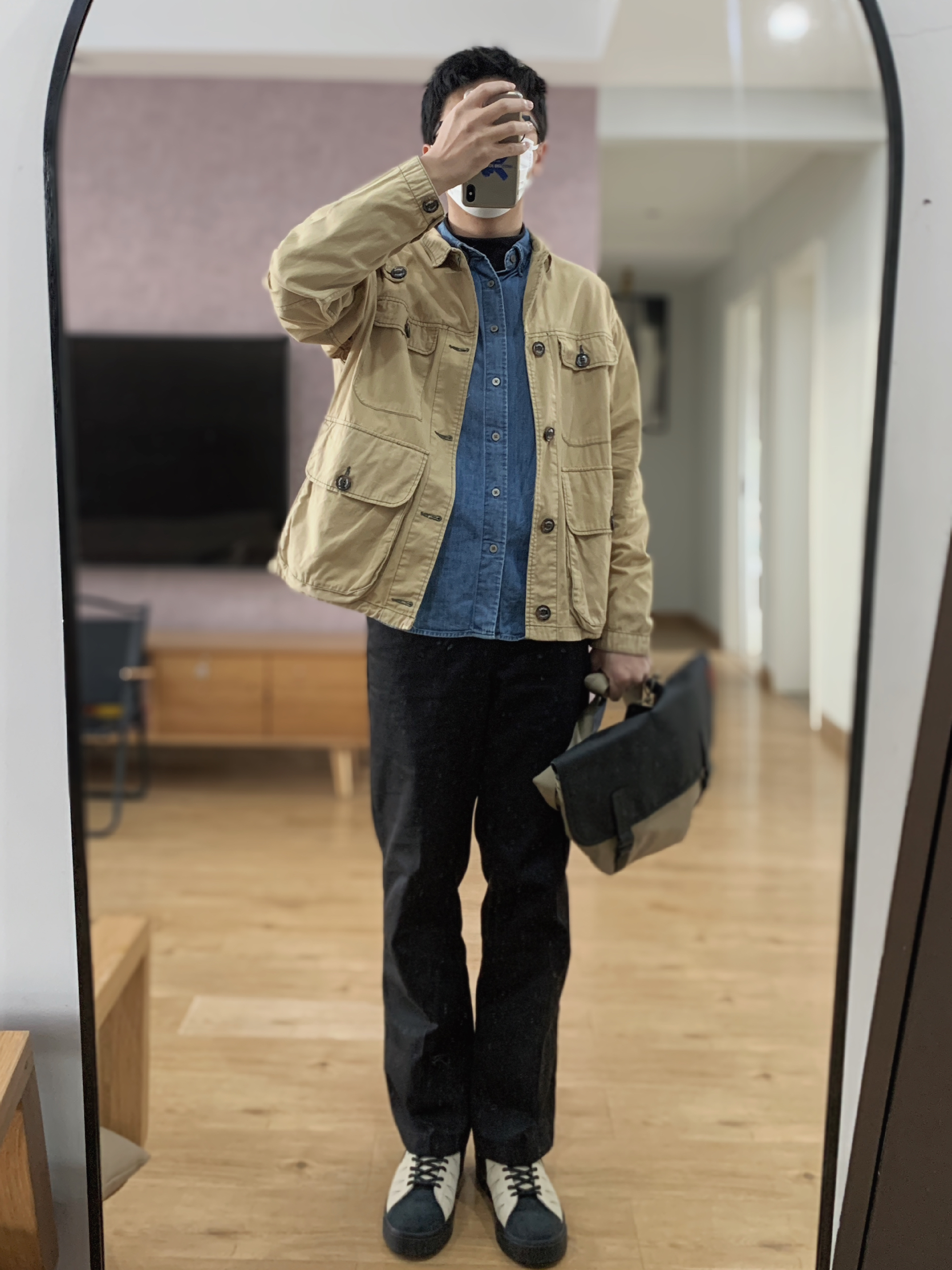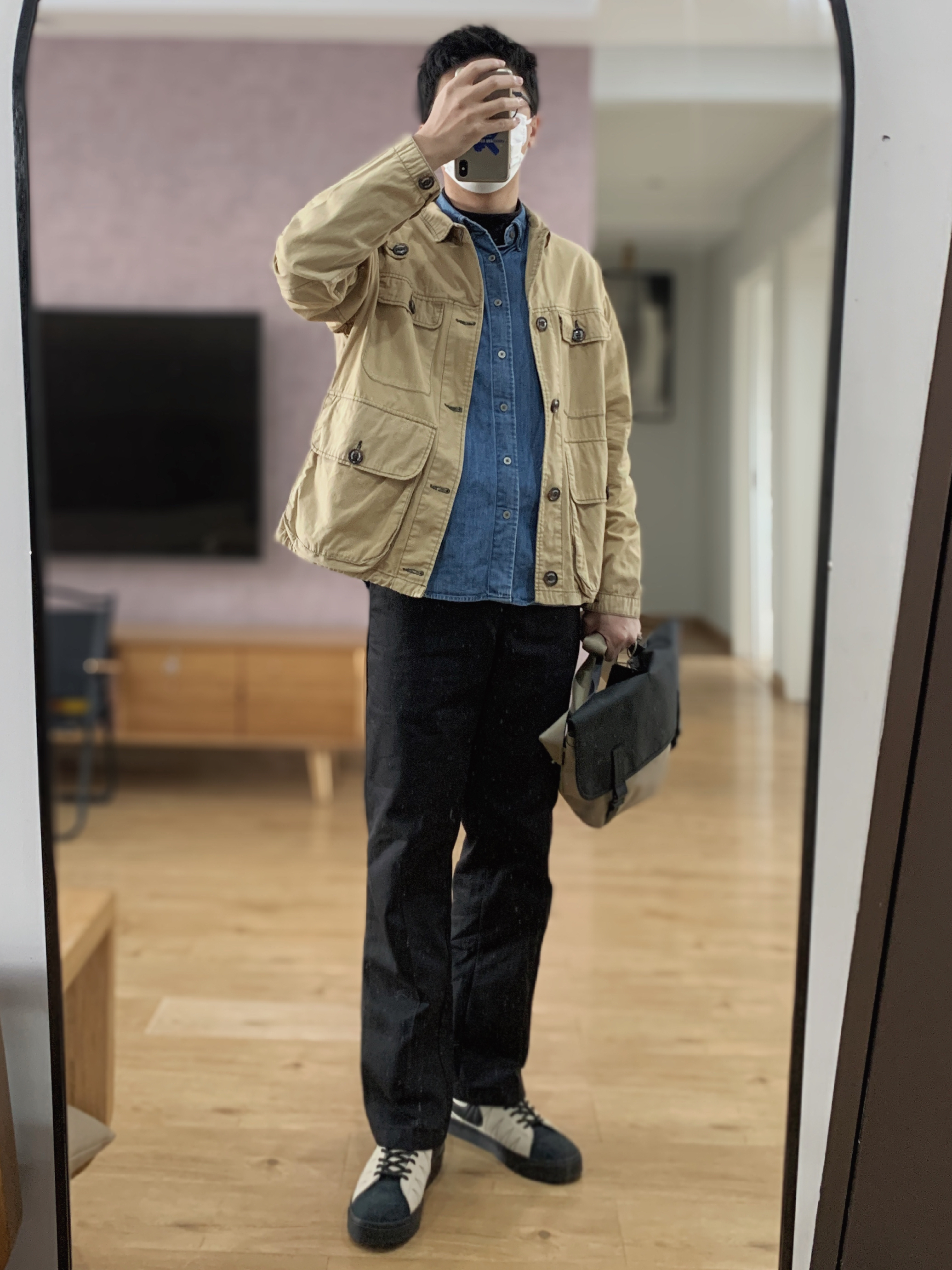hey 这里是每天记录穿搭的社畜日记。 今天是有点美式复古风的乱搭 外套是逛街的时候在一家古着店淘的 旧旧的感觉很有味道 内搭一件黑色小高领, 穿件跟卡其外套很搭的牛仔衬衫(优衣库425057) 裤子是黑色直筒工装裤(Dickies874) 搭配了一个卡其色的挎包跟卡其色的鞋子 👟:Nike SB Blazer Zoom 中帮/浅驼/黑色 分享每日通勤穿搭,欢迎指点交流。