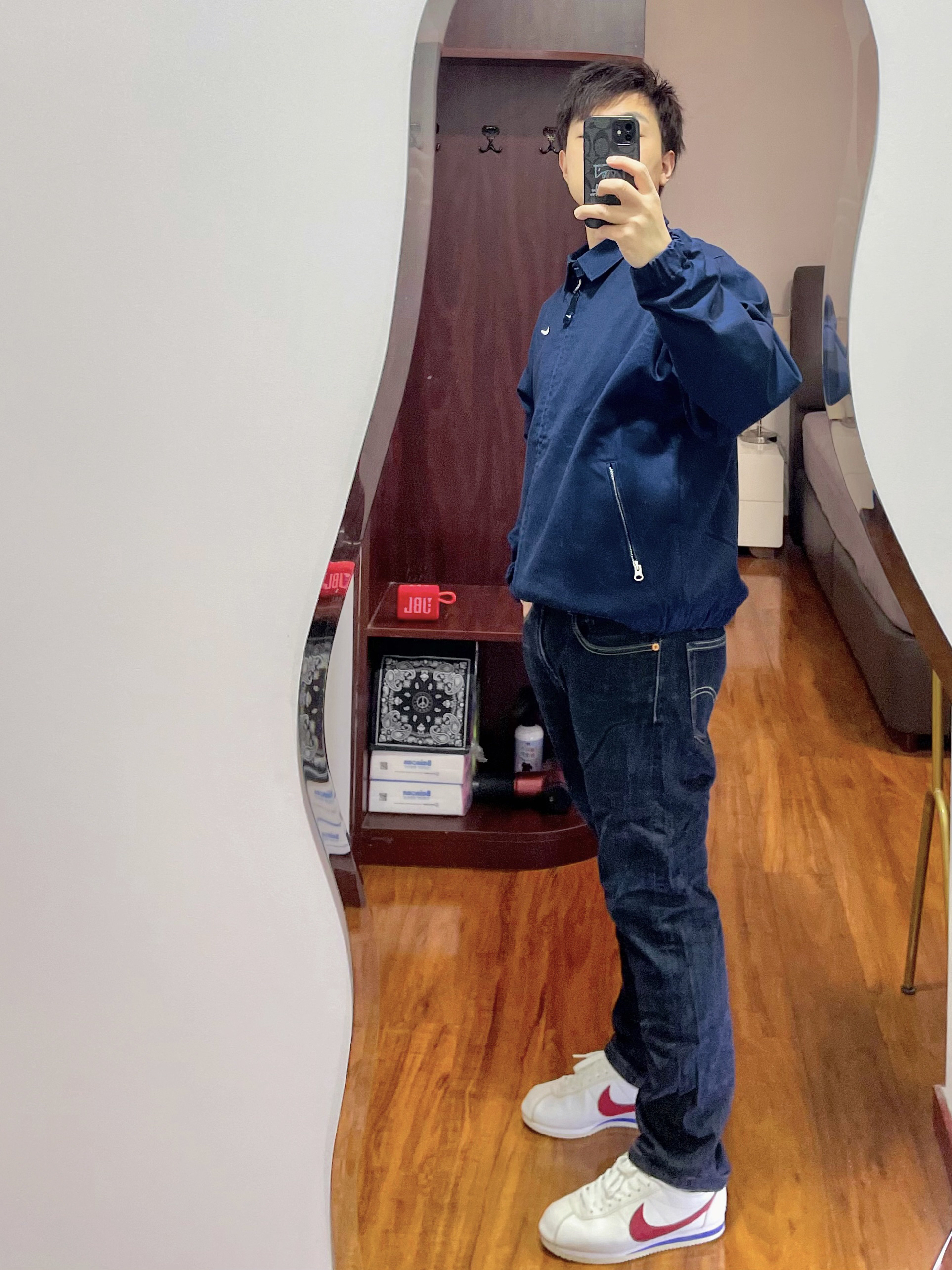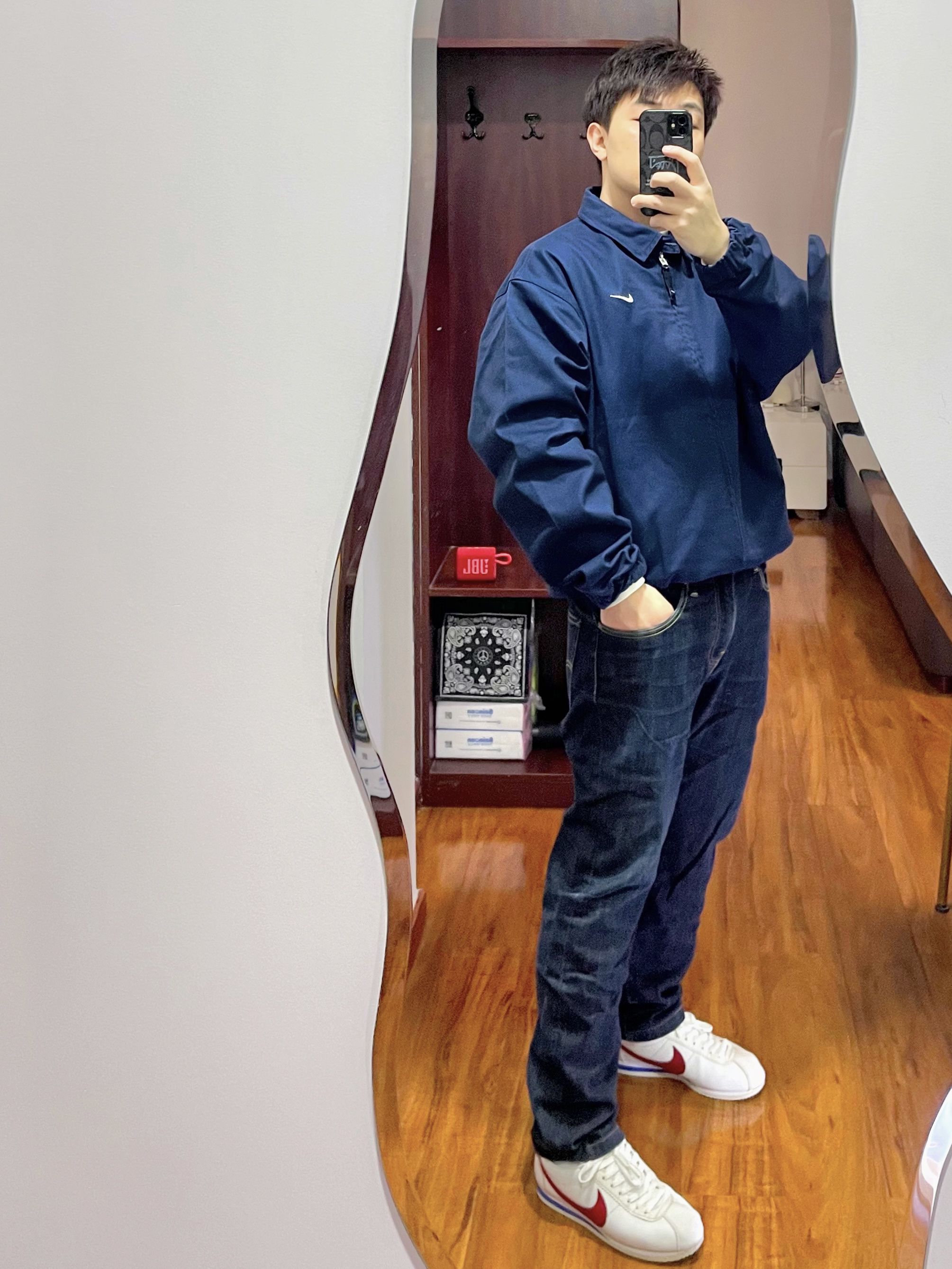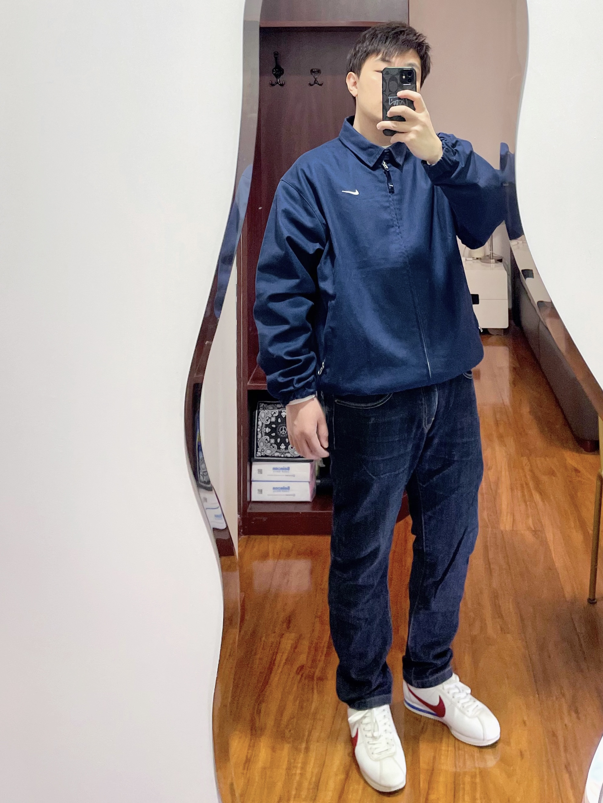 170/135斤 👔 Nike 深蓝色翻领夹克 👖 Levi's 511原蓝 👟 Nike 阿甘经典款 外套夹克是深蓝色的,看上去颜色跟高级有别于劳保那种看,要是这衣服是黑色的就更帅气了,但是怕驾驭不了,上身L感觉有些许大了,可能M会合身点。 牛仔裤是多年前购入的穿了好久,已经褪色了形成自然的纹理了,这裤不会太厚面料方面也不是特别硬的。 鞋子是阿甘的经典款和经典配色,搭配小直筒的长裤或者短裤都...