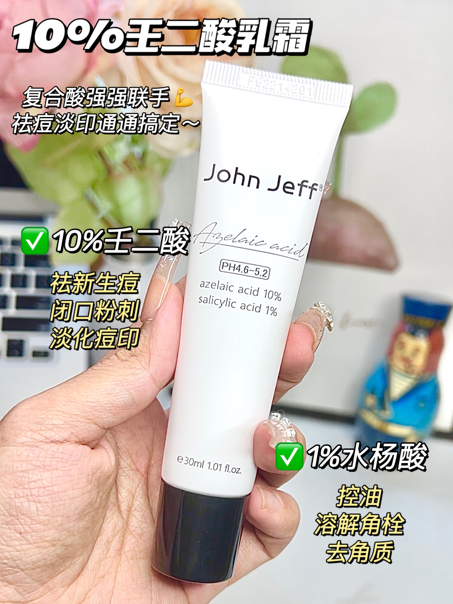 我是很容易长痘的肤质 有时候熬夜吃辣或者生理期 总会冒几颗痘痘 如果不管它还可能不停的冒,甚至留下痘印! 天知道痘印有多难消!😭 祛痘就要在新生痘时期就让它熄灭!👊 前前后后用了不少酸类产品 John Jeff家的壬二酸乳霜 是我目前用过祛新生痘很棒的产品👍 搭配他家的油橄榄精华直接吹爆❗️ 我称之为王炸祛痘CP‼️ 关键价格好实惠!一瓶才几十💰 先来看看成分~ ⭐️10%壬二酸乳霜 ➡️1...