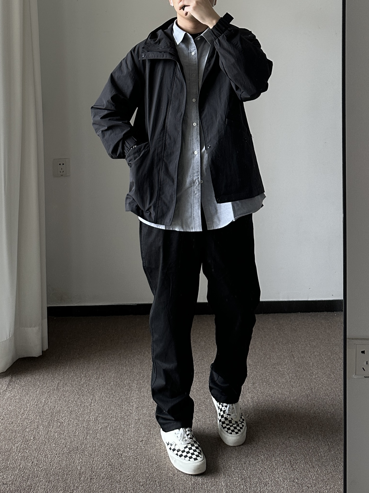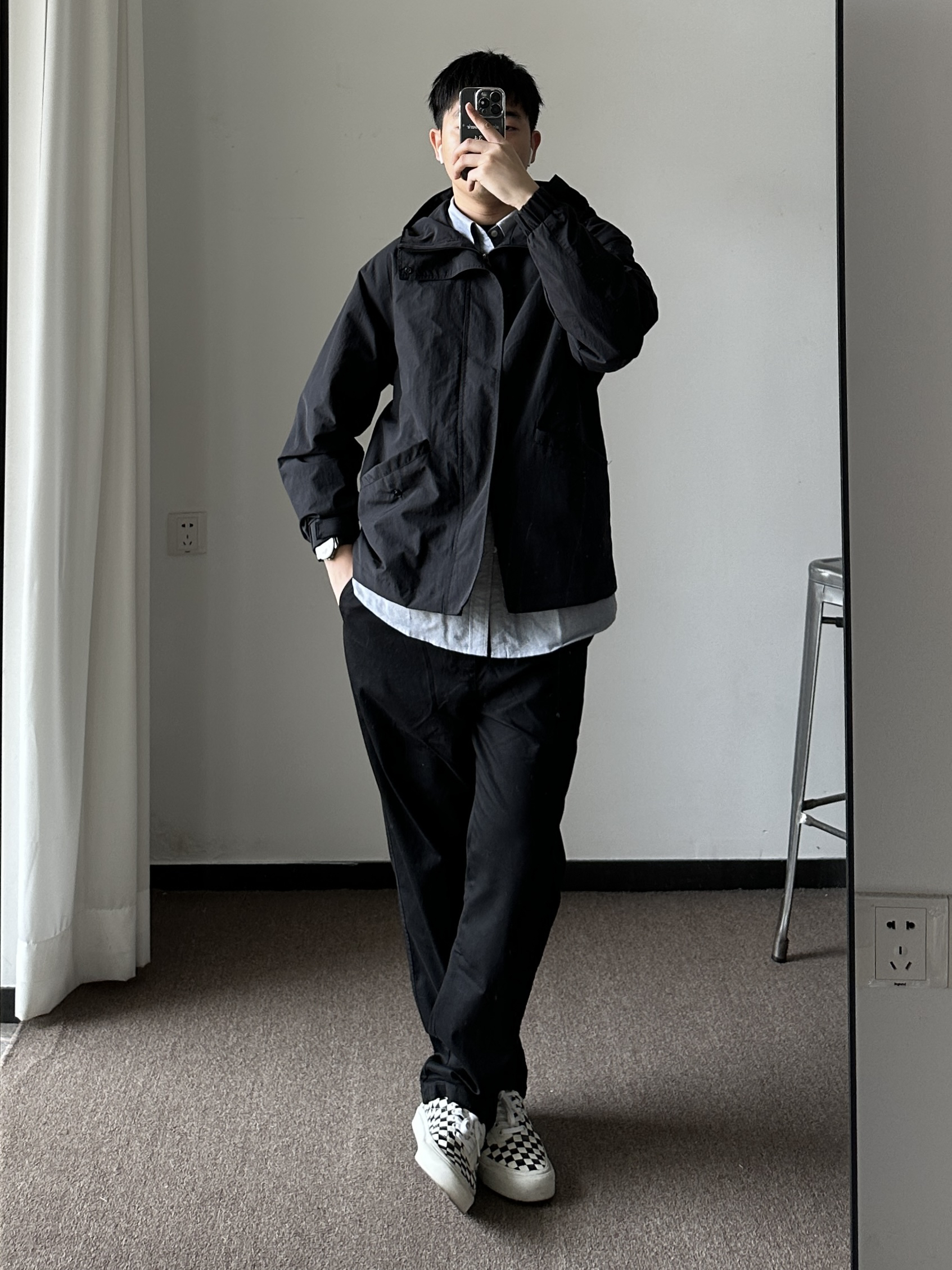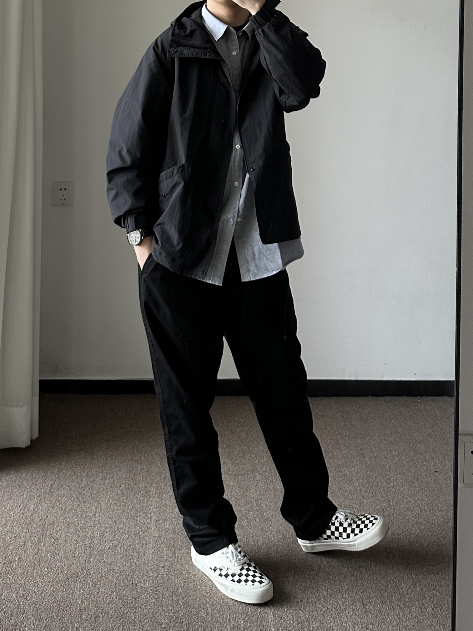 素人也能好看系列~174cm / 65kg 🧥- 天气阴阳不定的早春,薄款风衣是不错选择,黑色基础色、半拉链设计,通勤版型,侧面微A廓形。牛津纺选偏蓝灰色,能内搭也能外穿。 👖- 黑色基础裤,裤脚微锥。 👟- 棋盘格 ⌚- 表盘精致,灰钢色低调沉稳。皮质表带商务通勤yyds!