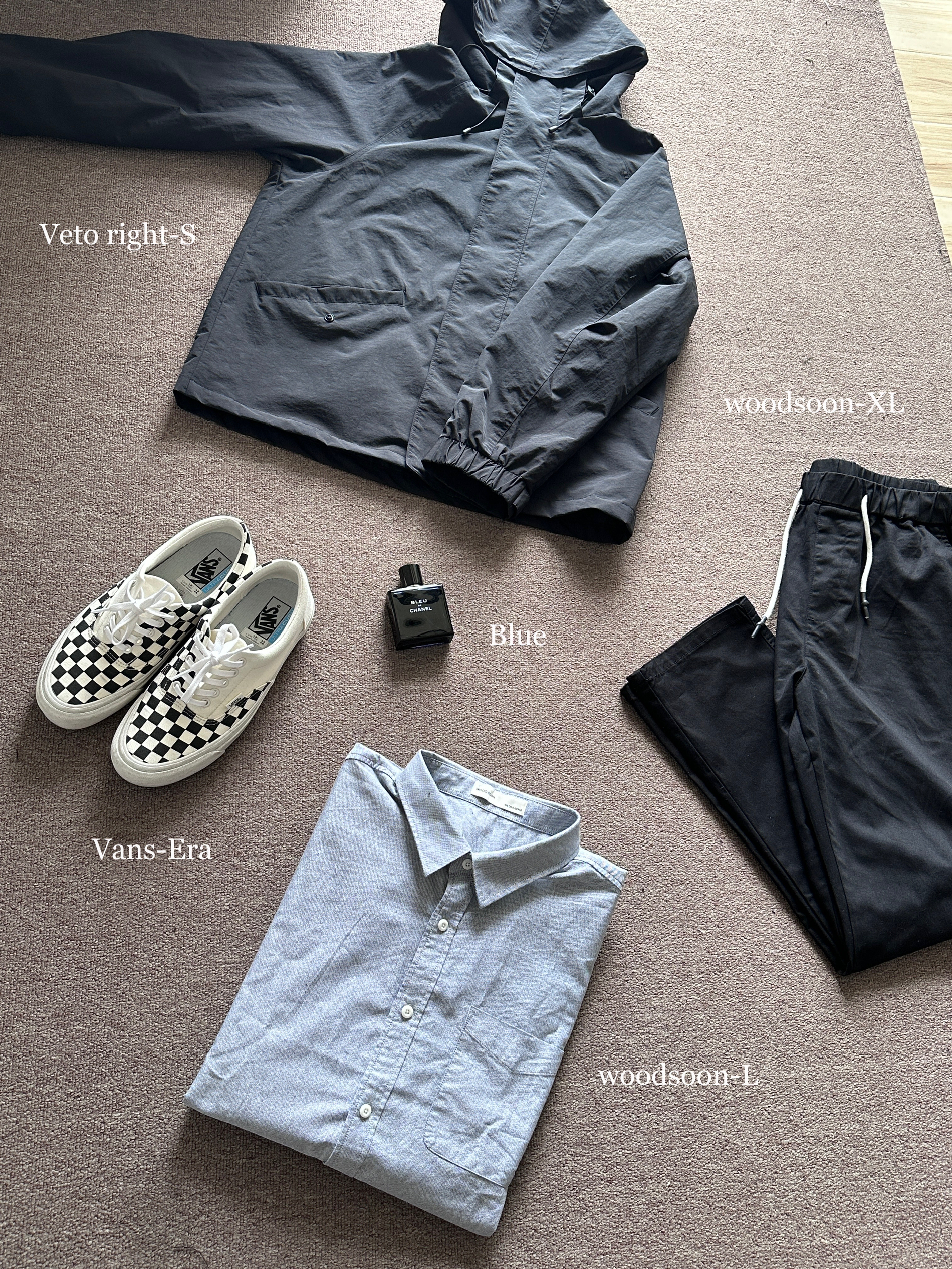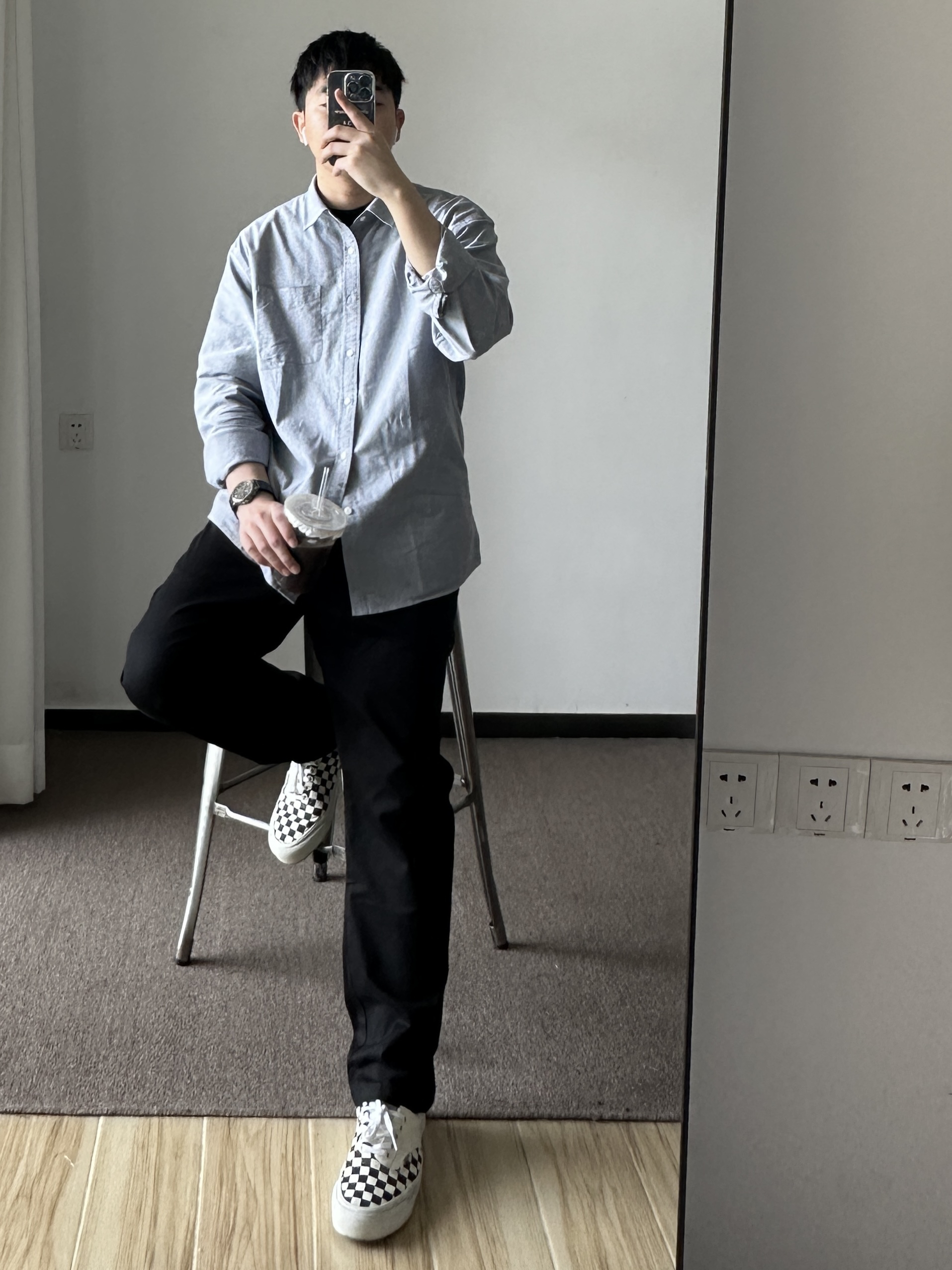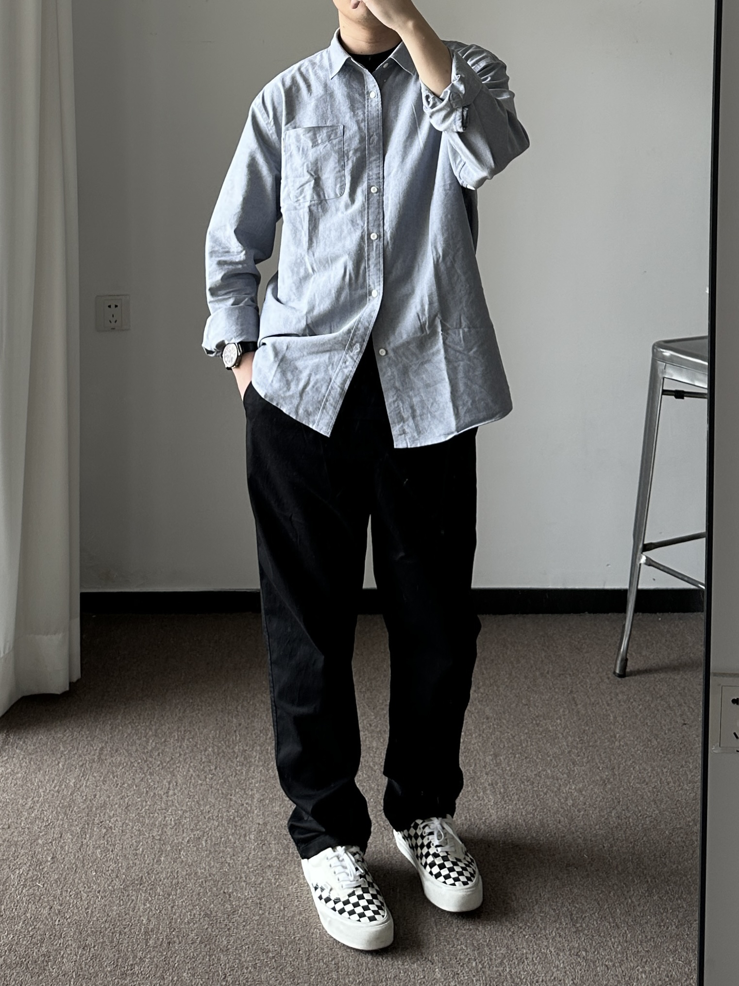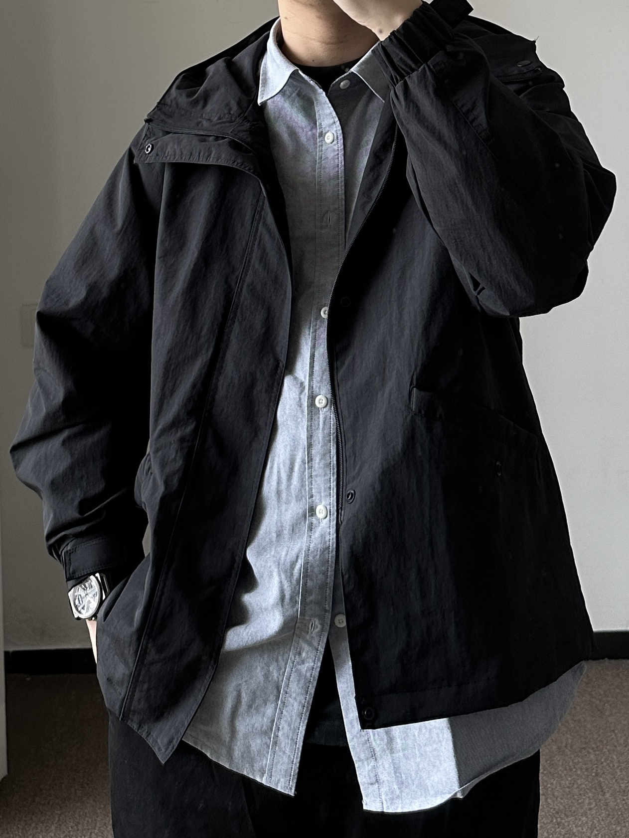 素人也能好看系列~174cm / 65kg 🧥- 天气阴阳不定的早春,薄款风衣是不错选择,黑色基础色、半拉链设计,通勤版型,侧面微A廓形。牛津纺选偏蓝灰色,能内搭也能外穿。 👖- 黑色基础裤,裤脚微锥。 👟- 棋盘格 ⌚- 表盘精致,灰钢色低调沉稳。皮质表带商务通勤yyds!