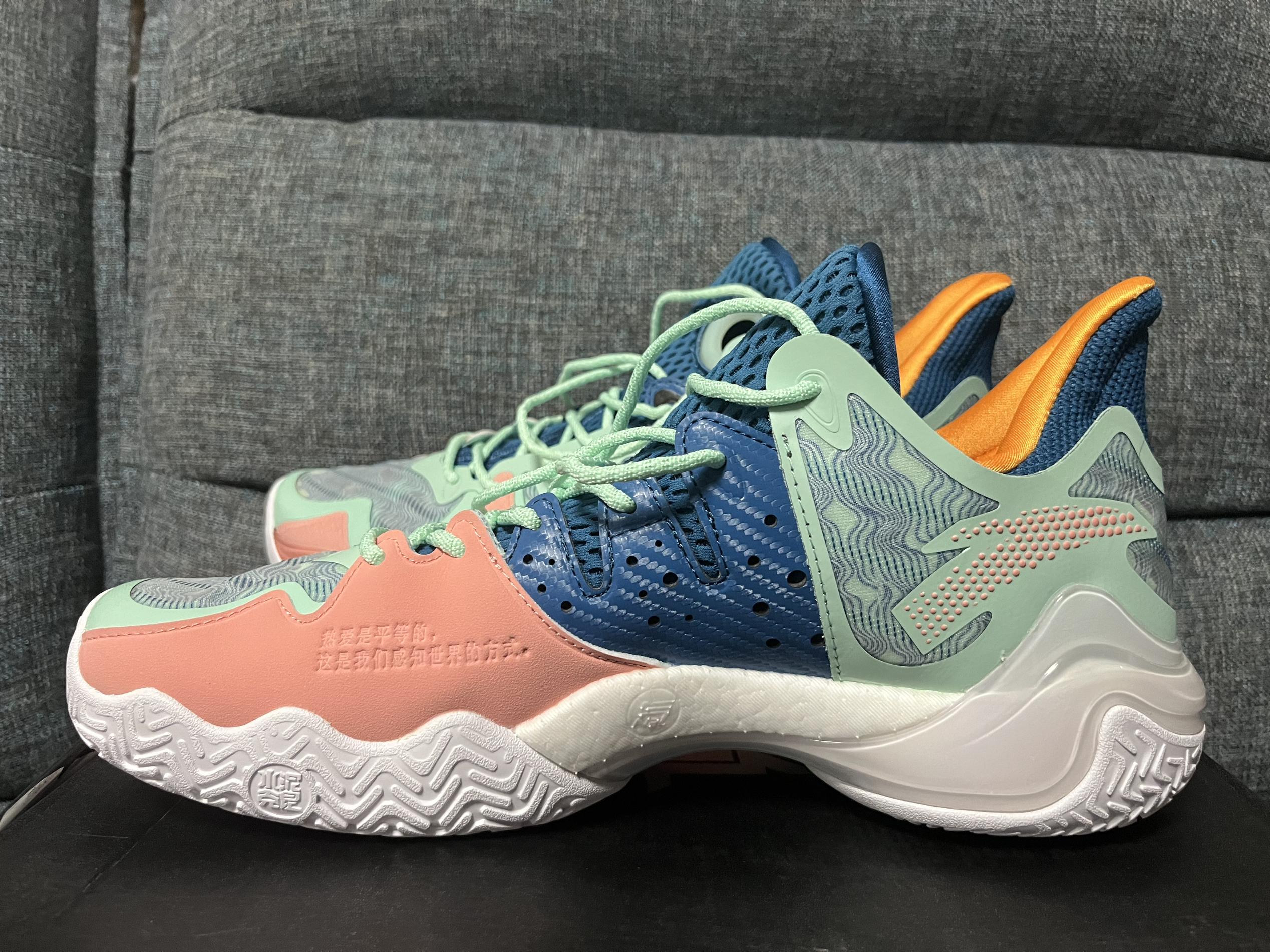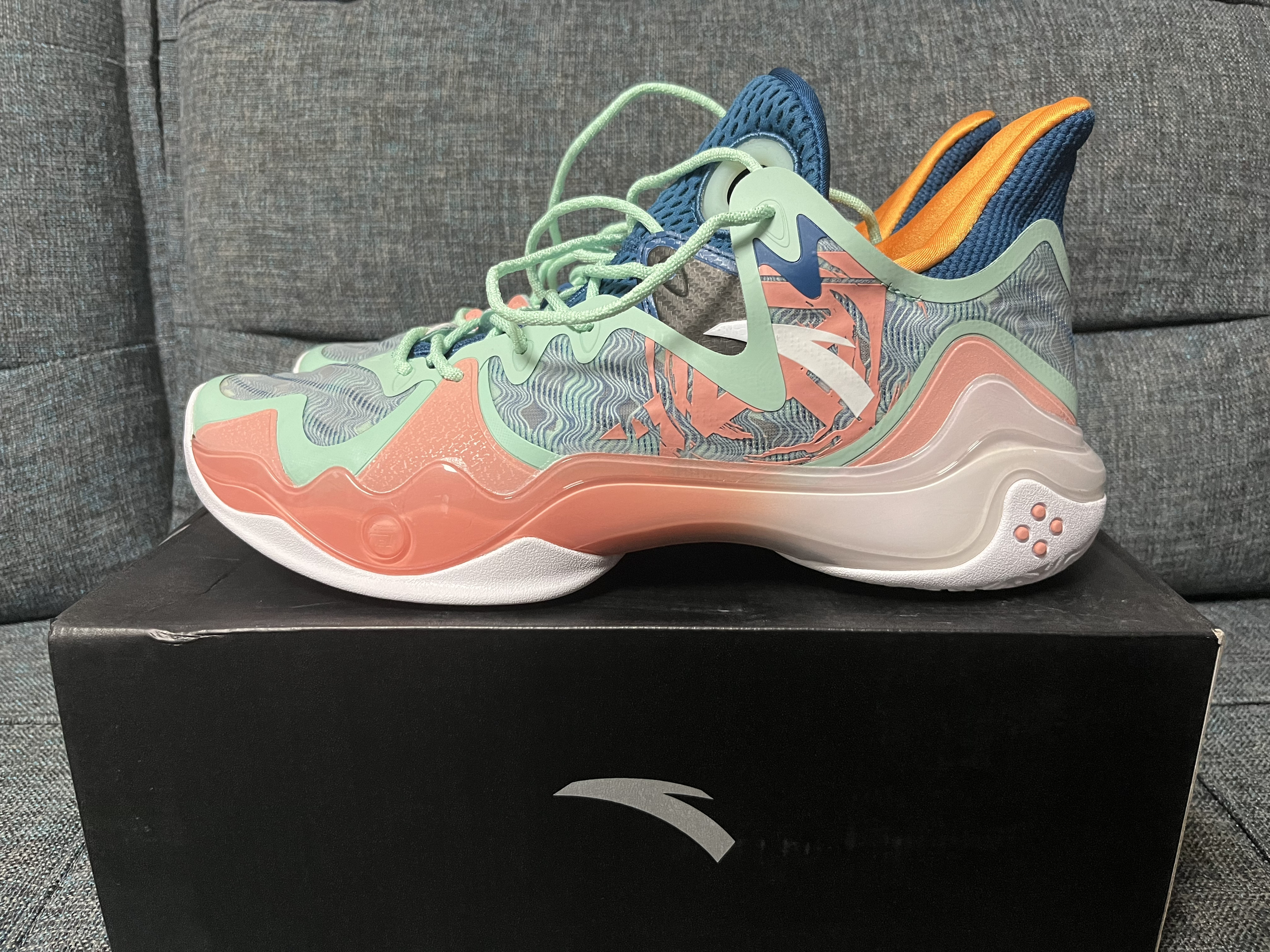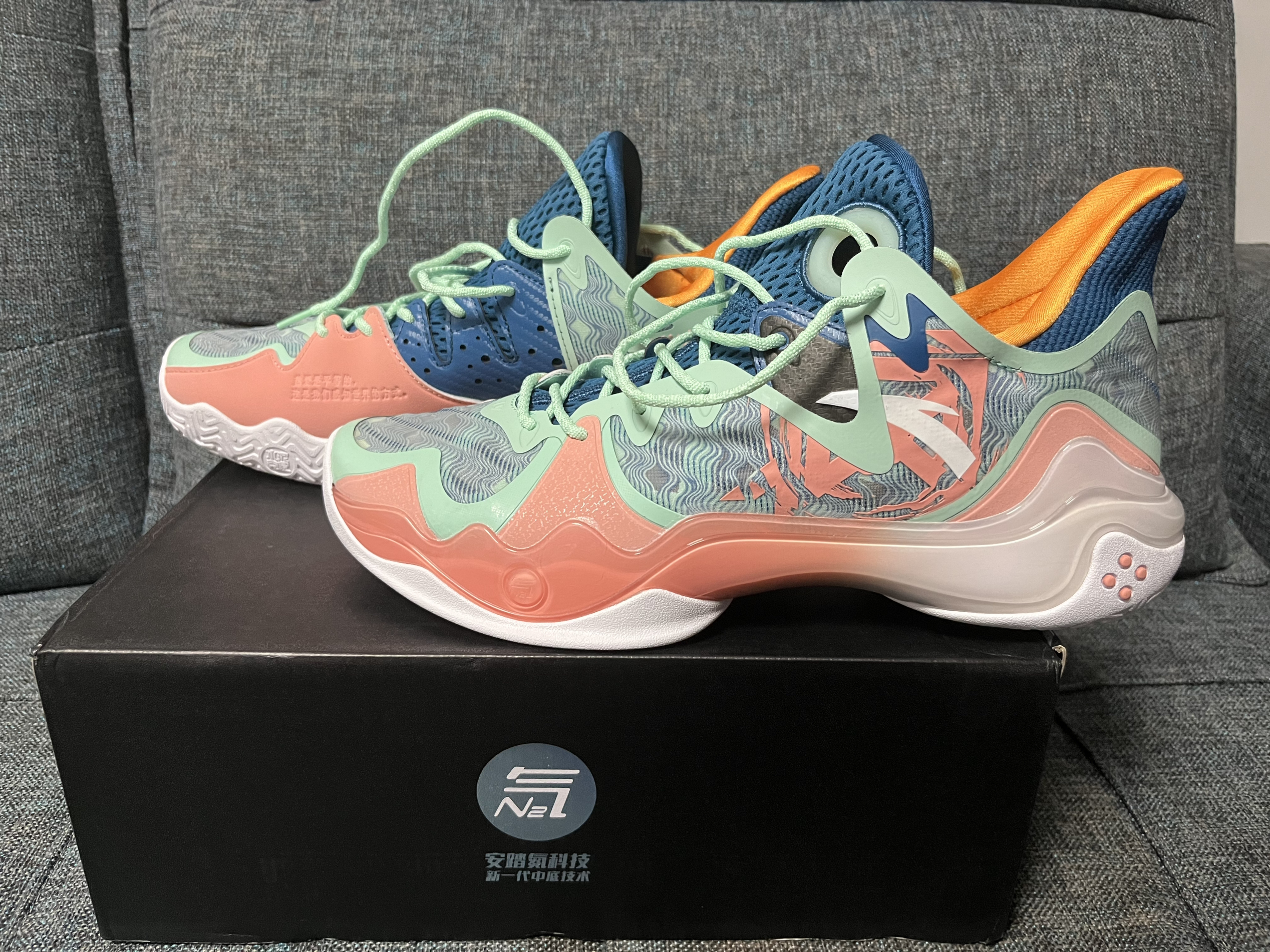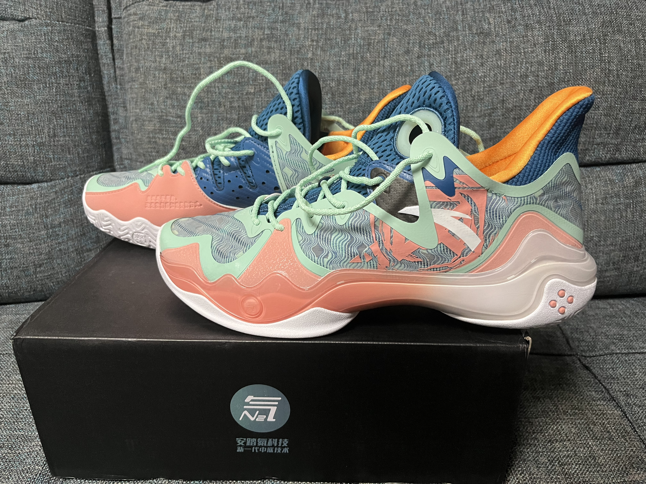 这双狂潮4是和欧文9一起买的,之前就考虑过入手,看大家推荐都说还不错,包括很多网红球员的上脚,觉得挺好看的。但也有很多人说防侧翻角容易翻卷,就有点犹豫,最后还是决定买来试试,入手价格46码,500元出头。 1.抓地力 室外我还没有穿过,目前穿了两次去打室内场,打了一次百分,抓地没有问题,很牢实,根本不可能打滑。室外因为暂时还没有样本,不方便评价,满分10分可以给到9分。 2.缓震 安踏的氮科技...