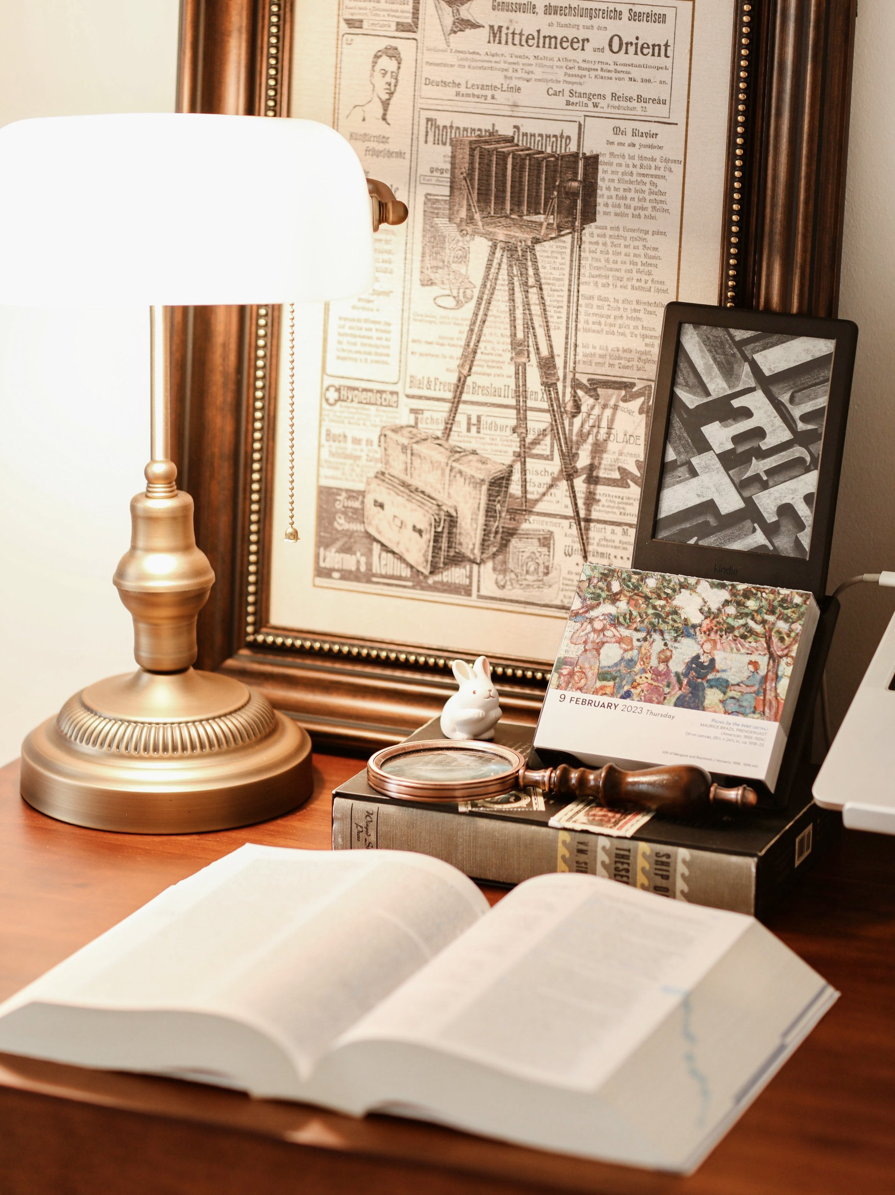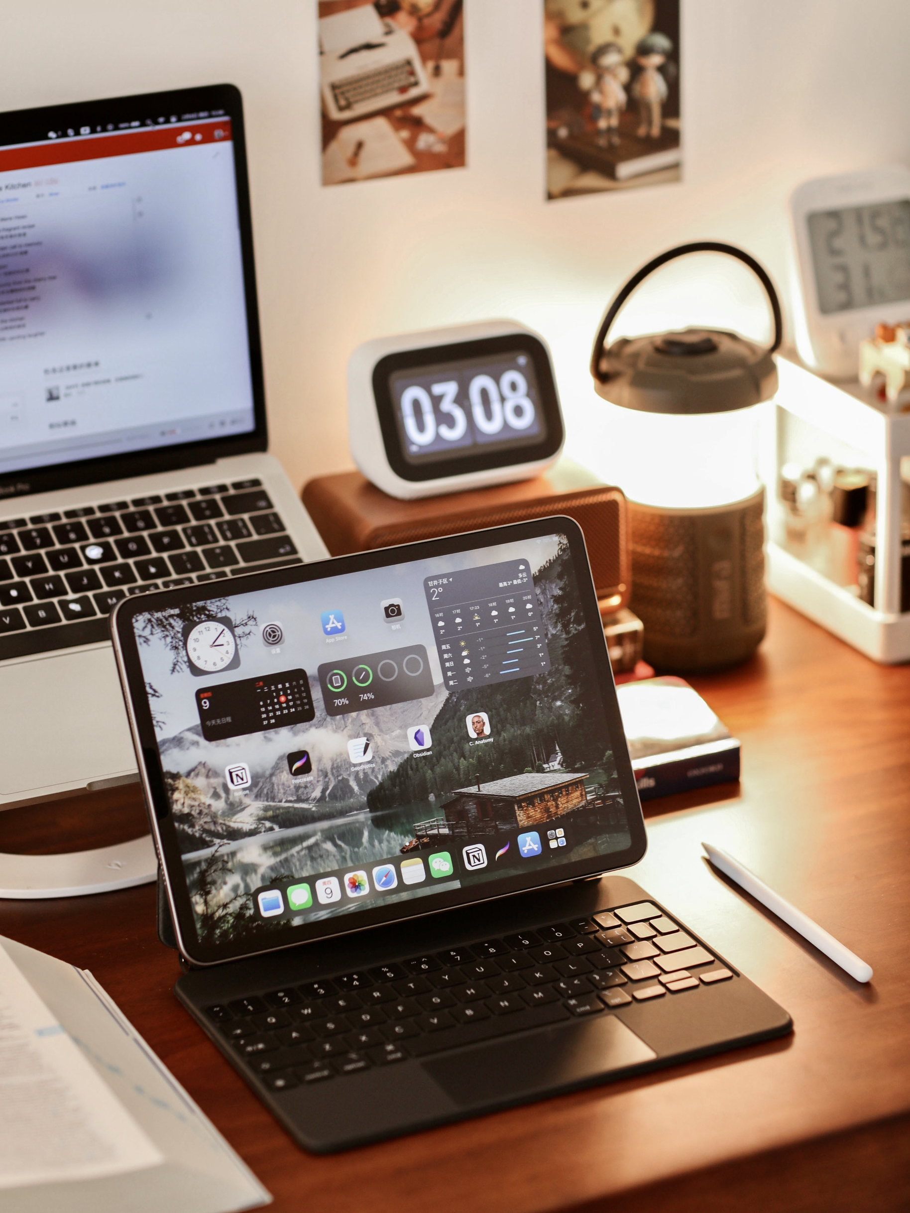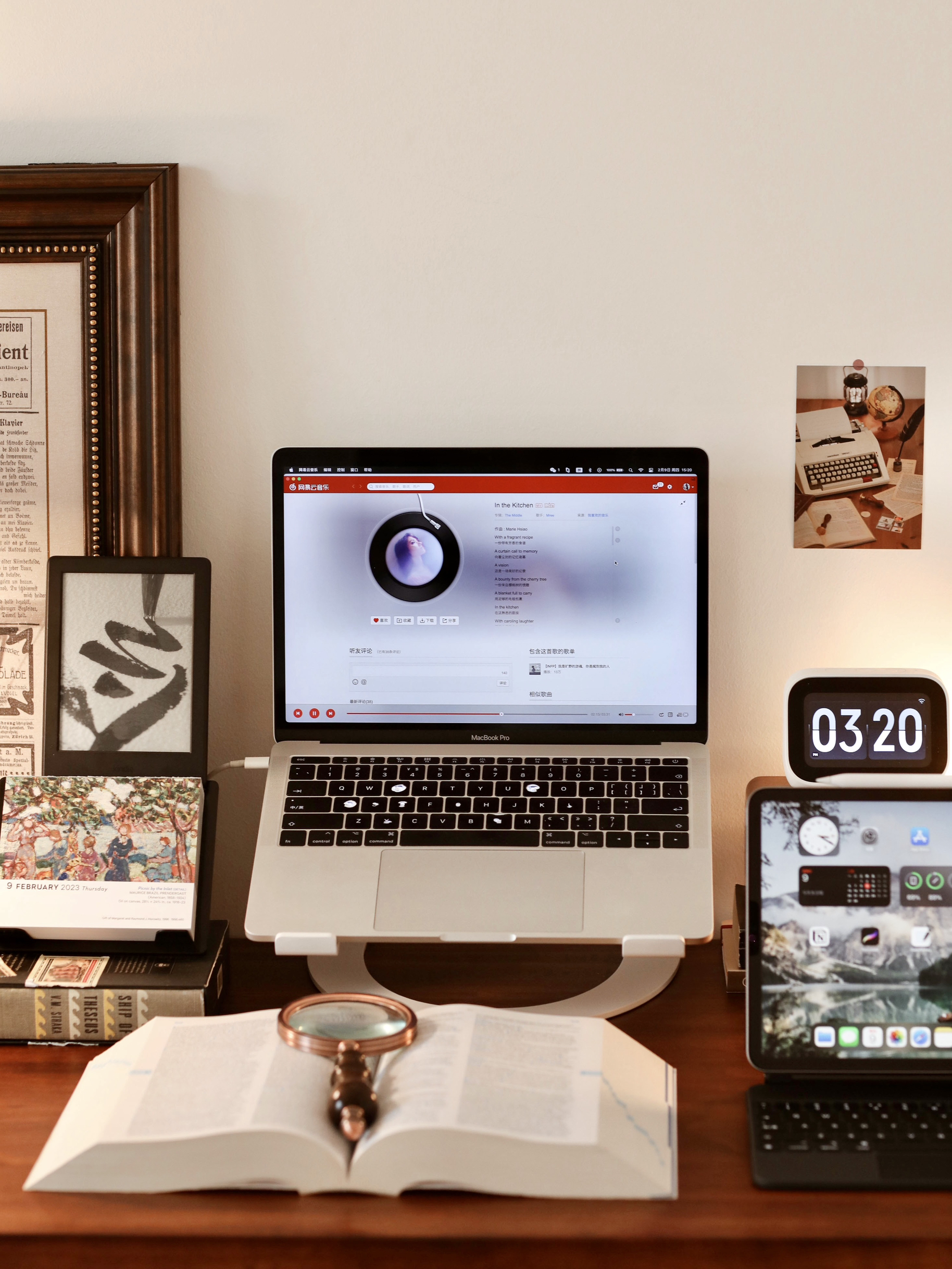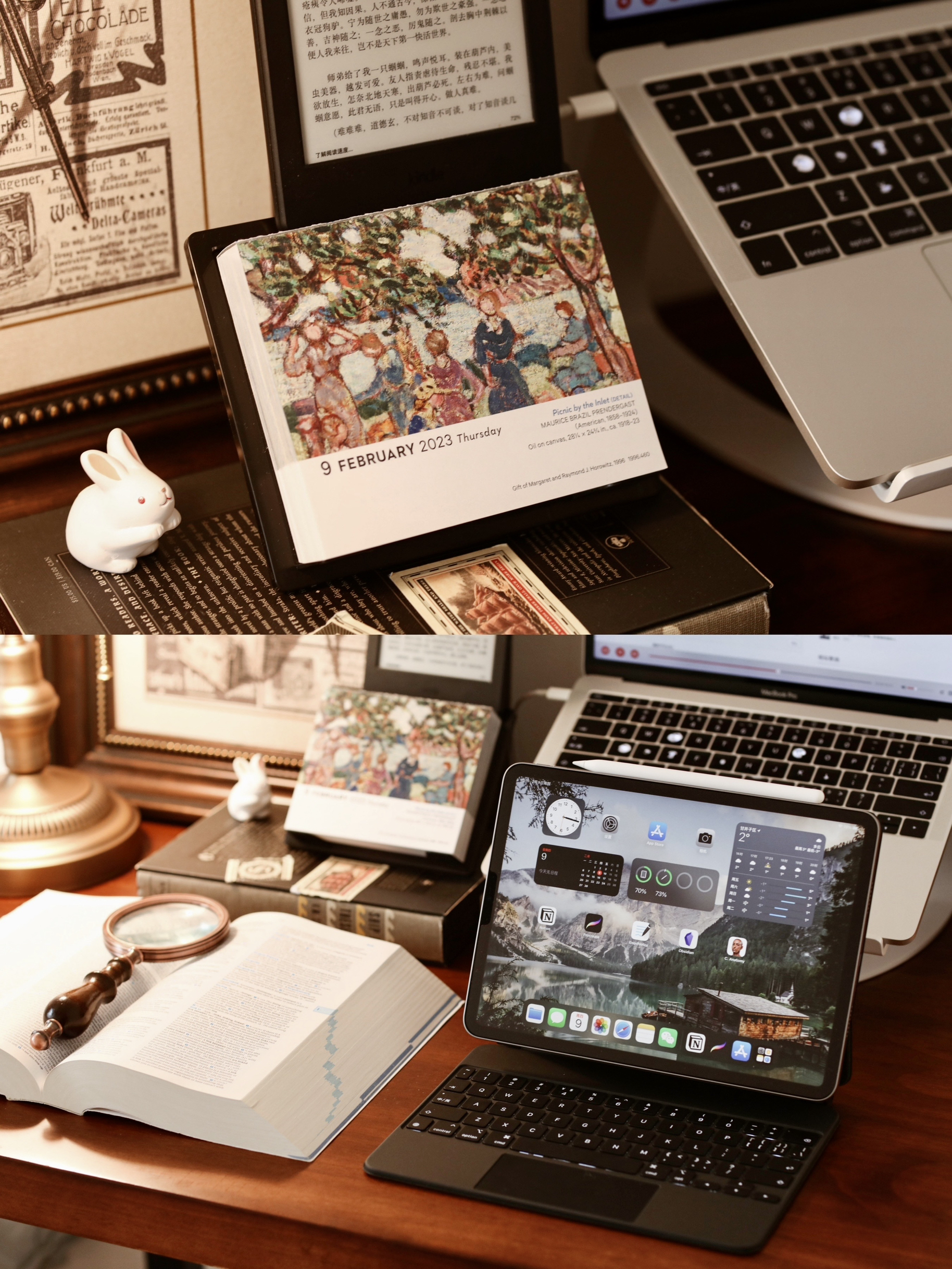新的一年,我的桌面也换了个新的风格,还是回归了我喜欢的复古风。 - 🧾桌面布置清单: ▪️实木桌|140cm x 60cm,桌面油漆味有些重,散了一个月可算没味道了。 ▪️电脑|旧款MacBook Pro ▪️电脑支架|Twelve South ▪️平板|iPad Pro 2022 ▪️键盘|苹果妙控 ▪️触控笔|Apple Pencil二代 ▪️电子书|Kindle ▪️音箱|小米小爱触屏音箱...