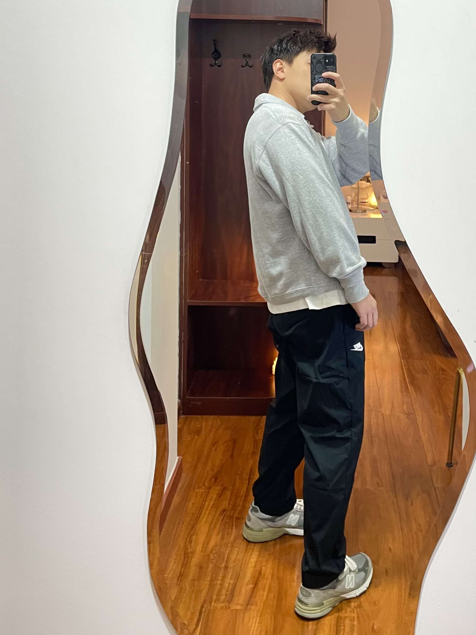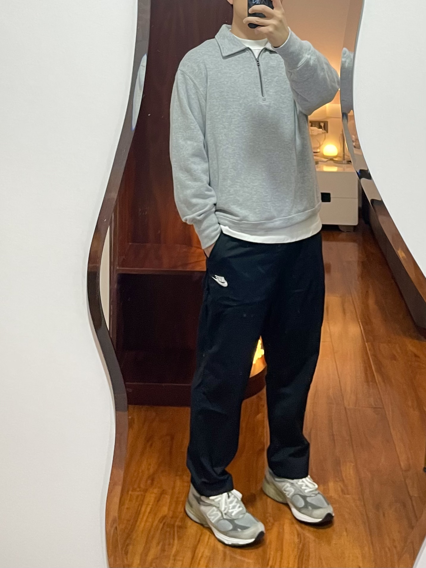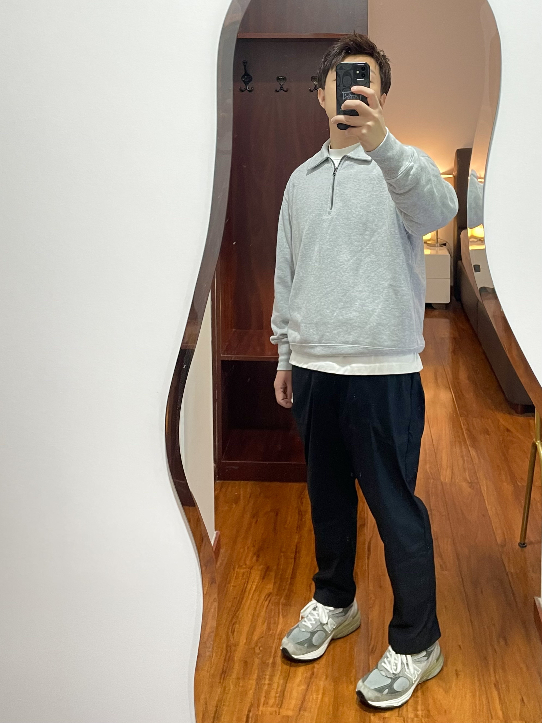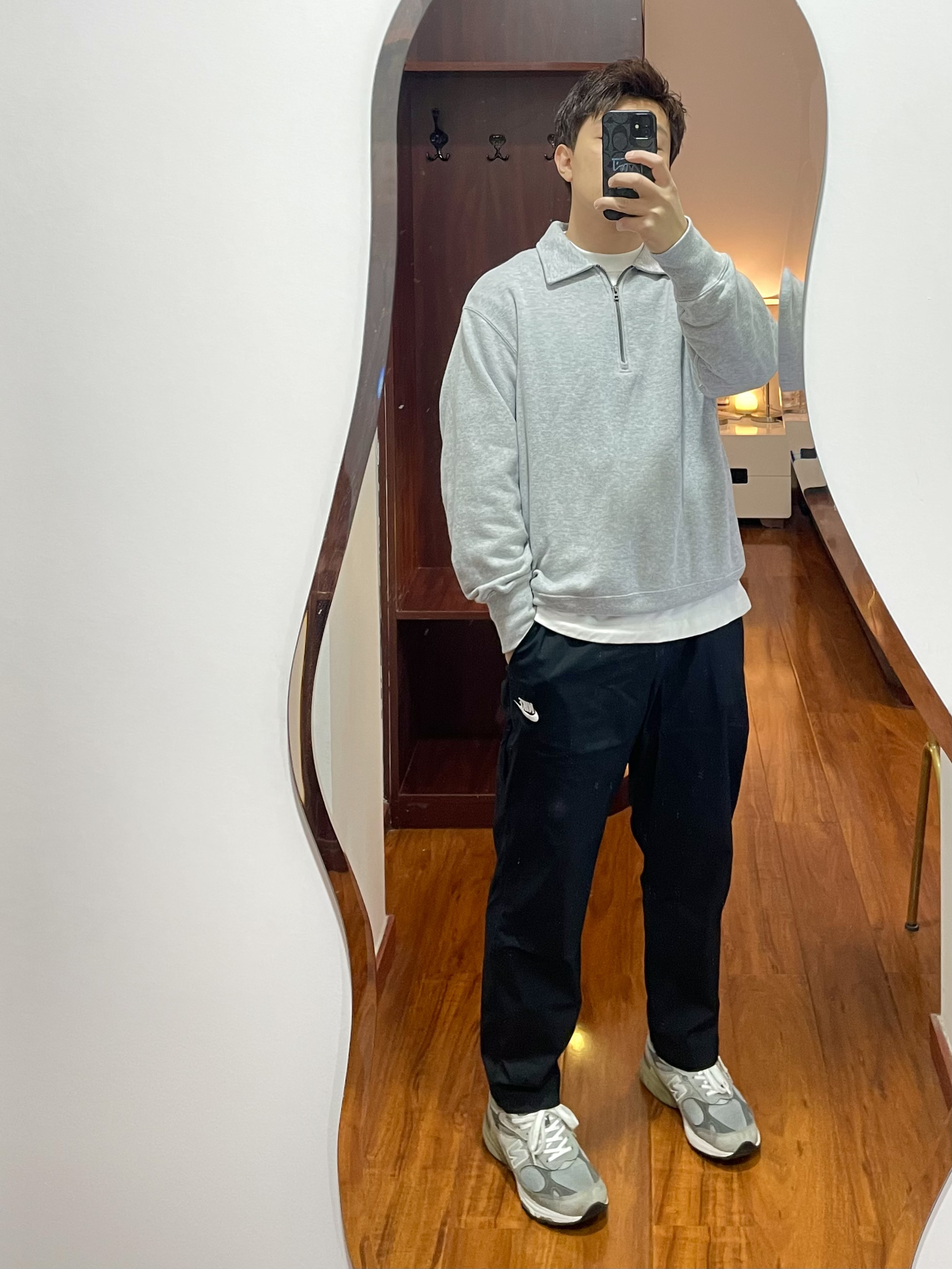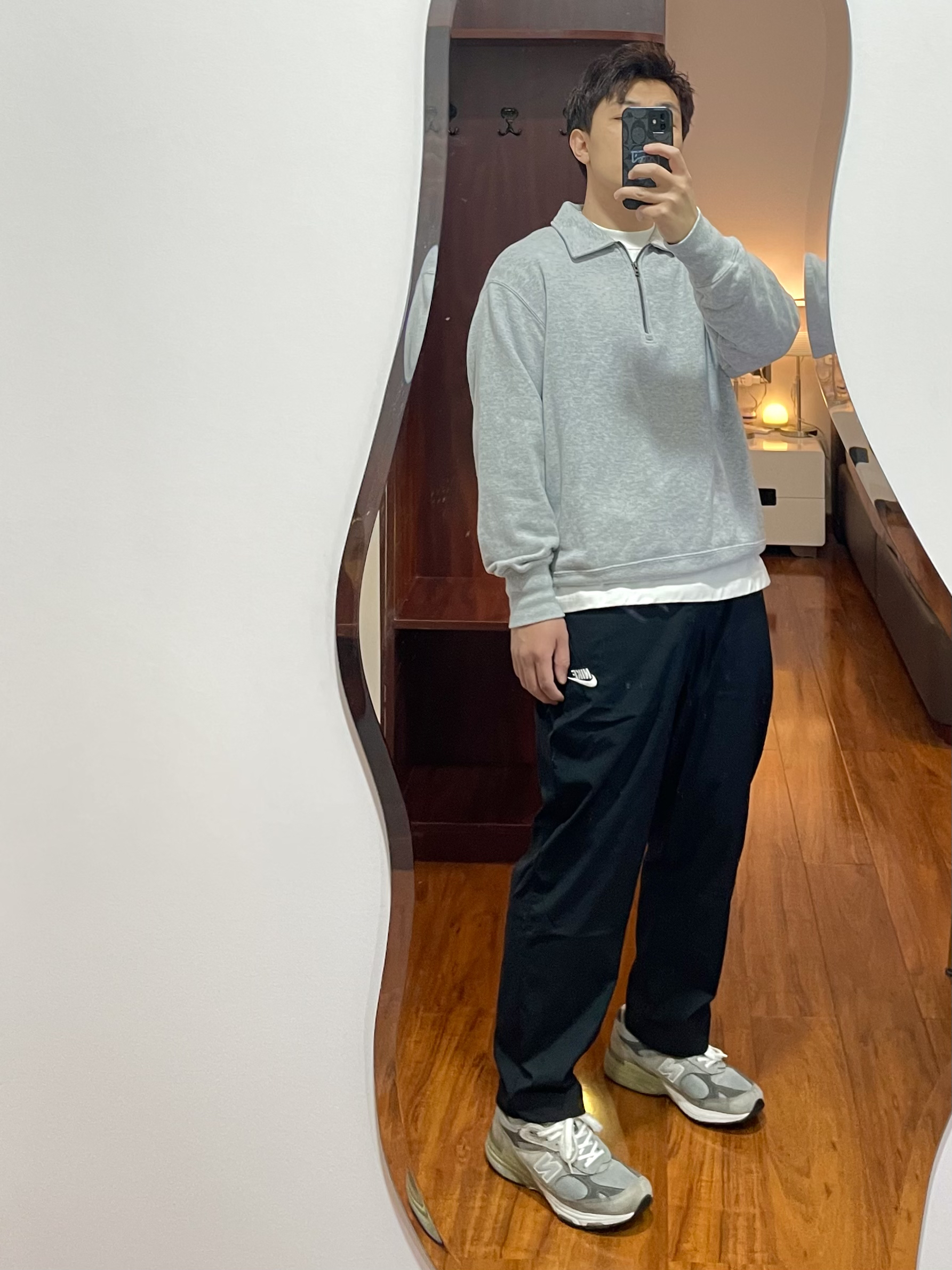 170/135斤 一个普通人的穿搭分享 👔上衣:优衣库 灰色拉链翻领卫衣 半拉链的翻领卫衣日常穿运动穿都很合适,春季不太冷的天气也可以穿。 👖裤子:Nike 运动裤 黑色运动裤日常运动的最优选择,这款裤子为9分裤,上身L码裤脚可以盖住这面但是没有堆叠感。 👟鞋子:new balance 993 日常上脚较多的城市慢跑鞋,因为真的太好穿了,灰色的配色又看又好搭。 这么穿像不像体育老师?