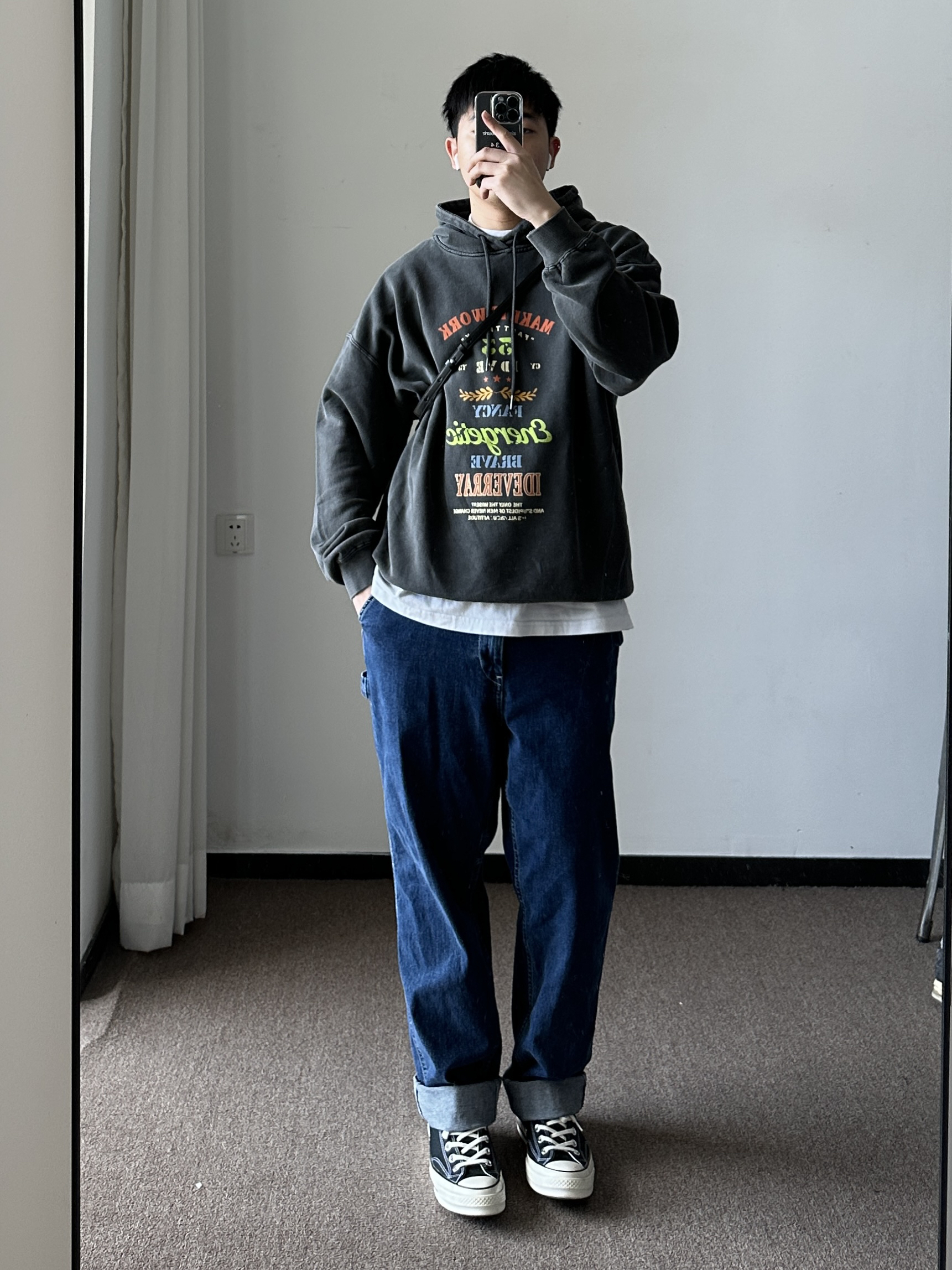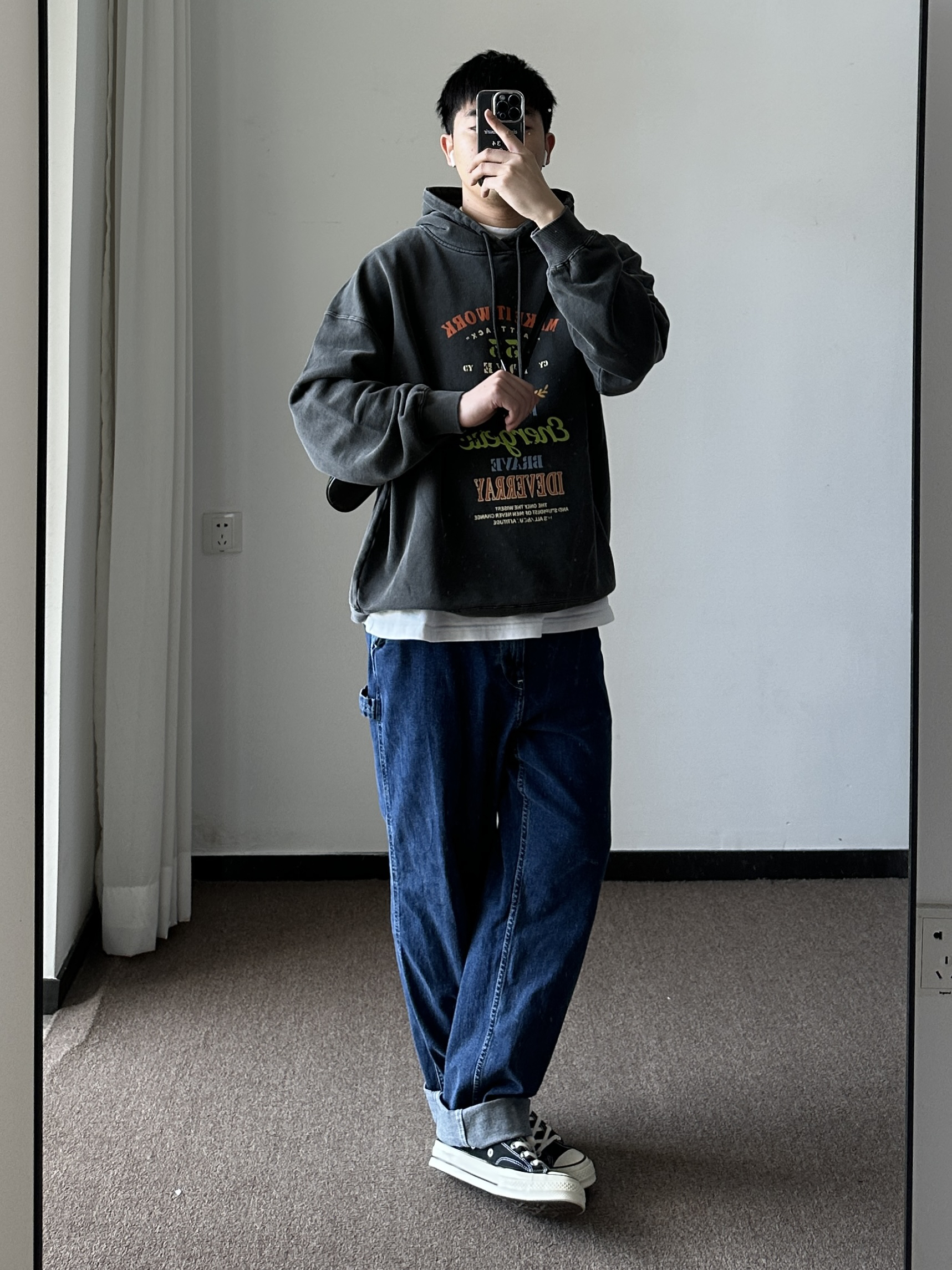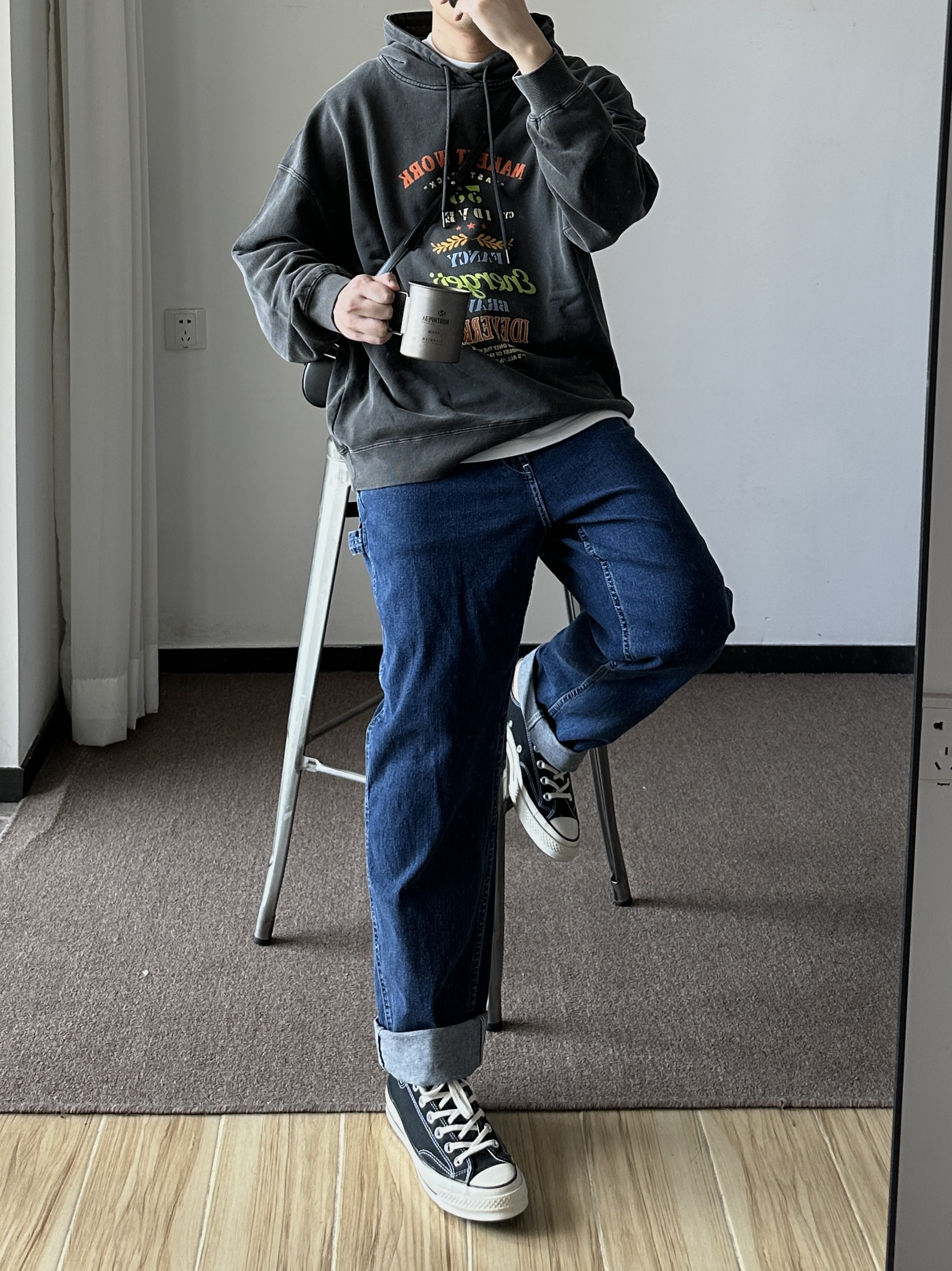 素人也能好看系列~174cm / 65kg 🧥- 做旧风的印花卫衣,logo🉑。整体偏美式,落肩版型。 👖- 经典的牛仔蓝,比较有春天的感觉。 👟- 黑白帆布鞋