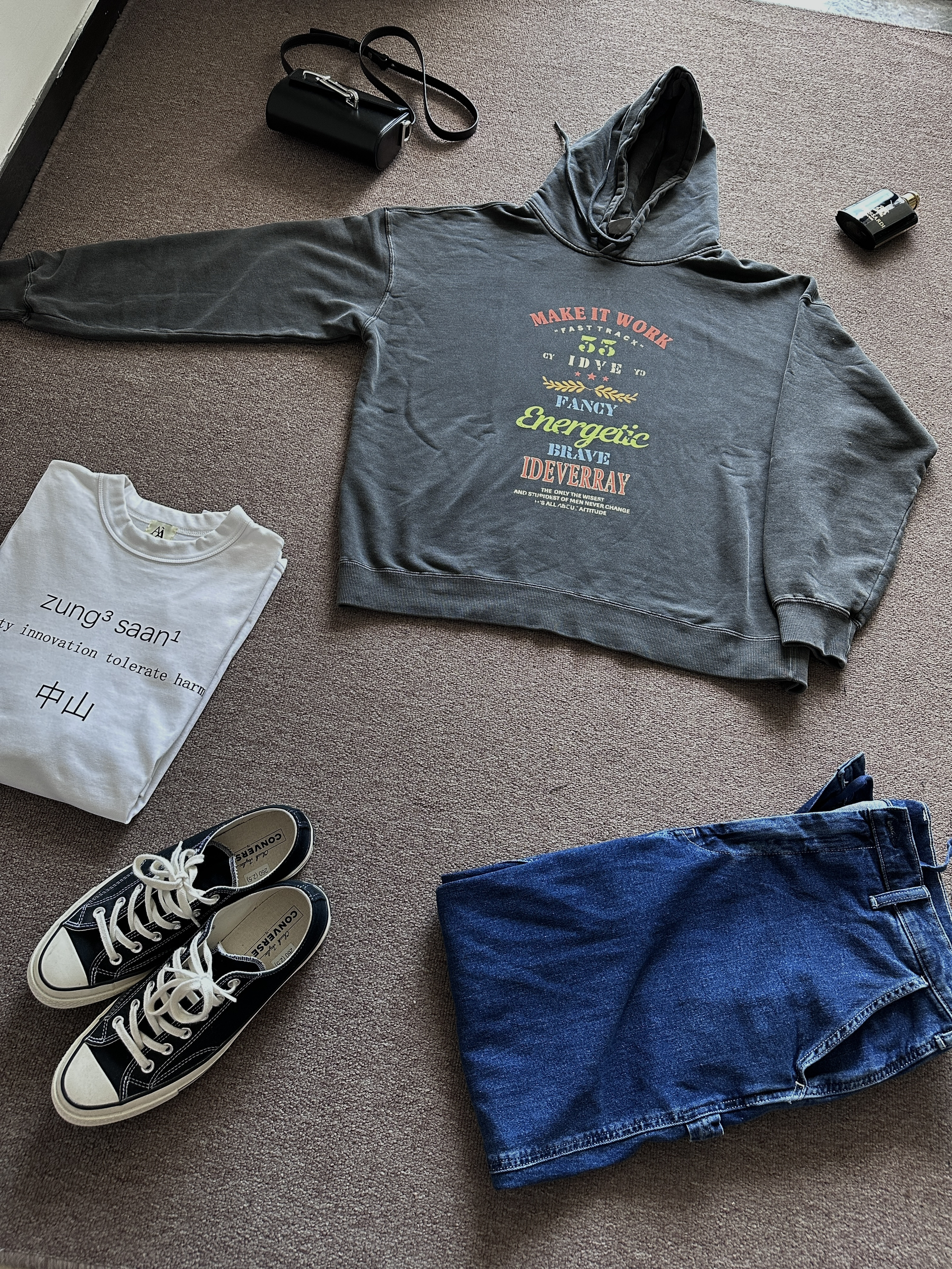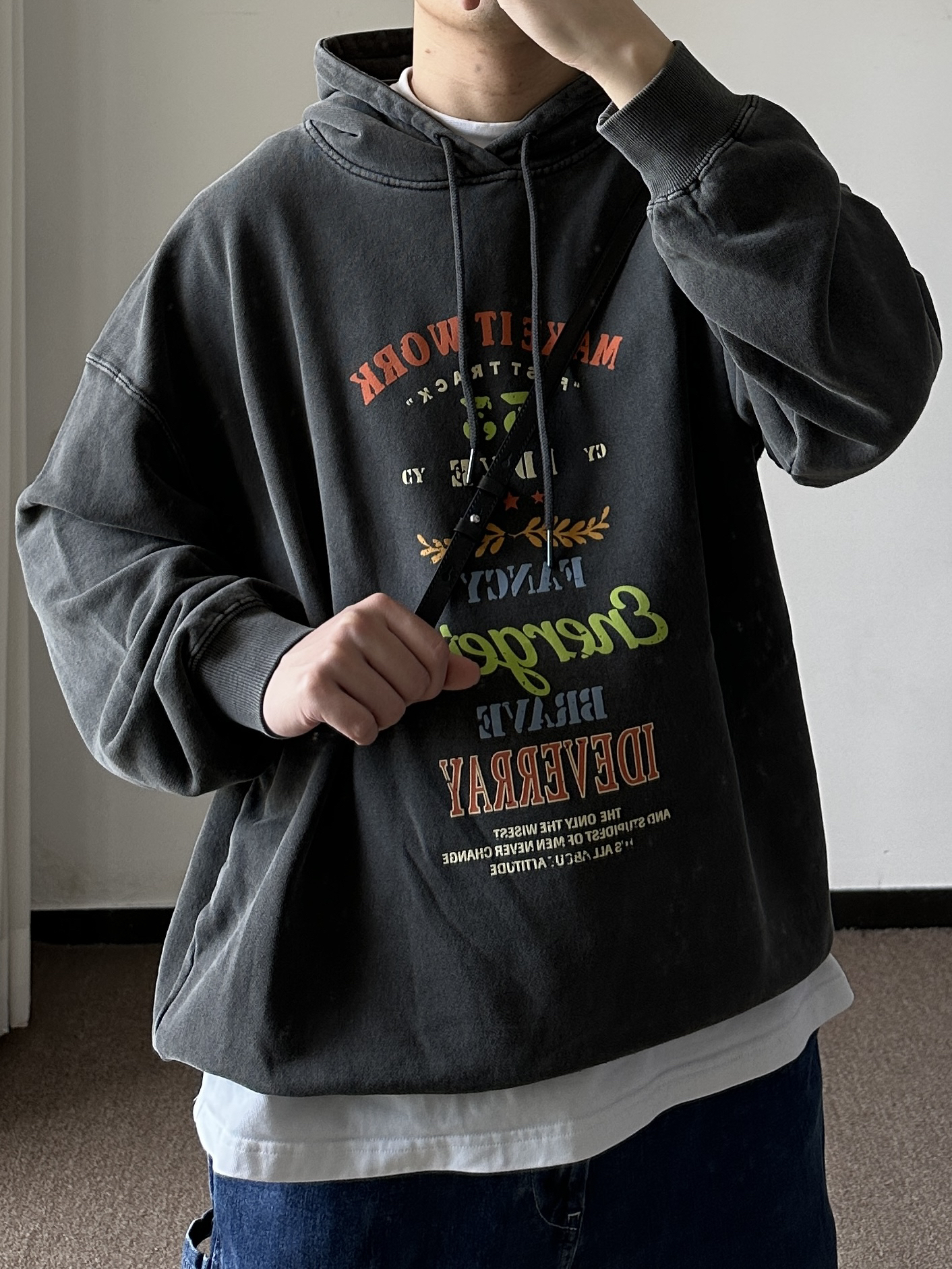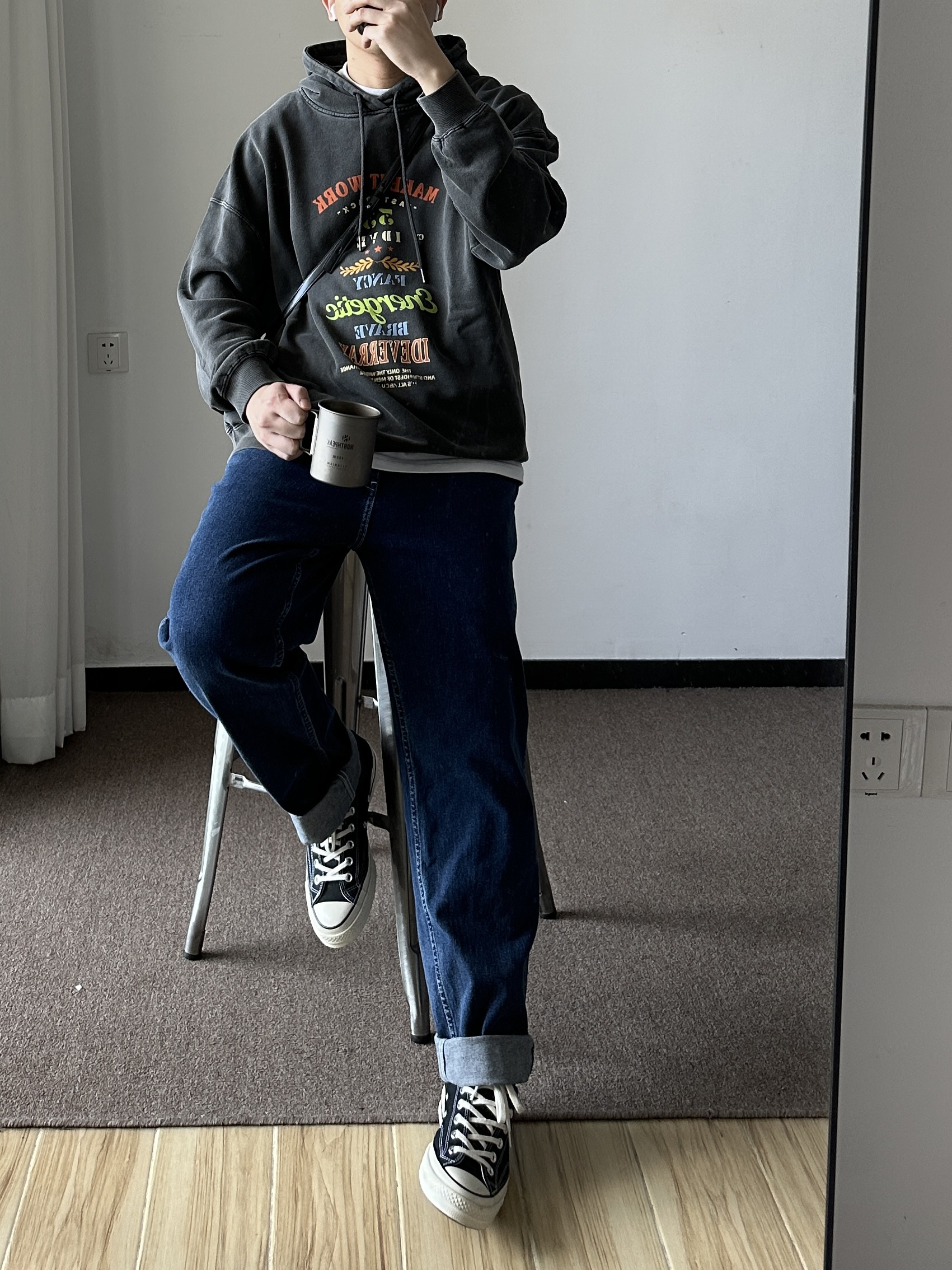 素人也能好看系列~174cm / 65kg 🧥- 做旧风的印花卫衣,logo🉑。整体偏美式,落肩版型。 👖- 经典的牛仔蓝,比较有春天的感觉。 👟- 黑白帆布鞋