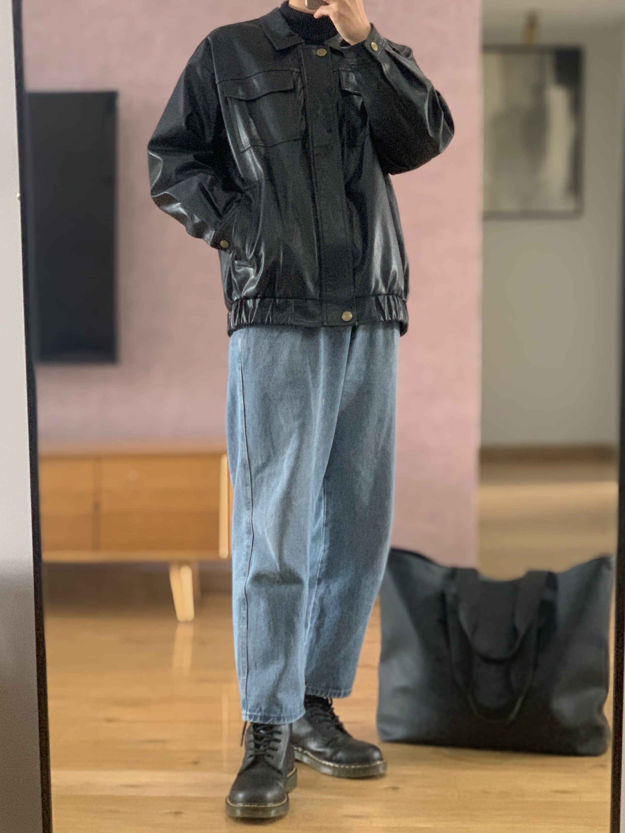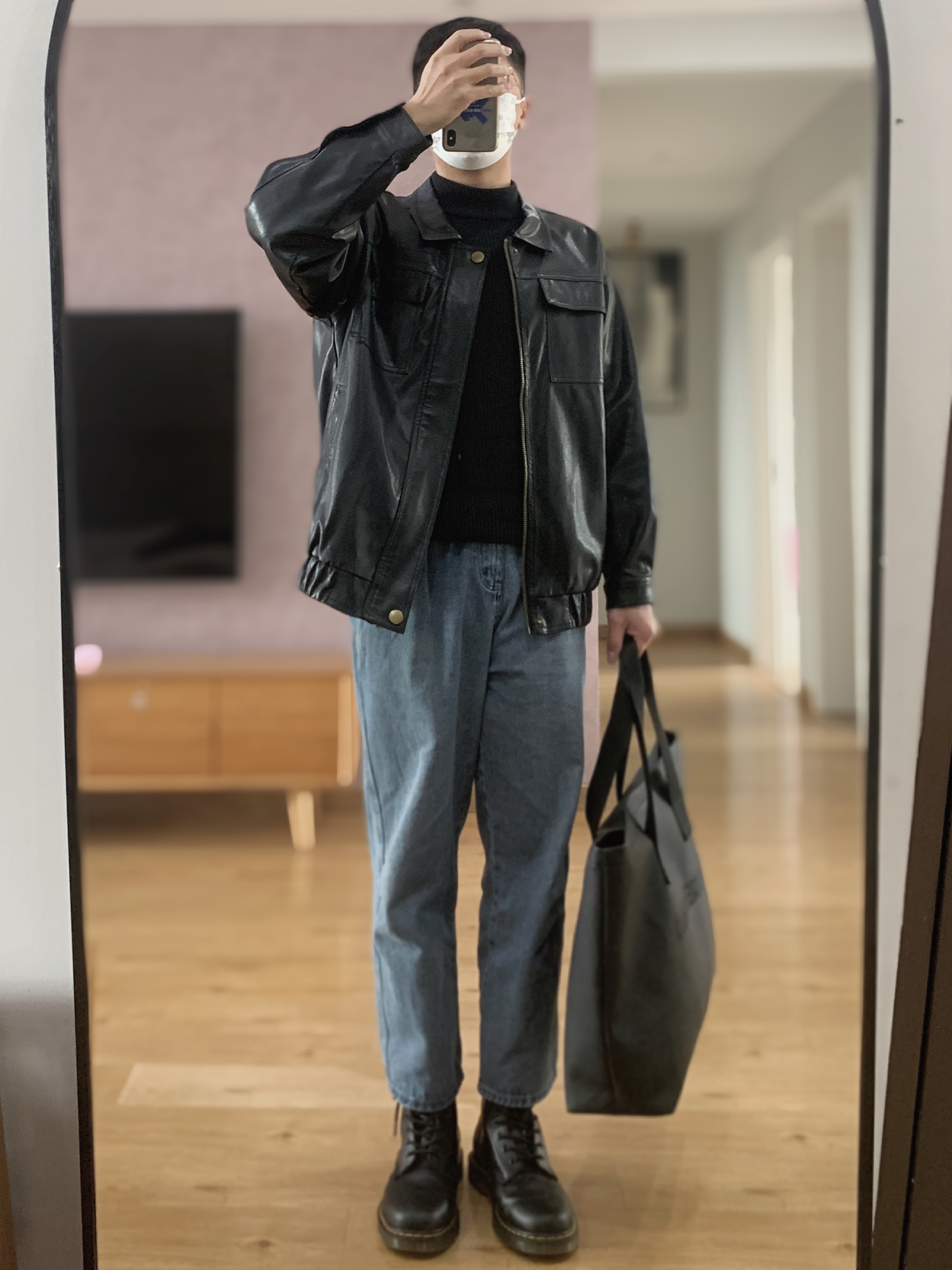 hey 这里是每天记录穿搭的社畜日记。 今天尝试一下皮衣马丁靴的硬汉风格 内搭一件黑色高领毛衣 外套是短款廓形黑色皮衣 下身一条简单利落的牛仔裤 再来一双马丁靴 简简单单的通勤穿搭 每日分享通勤穿搭,欢迎交流指点。 👟:Dr. Martens 1460 8孔马丁靴 Slip Resistant Leather Lace Up 黑色/硬皮smooth
